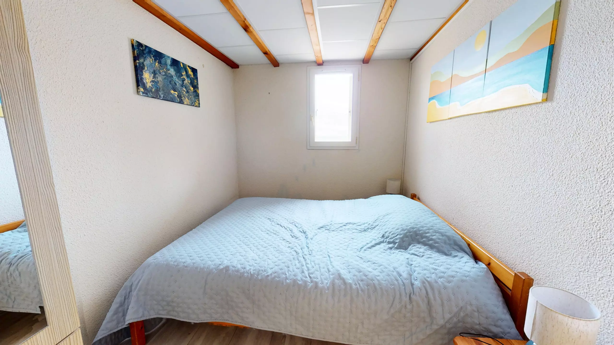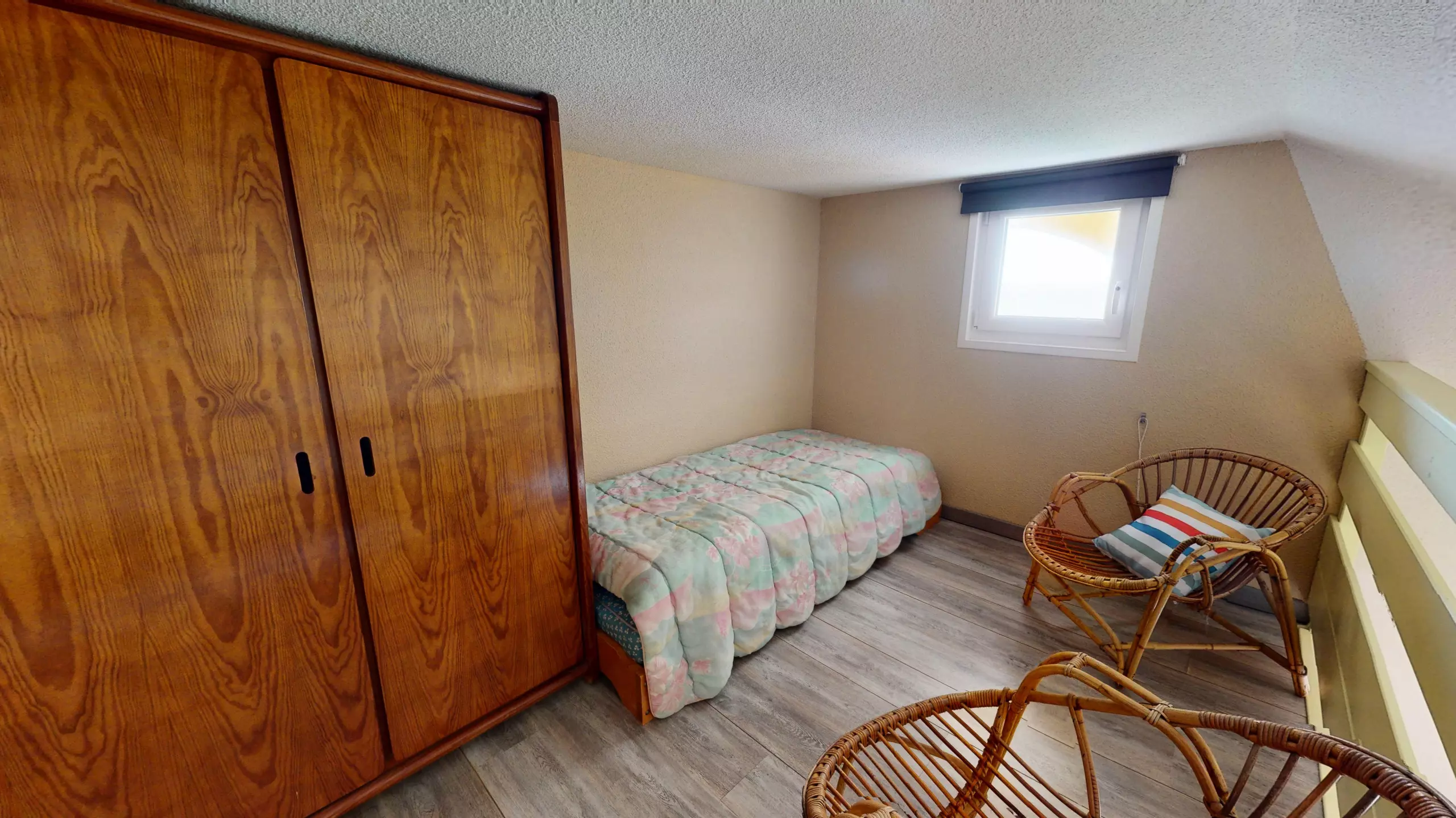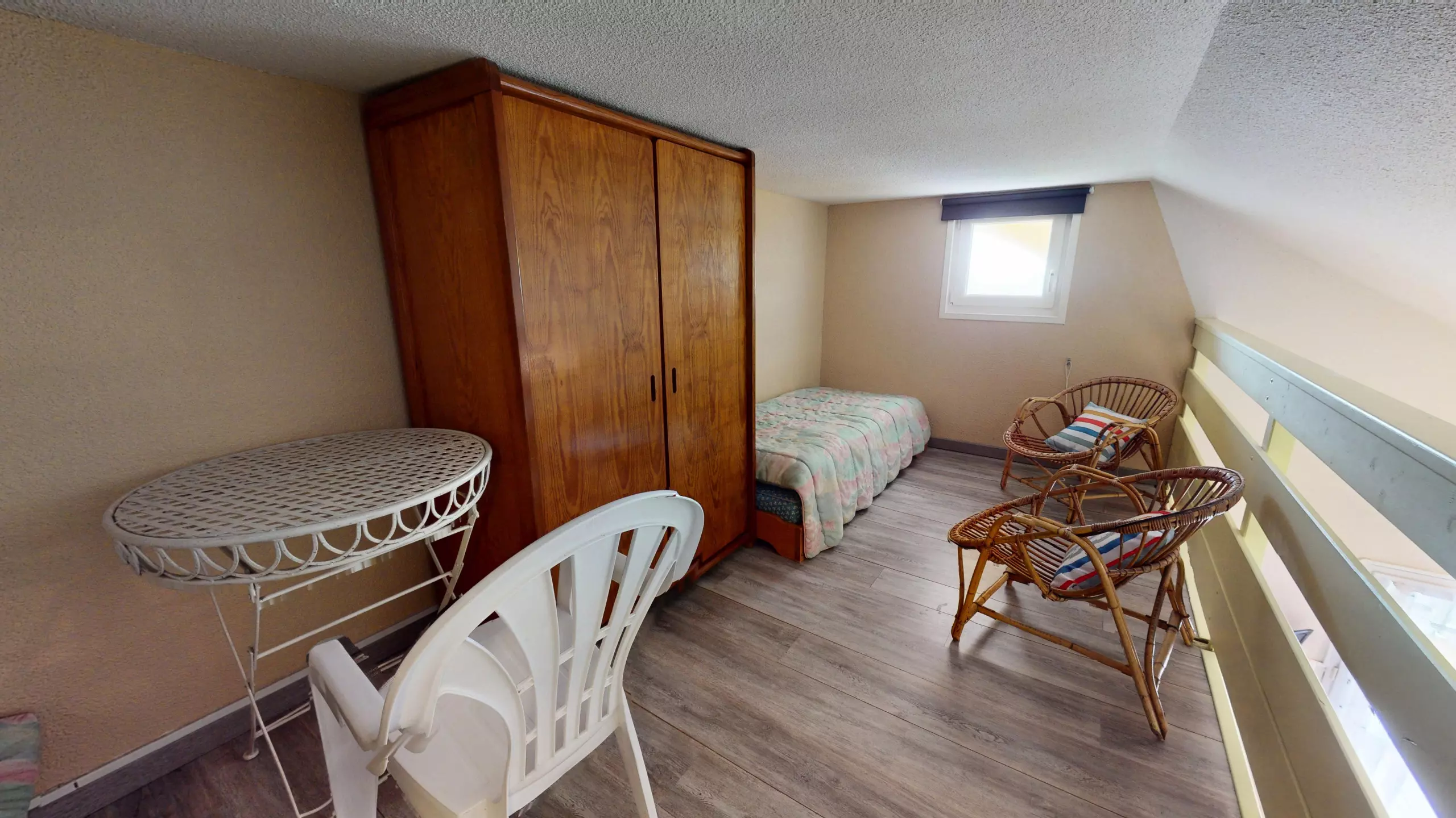 Le Spot de la Corniche offers a clever and welcoming interior. On the level, you'll find a separate bedroom with a double bed (140x190 cm) and an en-suite bathroom with a bathtub, as well as a separate toilet. The living area, where you can already see the sea spray, includes a cozy lounge with a television, a convivial dining table, and a fully equipped open-plan kitchen (gas hob and all necessary cookware). Upstairs, a spacious mezzanine accommodates a second double bed (140x190 cm) and two single beds (90x190 cm), offering great sleeping flexibility.