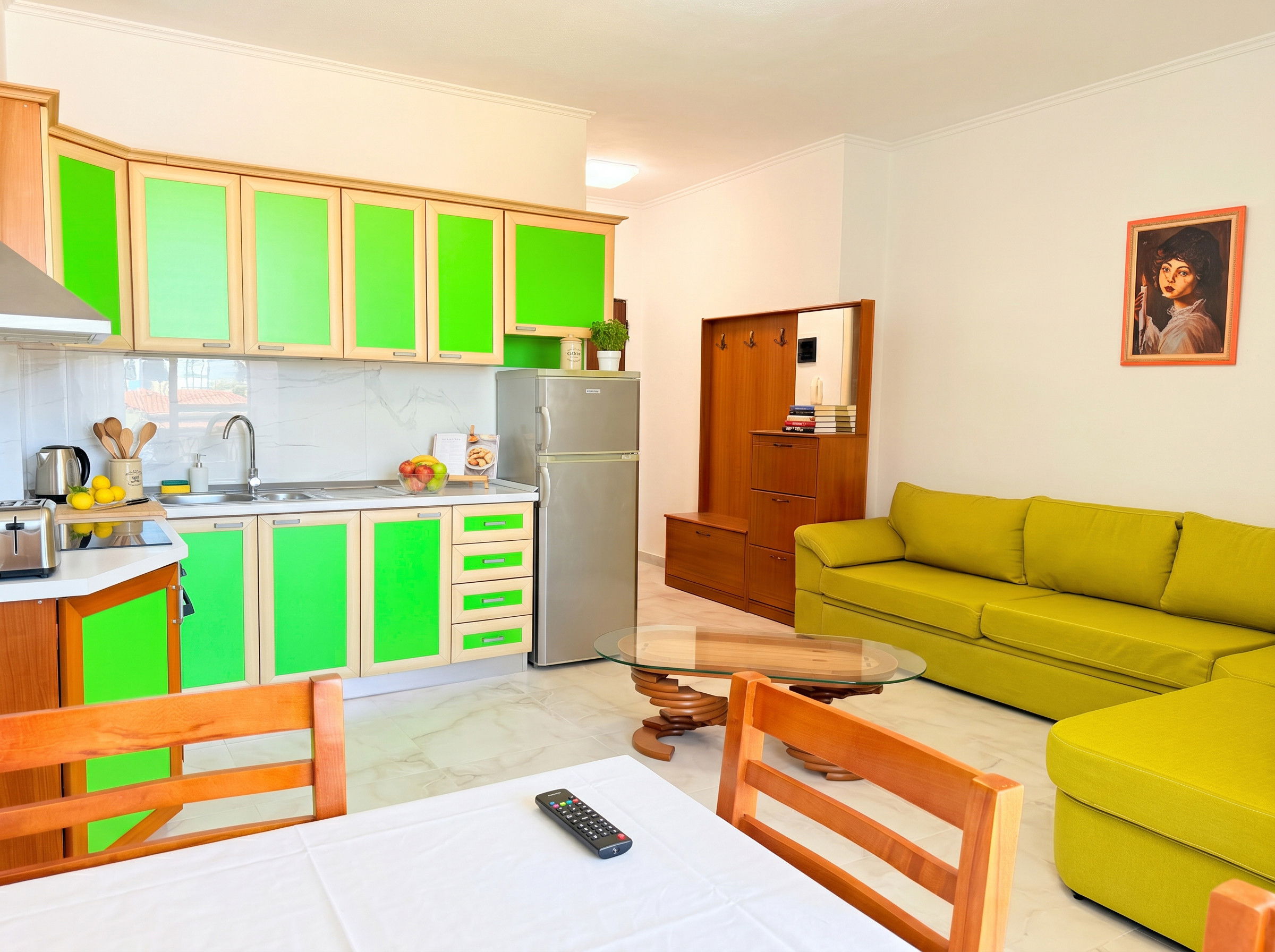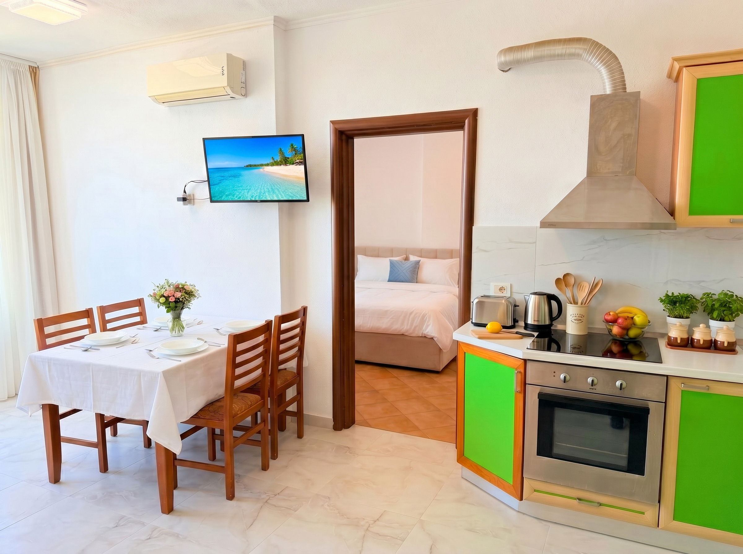 This modern and comfortable 2-bedroom apartment is ideal for families, friends, or small groups of up to 5 guests. The space features a bright open-plan layout combining a fully equipped kitchen, cozy living room, and dining area—perfect for relaxing and spending quality time together. Each room is fitted with air conditioning to keep you cool during warm summer days, and free Wi-Fi is available throughout the apartment.