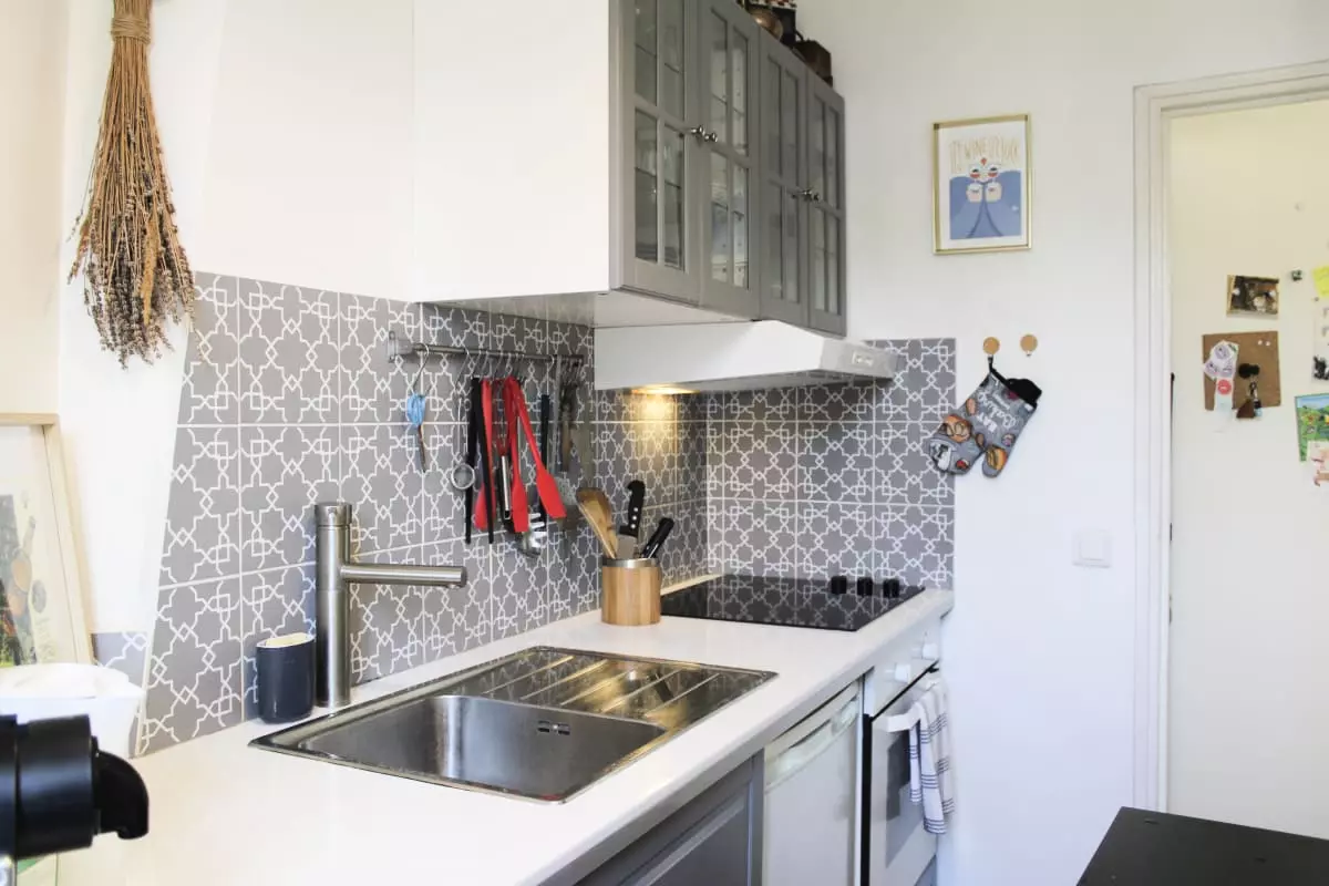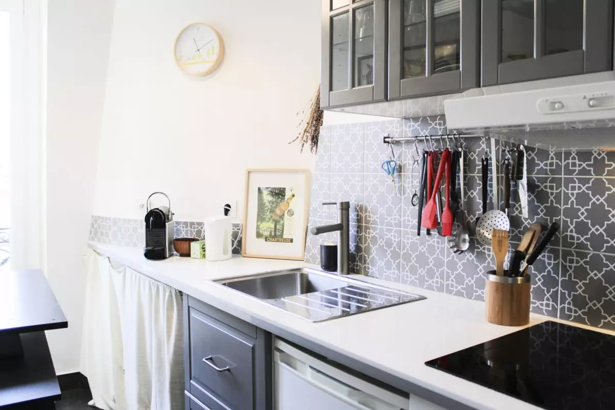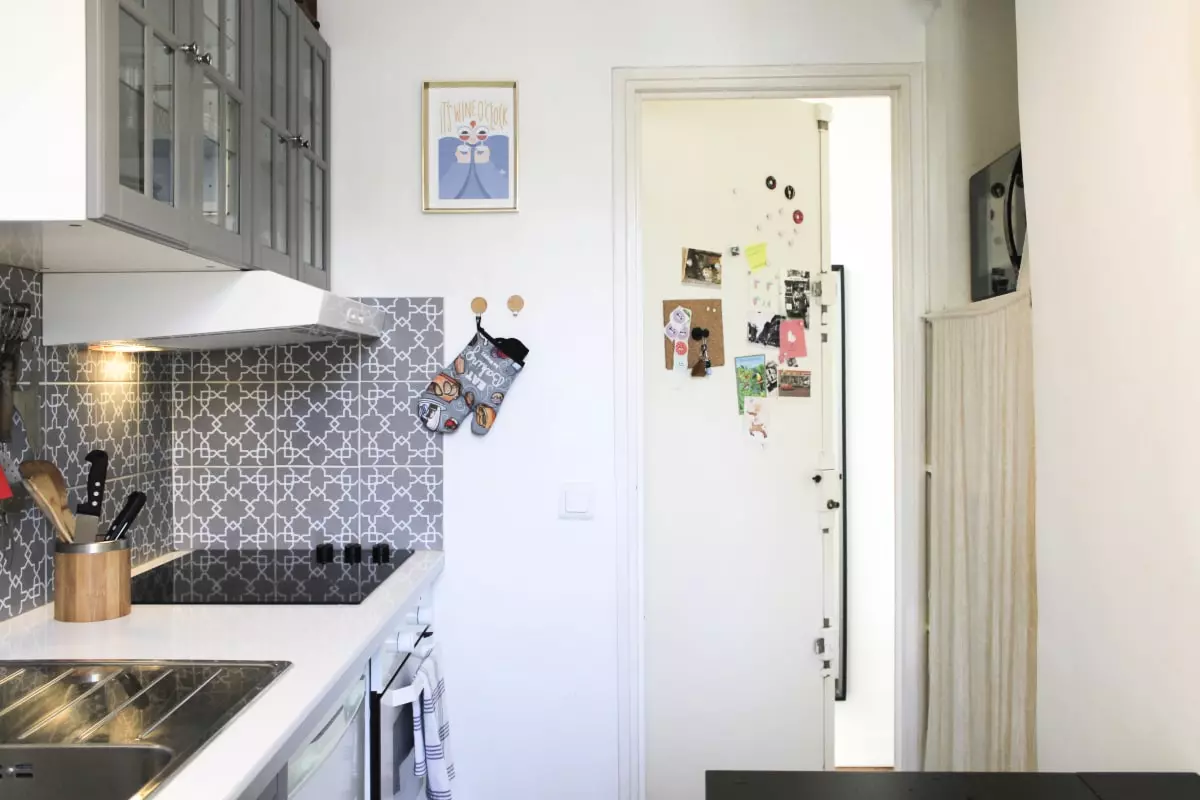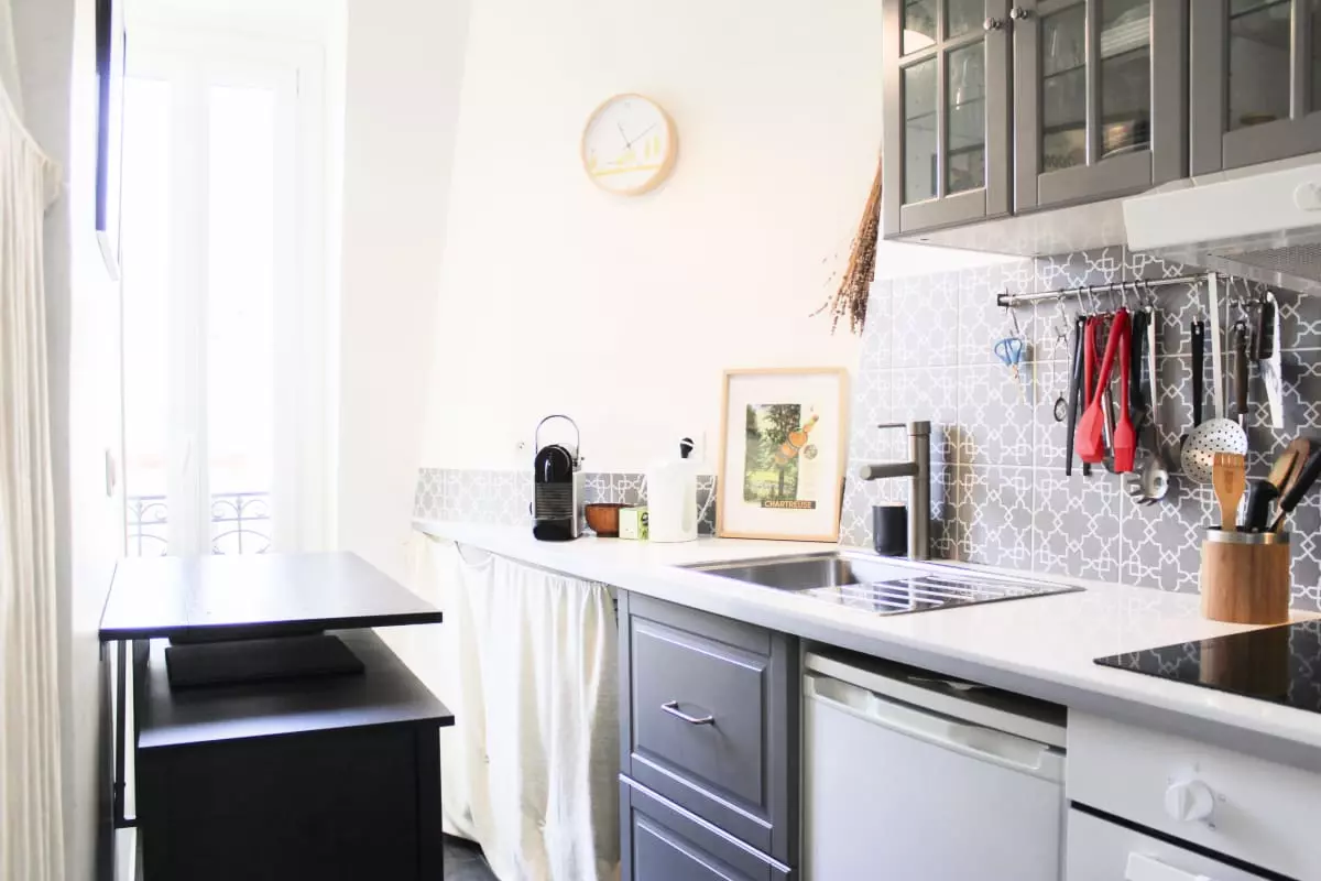 In terms of amenities, this accommodation features a functional bathroom and a fully equipped kitchen for preparing meals, including an oven, microwave, and a classic Nespresso coffee machine. The presence of a washing machine is a real bonus for longer stays.