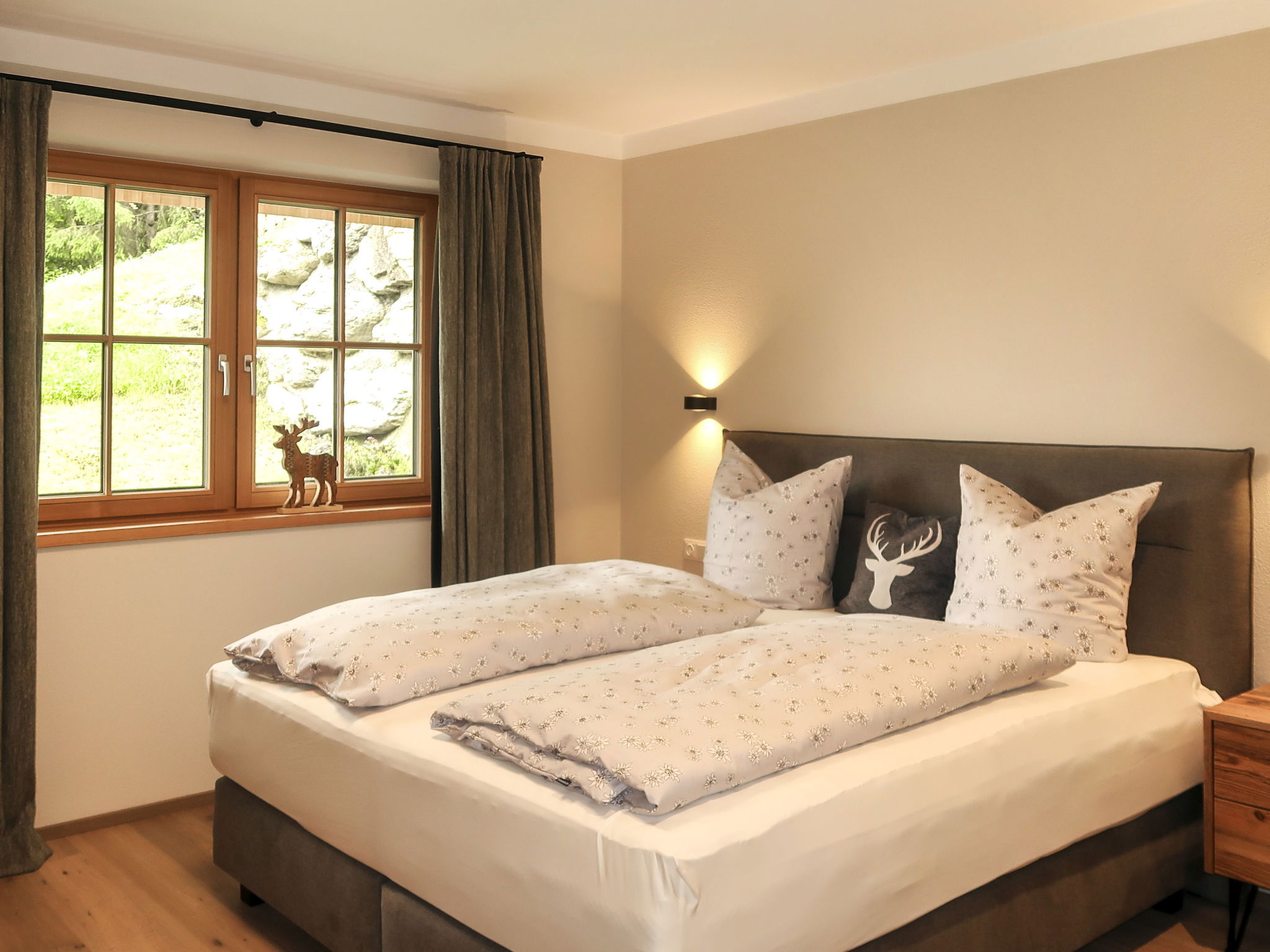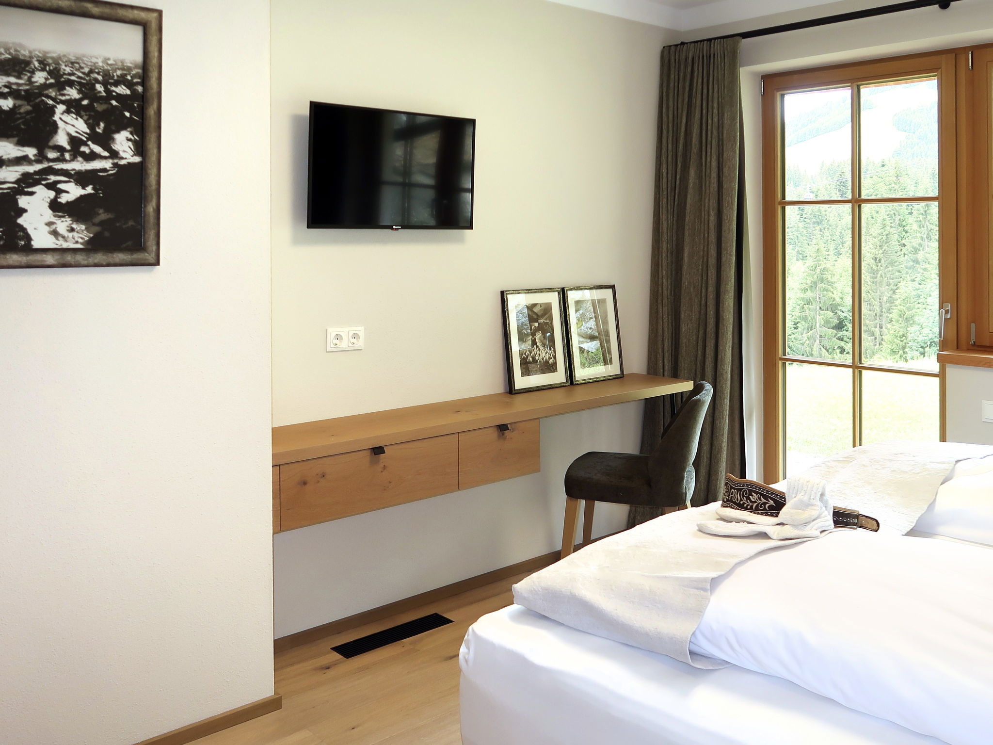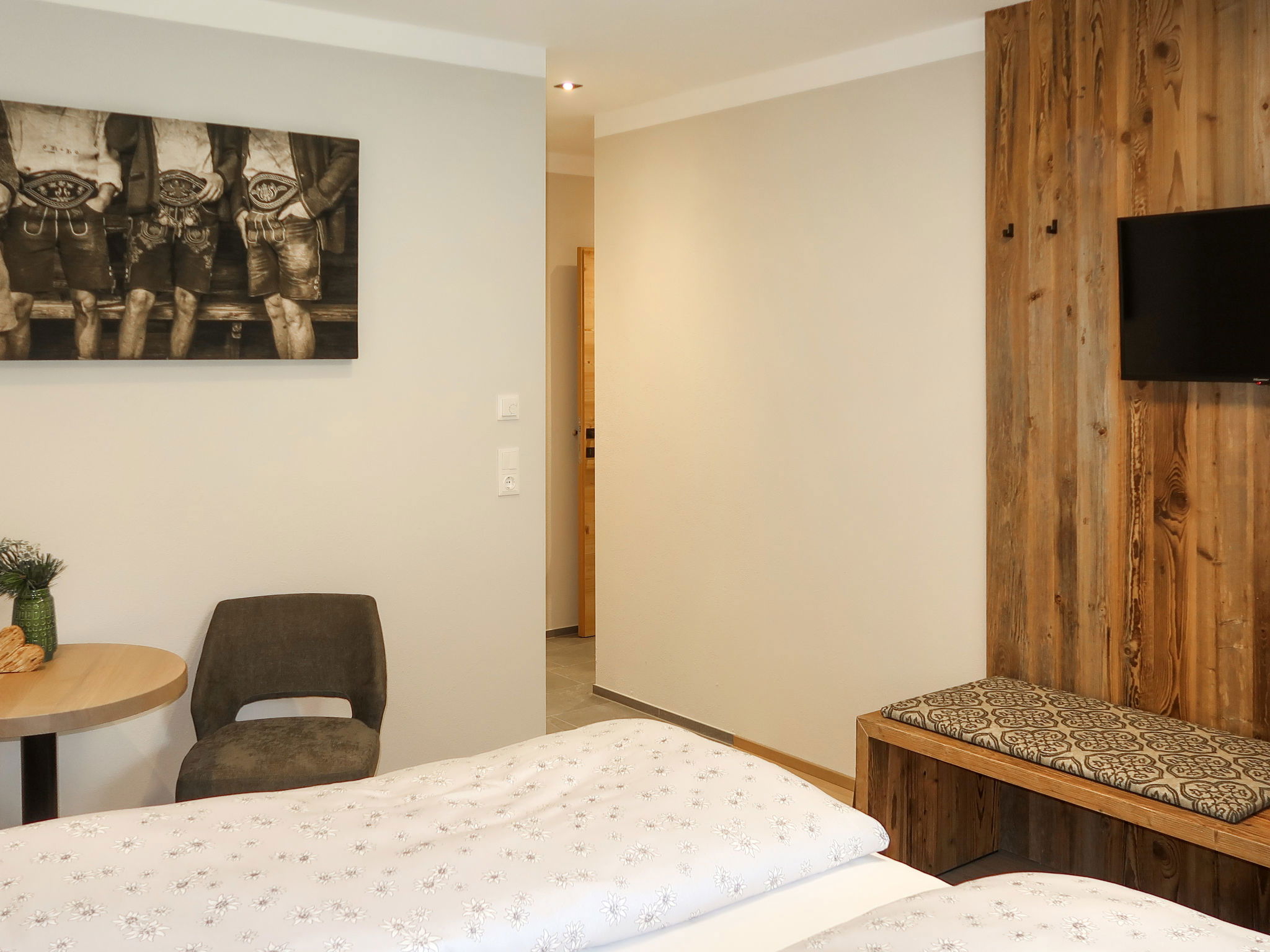 "Chalet Edelweiß", 4-room apartment 90 m2, on the ground floor. Bright, very comfortable and tasteful furnishings: entrance hall. 1 double bedroom with satellite TV. Exit to the terrace. 1 double bedroom with shower/WC and satellite TV. Office with 1 bed and satellite TV. Large kitchen-/living room (oven, dishwasher, 4 ceramic glass hob hotplates, toaster, kettle, electric coffee machine, Capsules for coffee machine (Nespresso)) with dining nook and satellite TV. Exit to the terrace. Shower/WC, sep. WC. Underfloor heating. Wooden floors. Large terrace 18 m2. Terrace furniture, electric barbecue, deck chairs (2), box-room. Marvellous panoramic view of the mountains and the valley. Facilities: children's high chair, baby cot, hair dryer. Internet (WiFi, free). Parking (2 cars). Please note: non-smokers only. Private entrance, fire extinguisher. Ideal accommodation for home office activities or for a "Workation" - thanks to the extra powerful business WLAN.