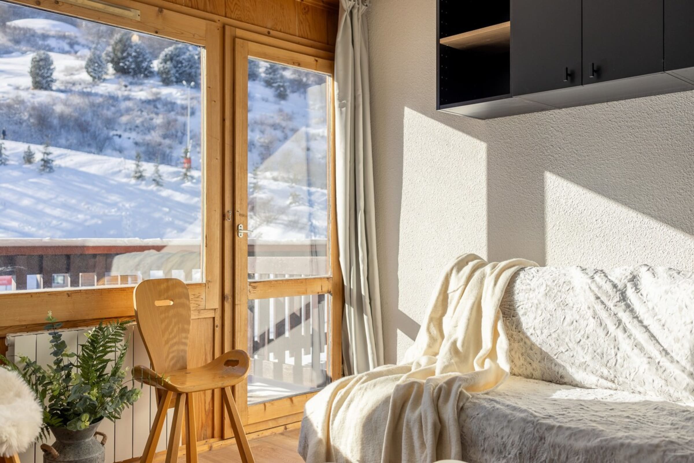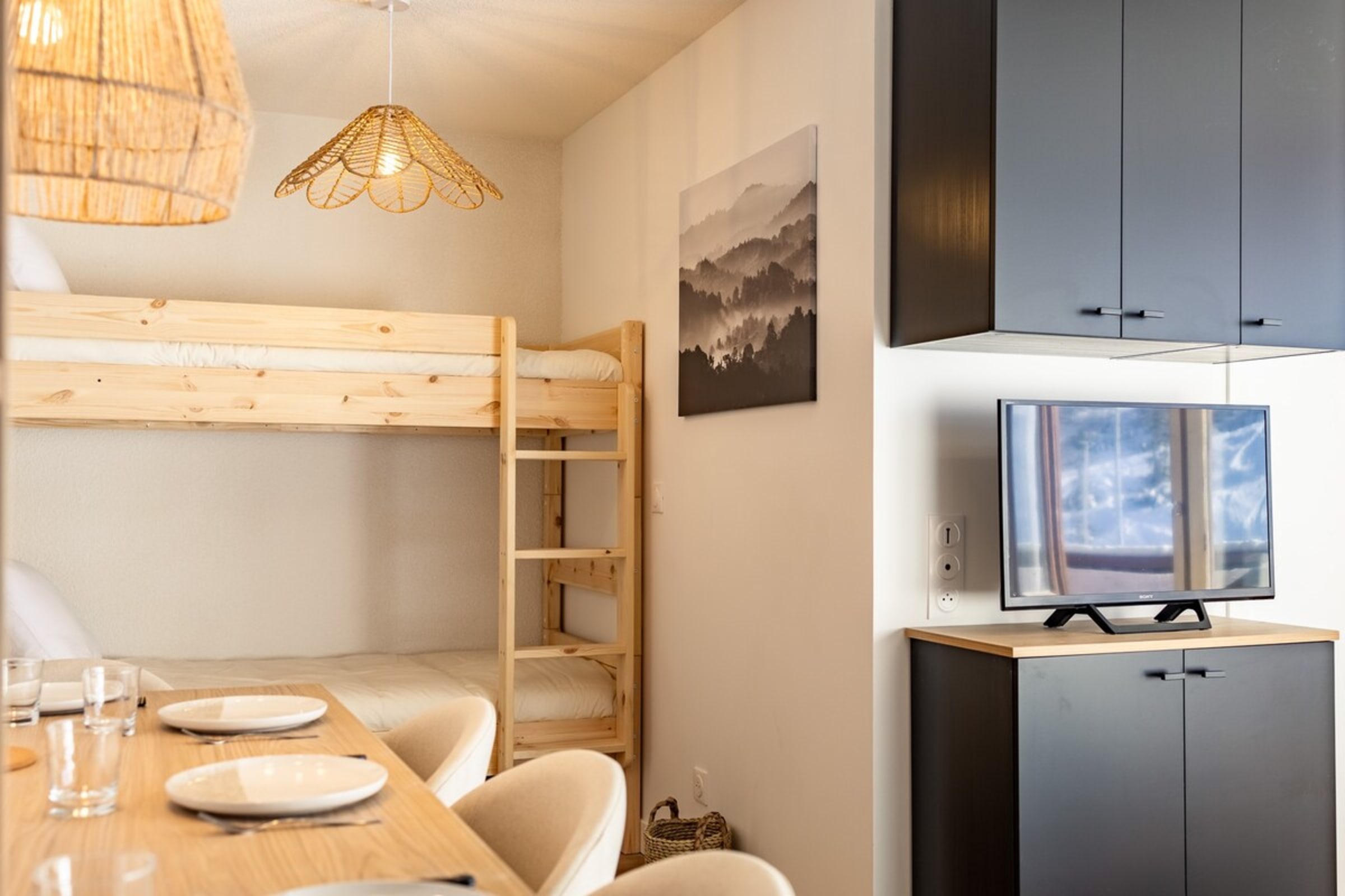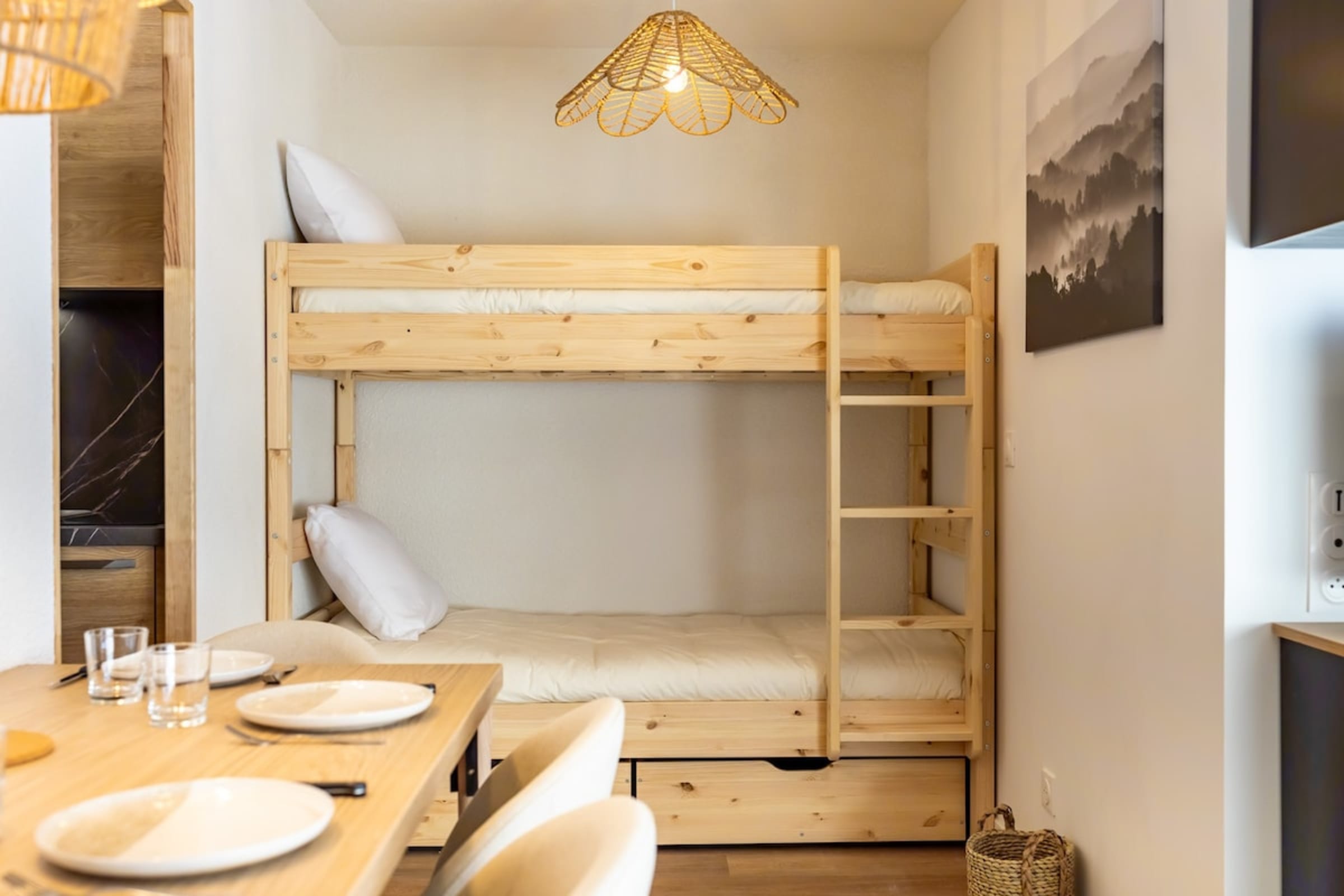 This 45m² apartment is located in the Hameau area of Méribel-Mottaret, ideal for 4 people. It includes a master bedroom with a view of the slopes, a sleeping nook with bunk beds (two single beds), a comfortable living room, and a newly equipped kitchen. The modern bathroom has an Italian shower. The balcony offers breathtaking views of the slopes, perfect for enjoying the fresh mountain air. A ski locker completes this cozy and practical space, situated right at the foot of the lifts.