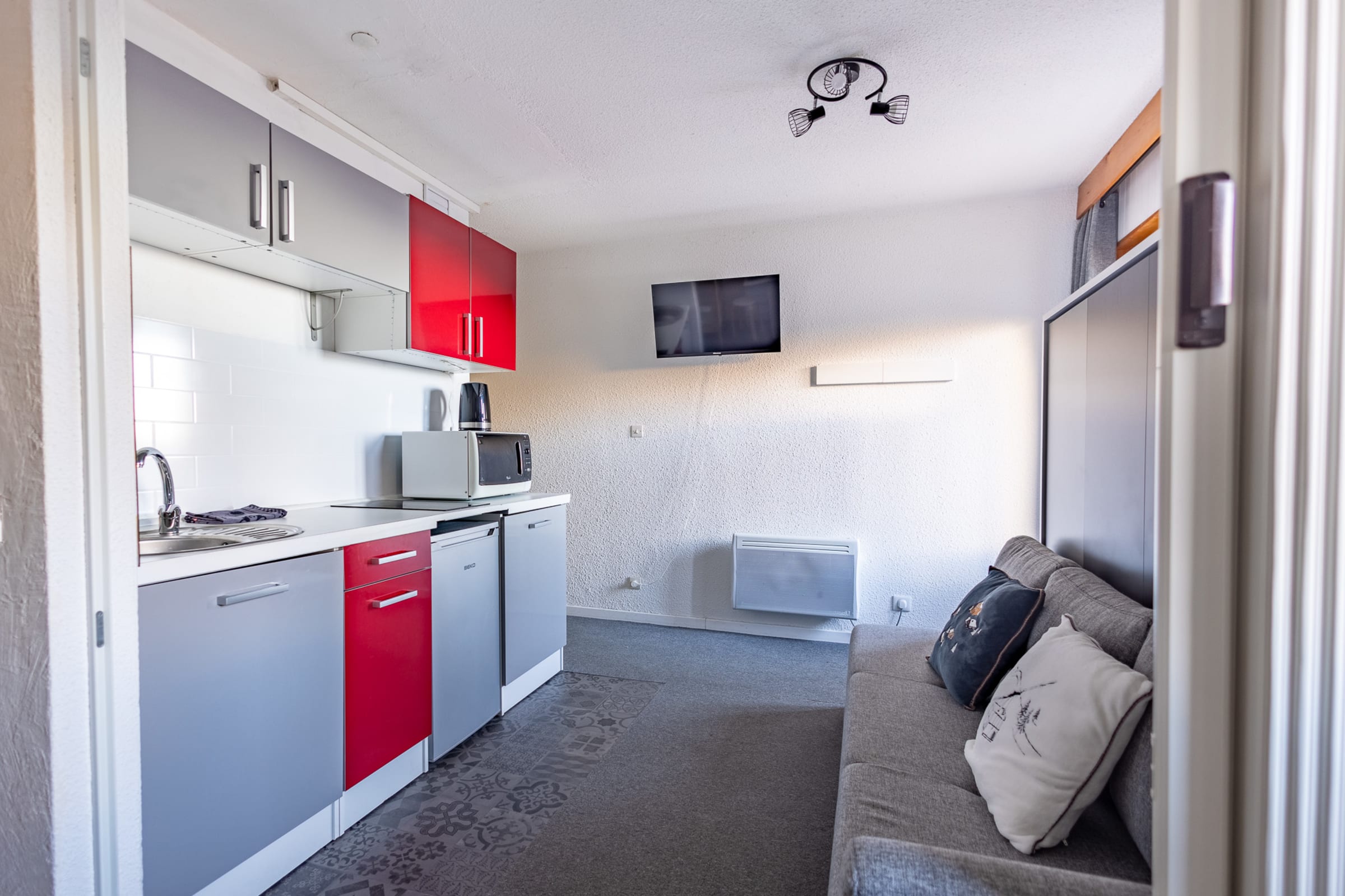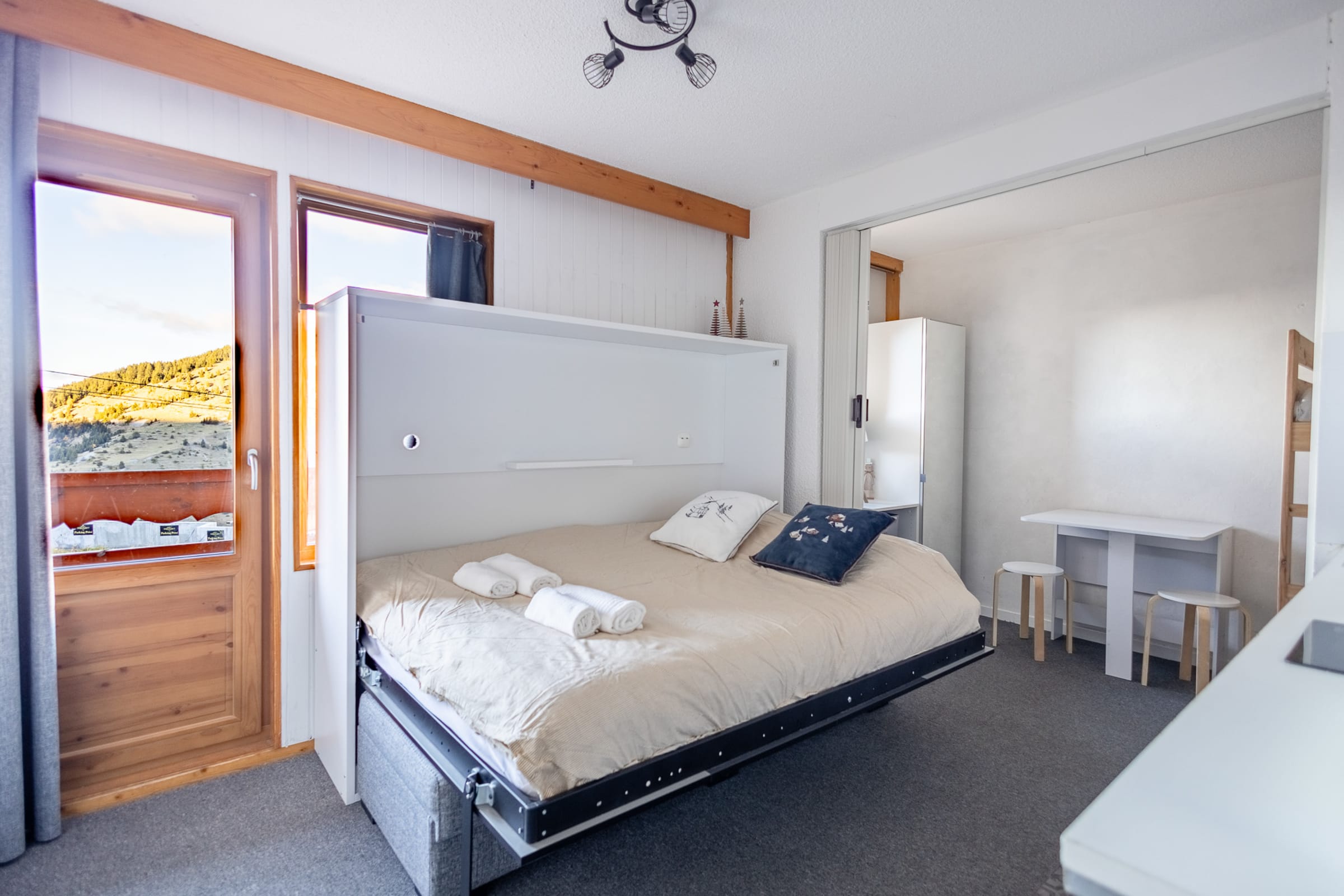 Guests have full access to the studio, the ski locker (ground floor) and the private parking space. Ski-in/ski-out access: the Chalet gondola is opposite and the Perdrix slope runs nearby.