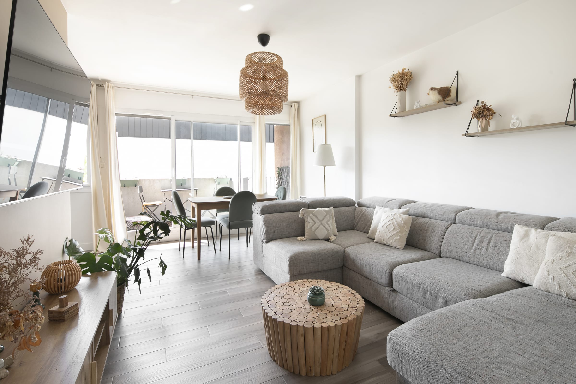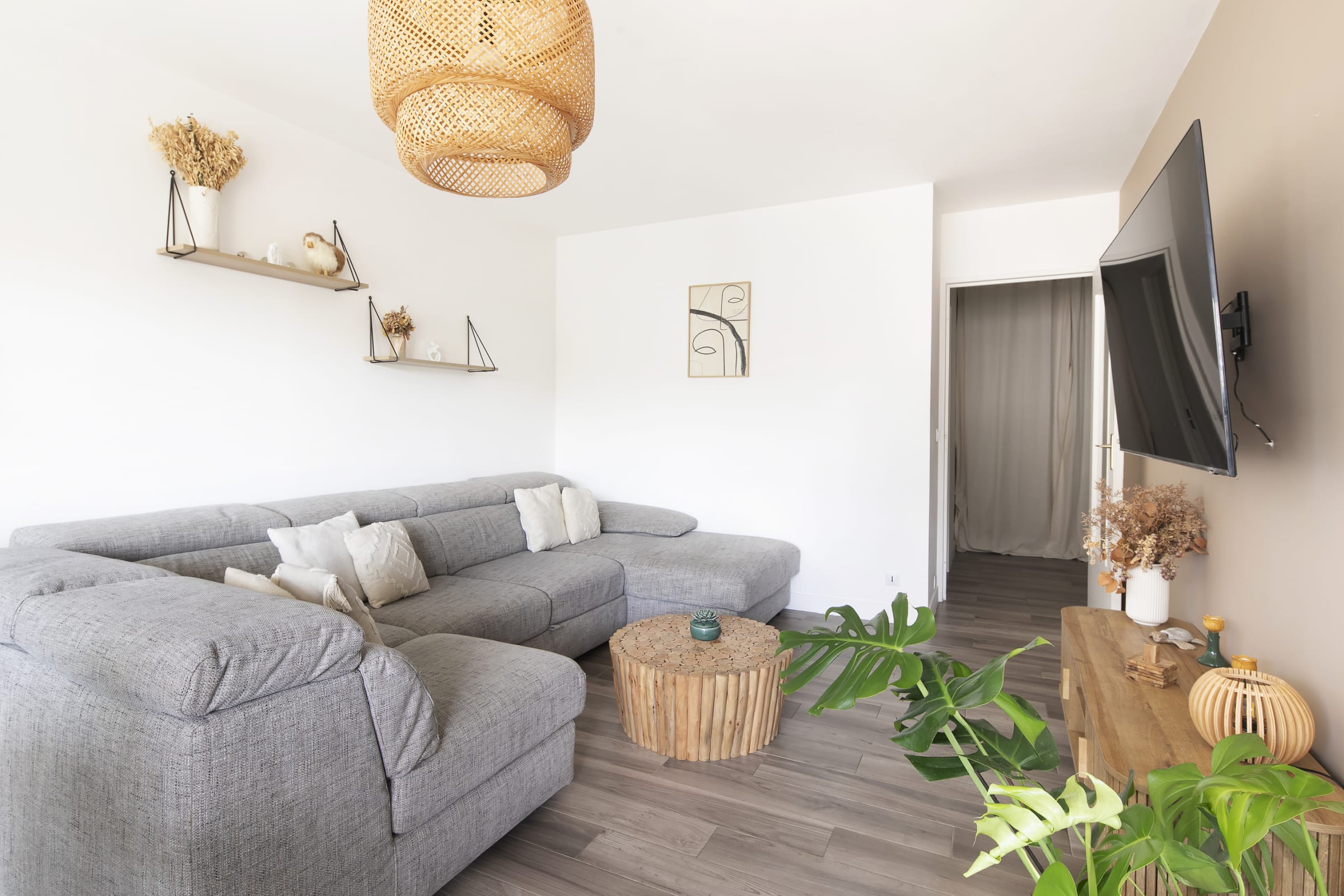 Located on the 3rd floor with lift access in a peaceful residence in Noisy-le-Grand, this 85m² apartment has been entirely designed and decorated with care. Generous natural light, warm materials, sand tones, rattan and solid wood , the atmosphere is that of an elegant interior where you feel at home from the very moment.