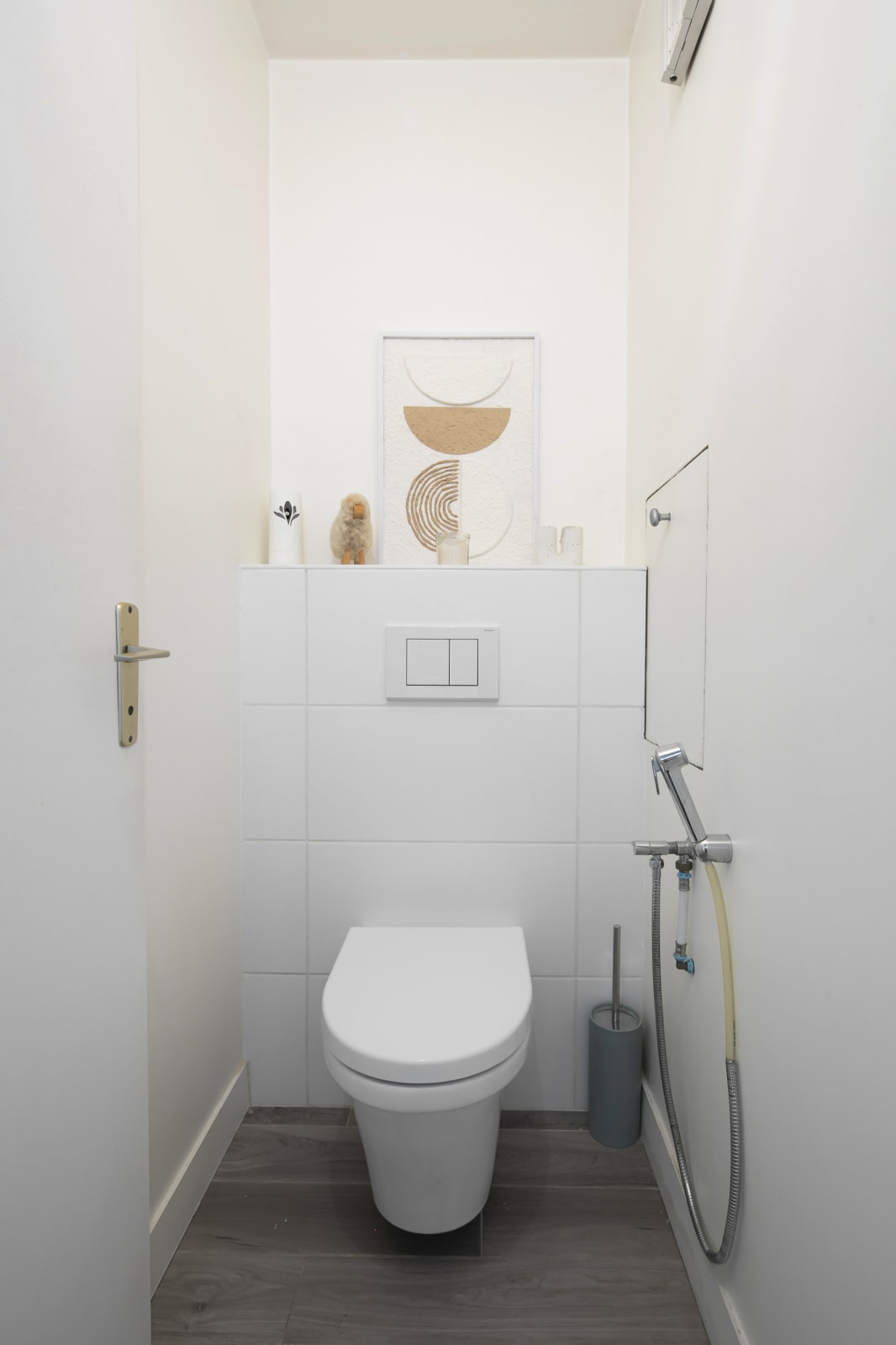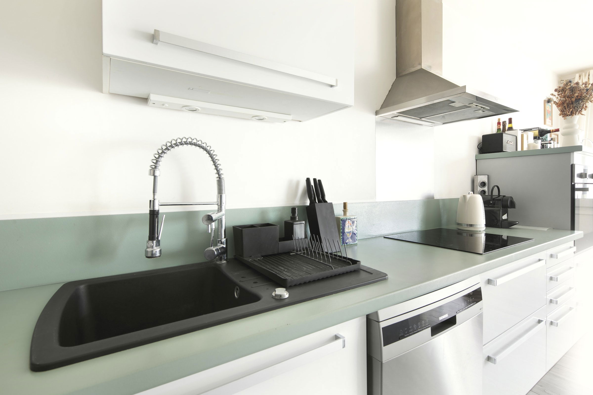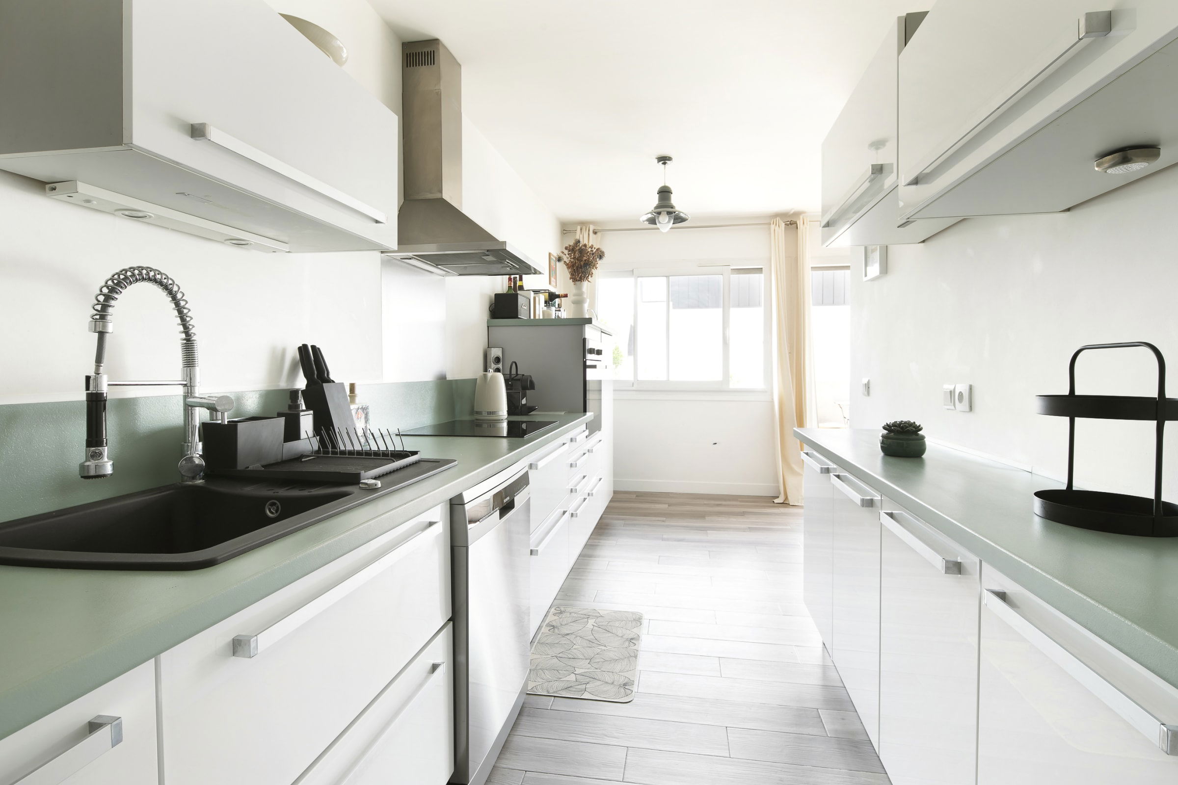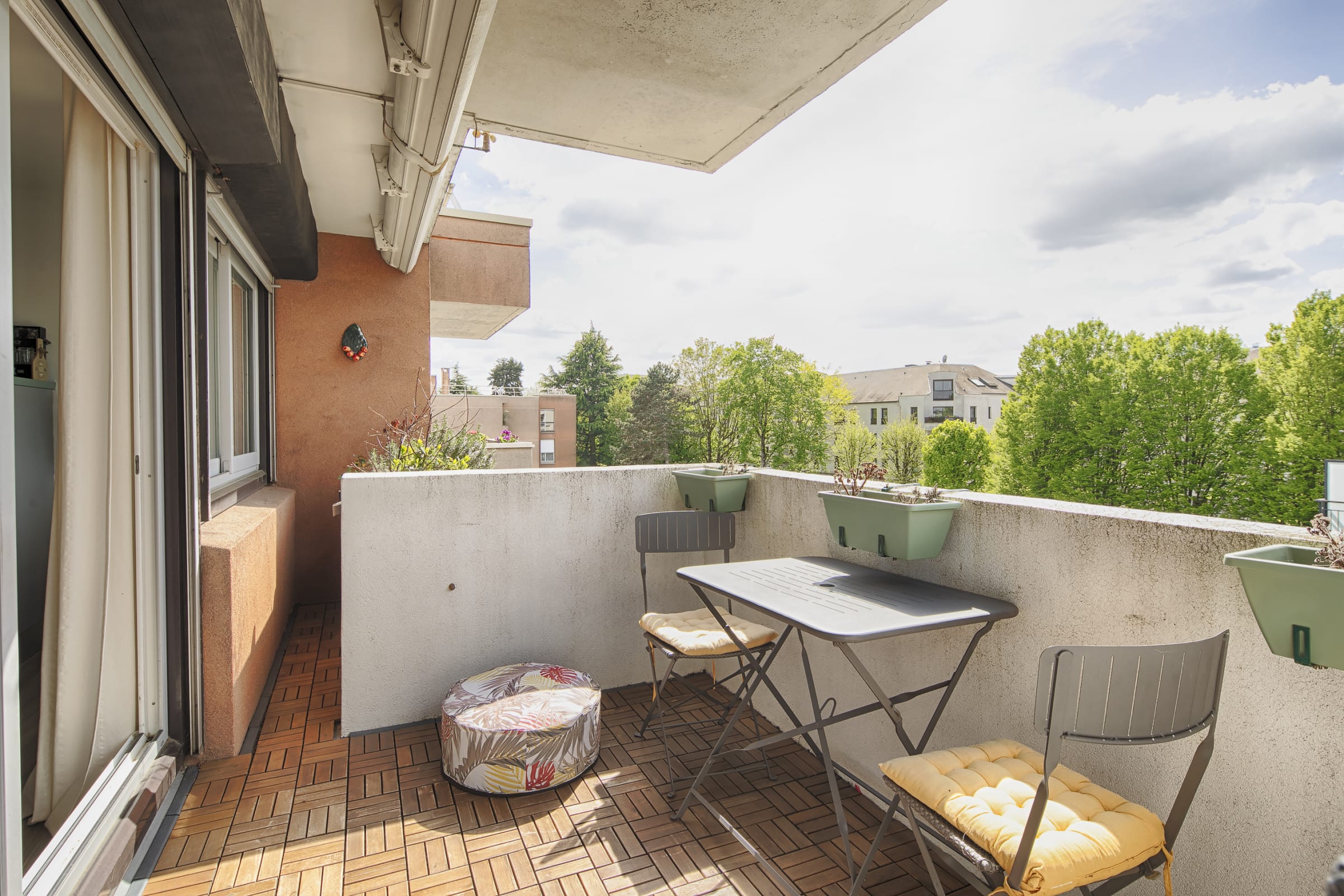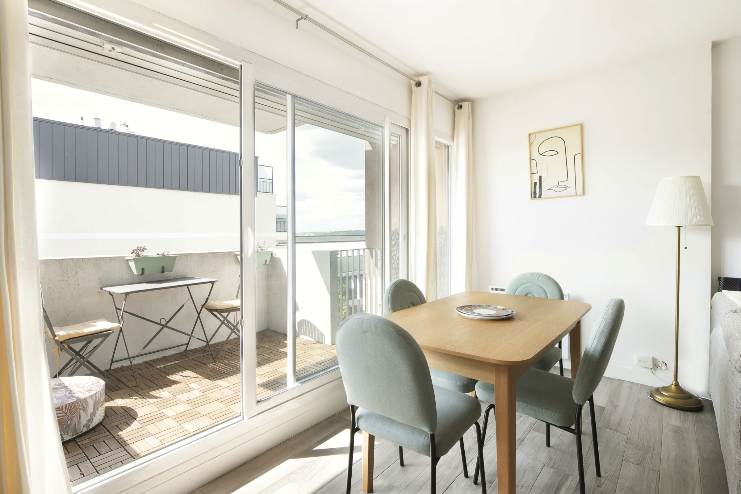 The living room is large, bright and enveloping. The deep corner sofa in grey woven fabric converts into a comfortable bed for two guests. The light oak table, sage green velvet chairs and beautiful rattan pendant light complete a space that is as beautiful as it is functional. The large sliding doors open directly onto your private balcony, wooden deck, bistro table, and an open view over the rooftops and greenery. A morning coffee, an evening drink : once you discover this balcony, you won't want to leave it.