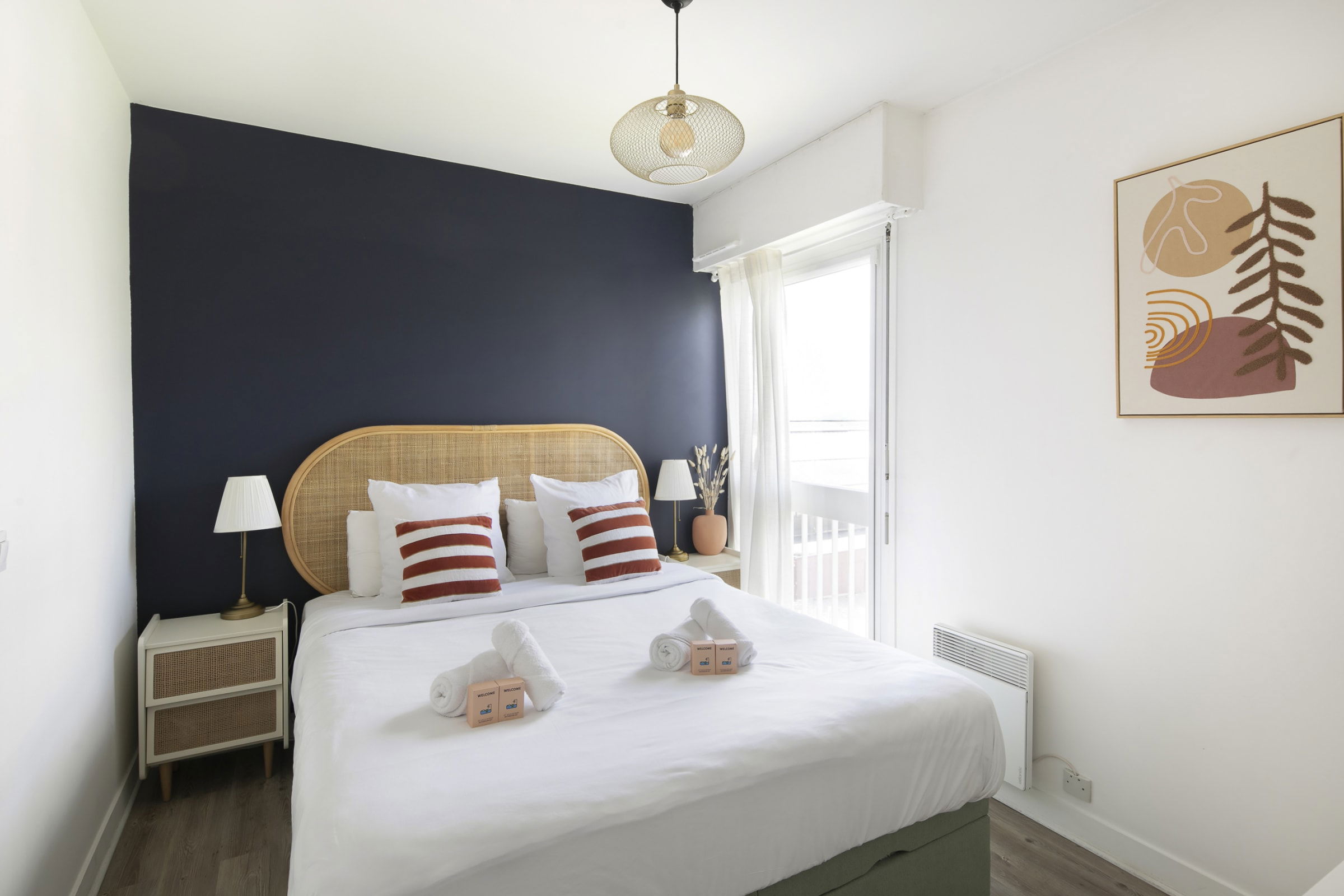 The double bedroom is a true sanctuary. Navy blue accent wall, natural rattan headboard, crisp white hotel-grade linen, golden bedside lamps and framed artwork. Everything has been carefully curated so you can sleep deeply and wake up truly rested.