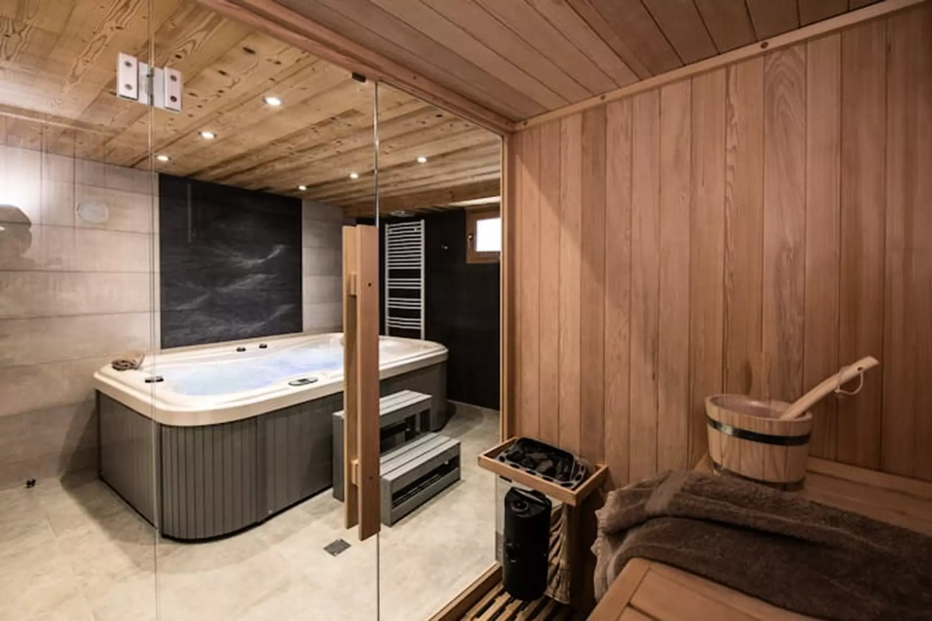 - A relaxation area with jacuzzi, sauna, shower and toilet
