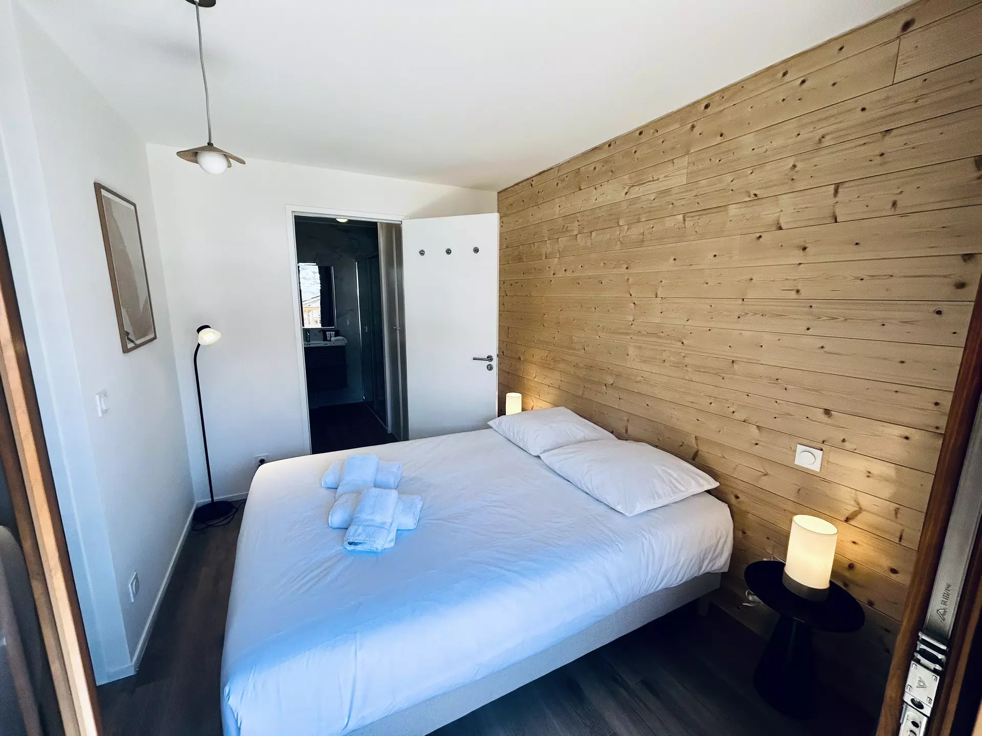 A bedroom with a 160cm double bed and its adjoining bathroom