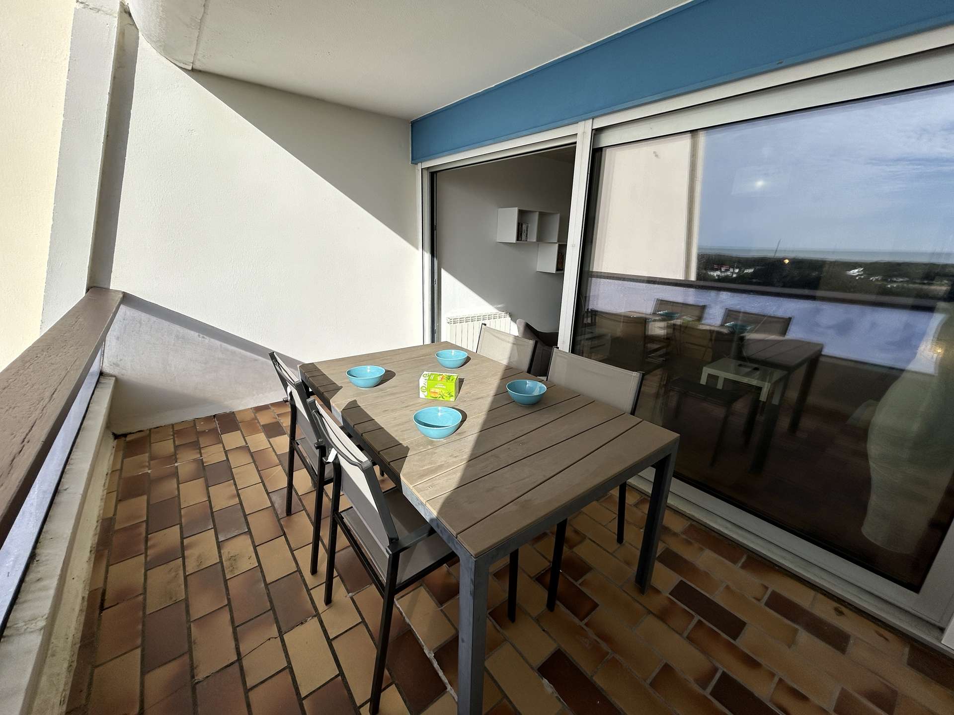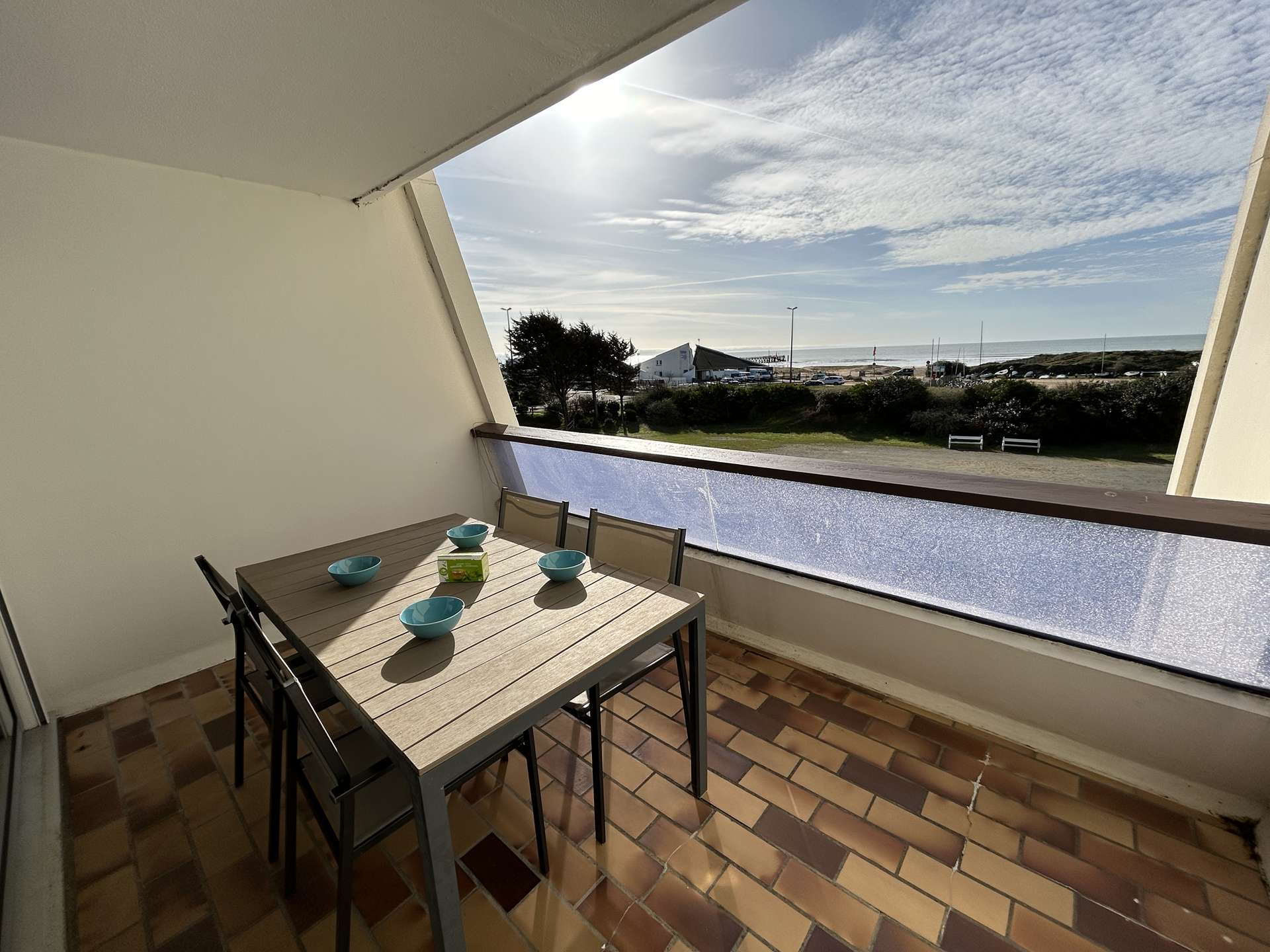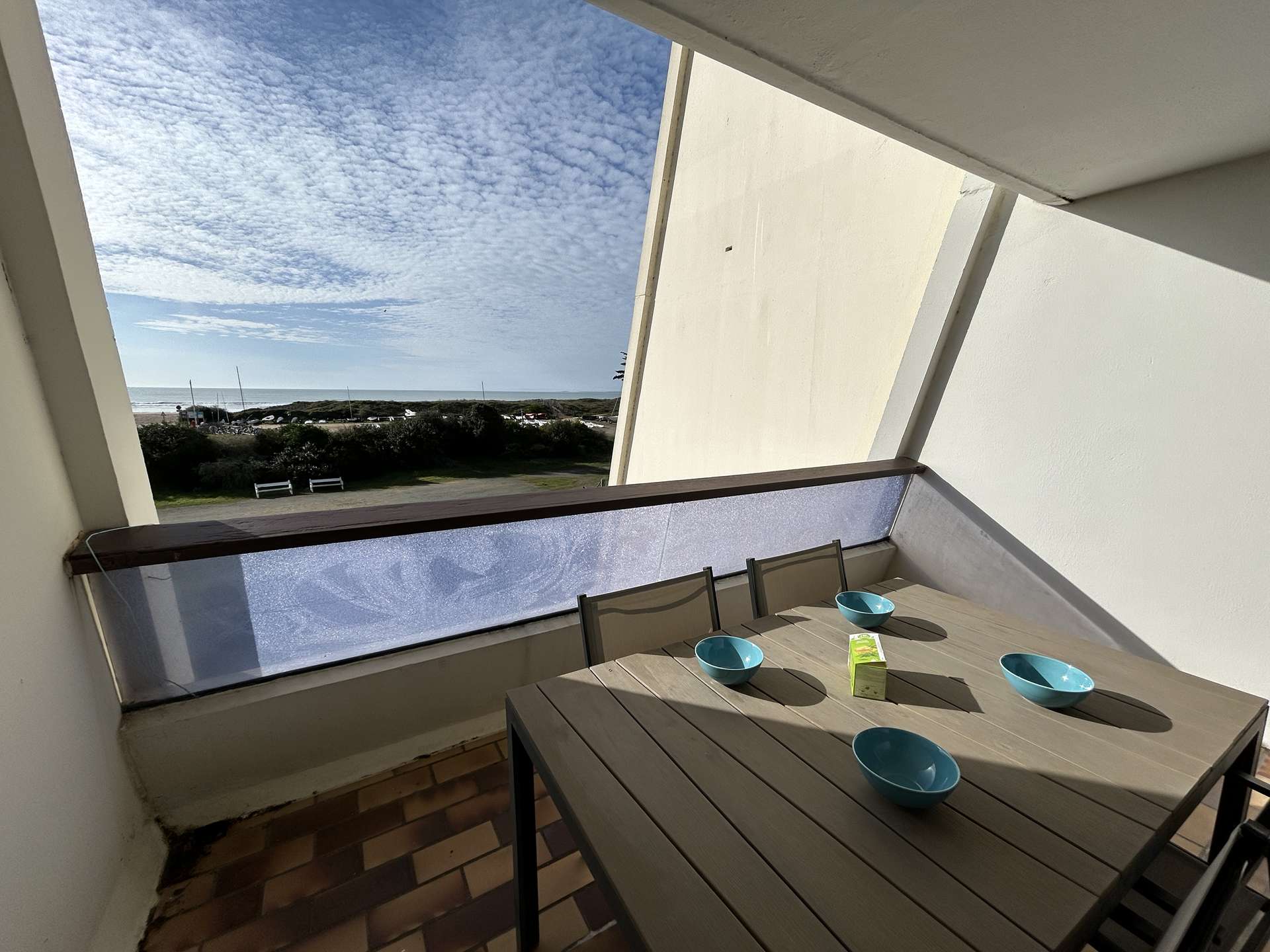 The highlights of this seaside rental: a spacious balcony with garden furniture and a parasol, breathtaking sea views, and a private, secure parking space. No cars drive in front of the residence, as the street is reserved for pedestrians.