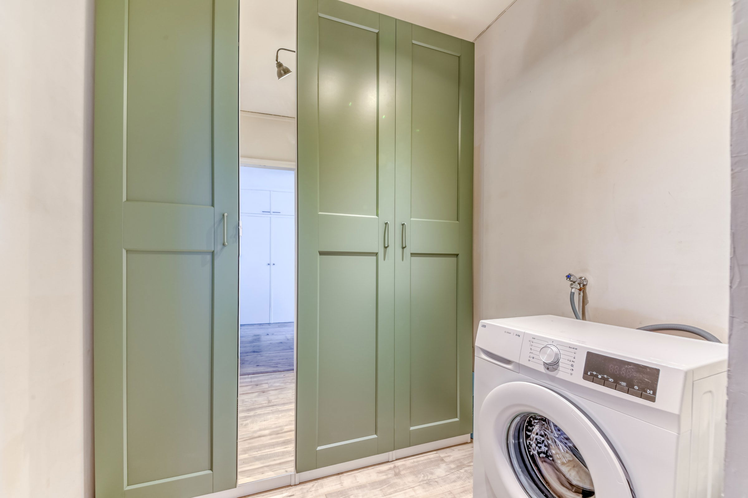 The apartment also features a secure garage, a bike storage room, and benefits from the presence of a caretaker on-site.