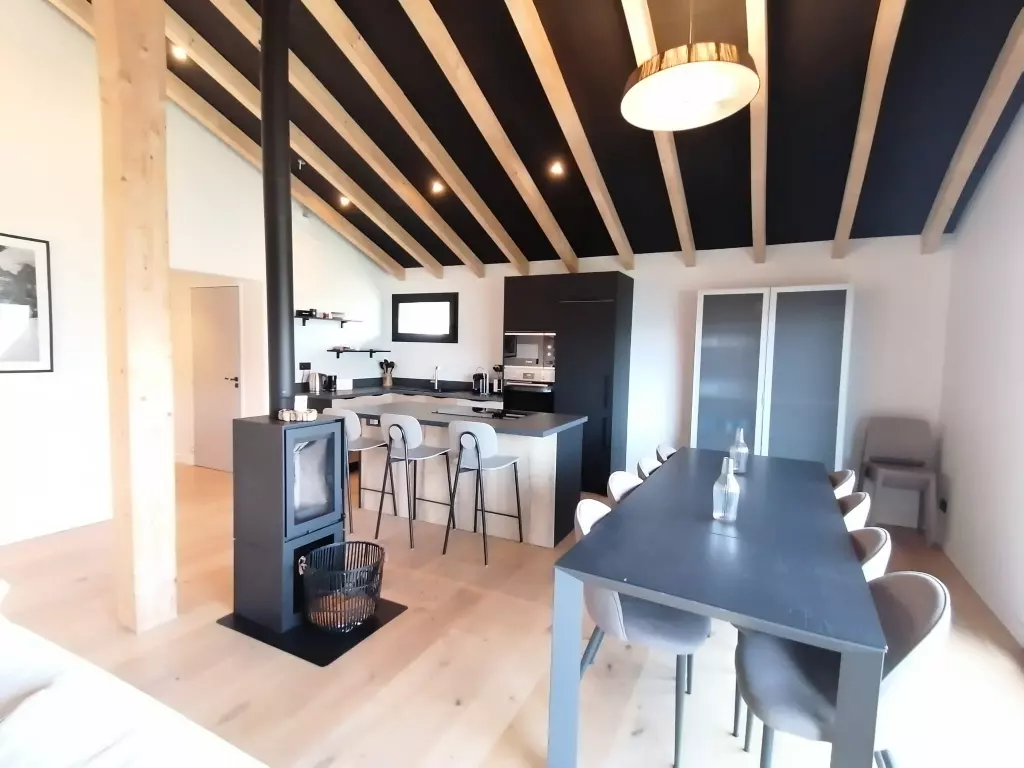and opens onto a warm living room with a wood-burning stove for convivial moments