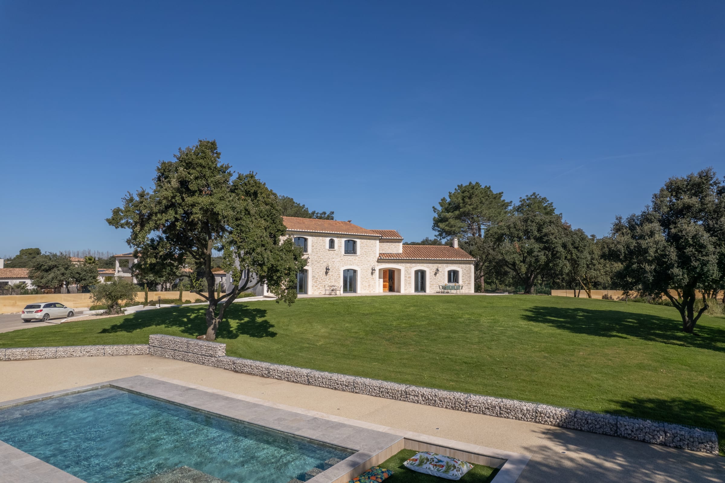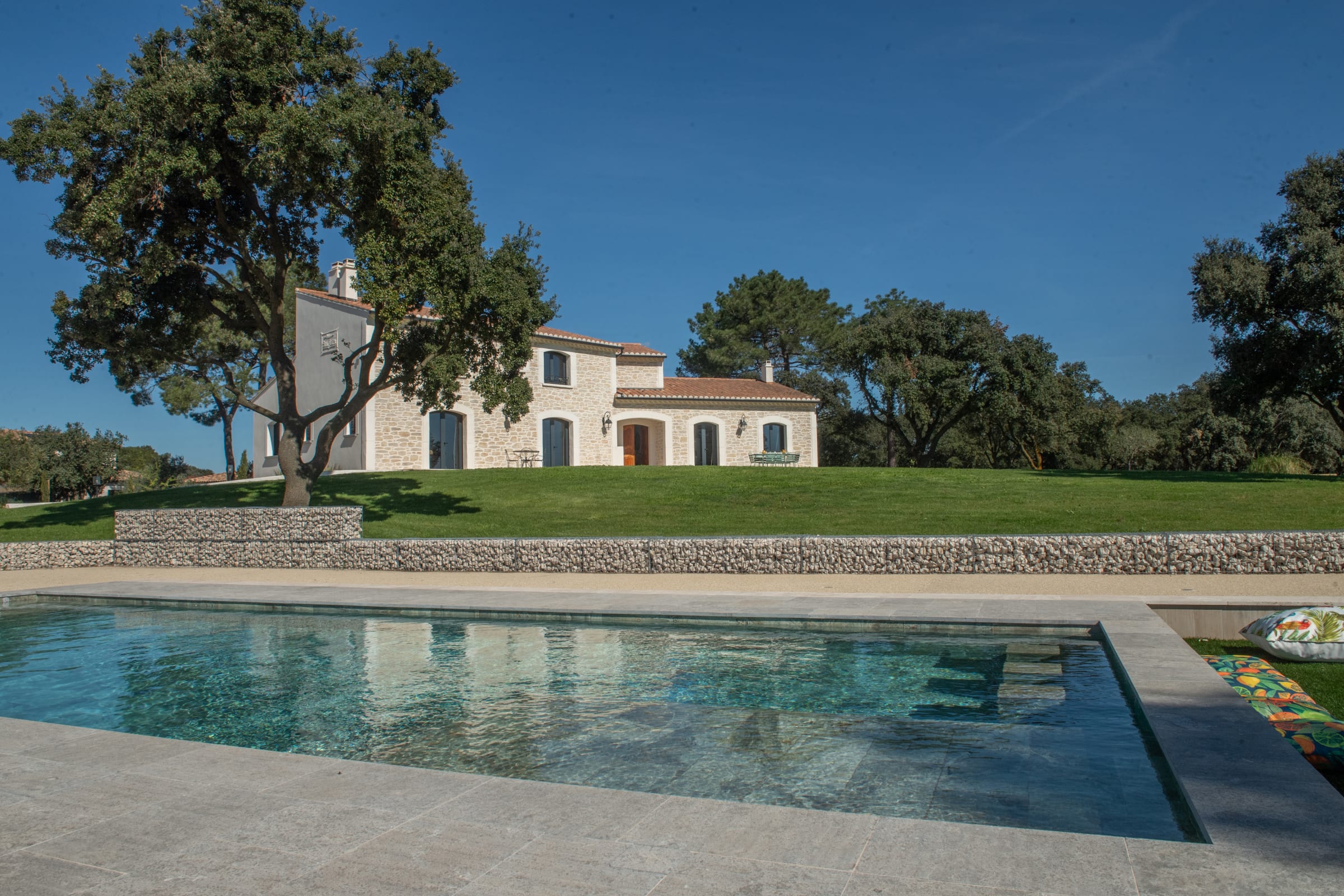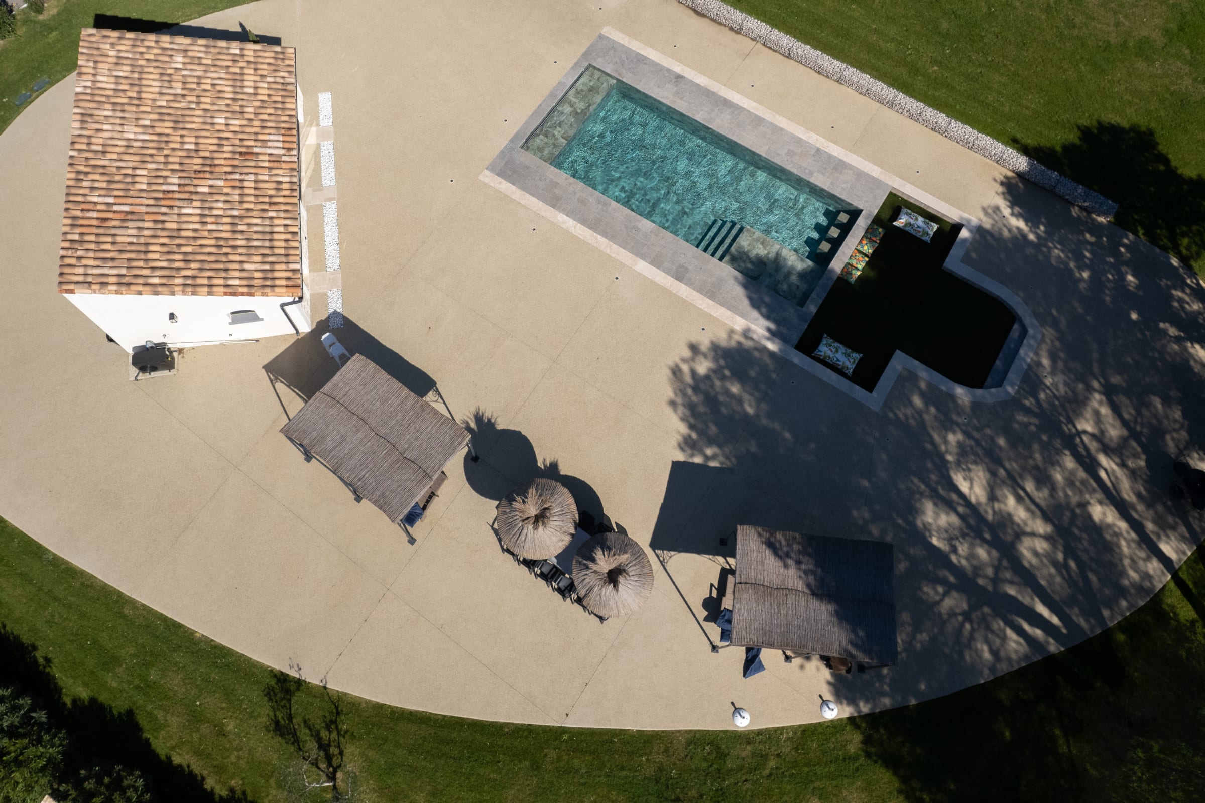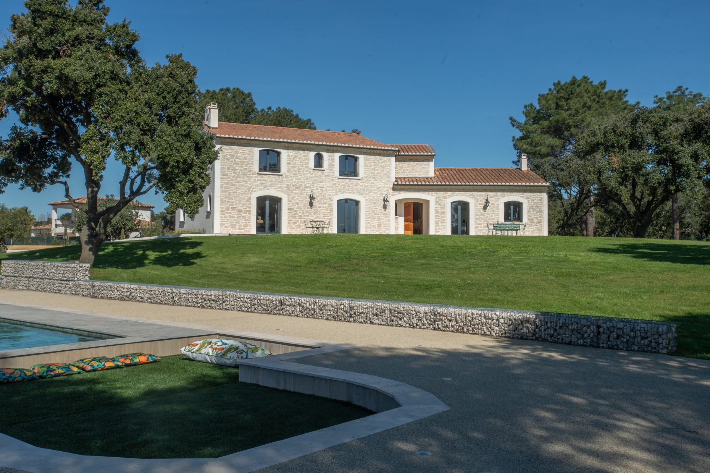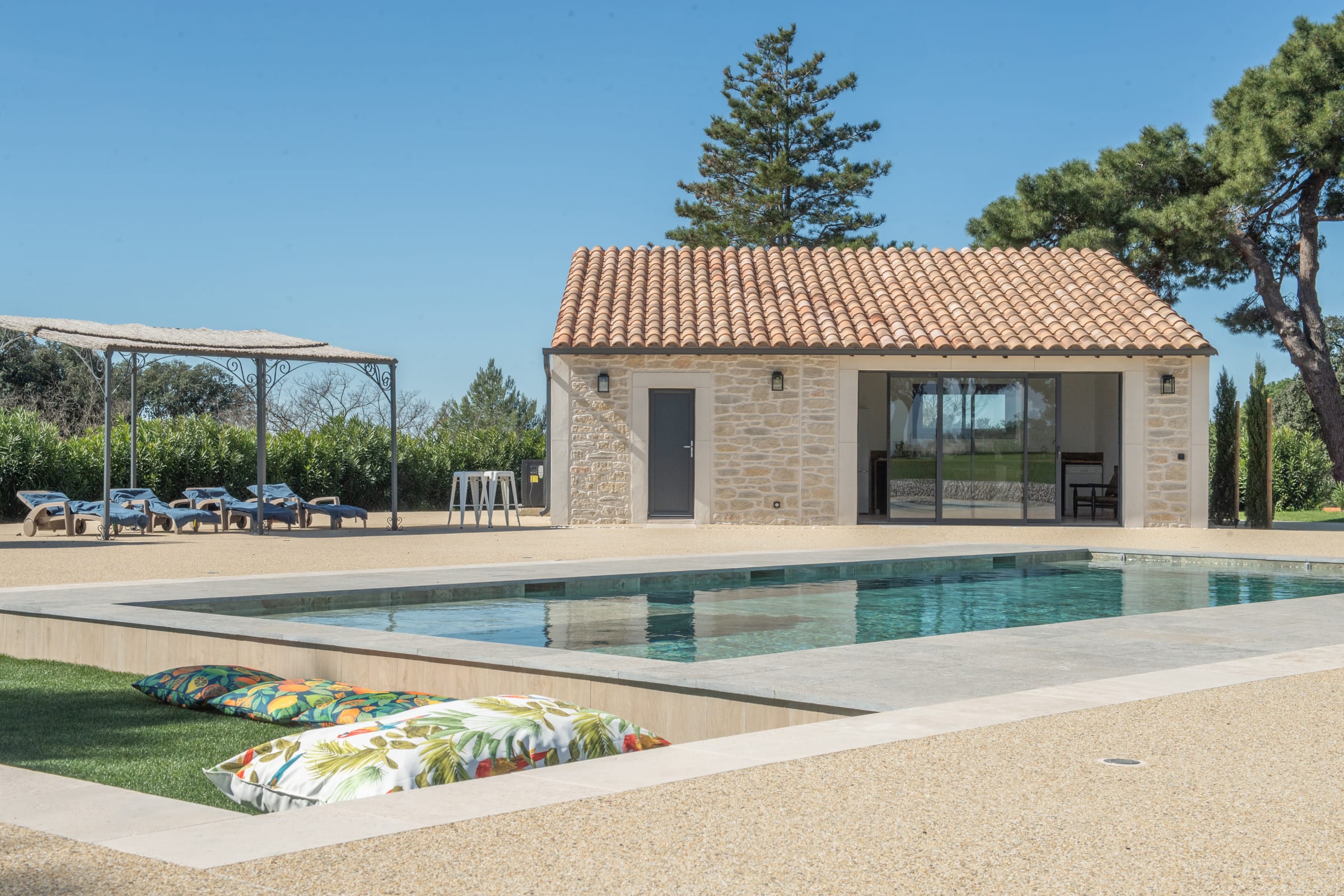 The outdoor spaces are designed as a succession of inviting living areas. Sun loungers are perfectly positioned to enjoy the garden and the pool, while two elegant outdoor lounges create true open-air living spaces, ideal for both convivial gatherings and more intimate moments. Each terrace reveals a different ambiance, allowing you to fully enjoy every moment of the day, from peaceful mornings to long summer evenings.