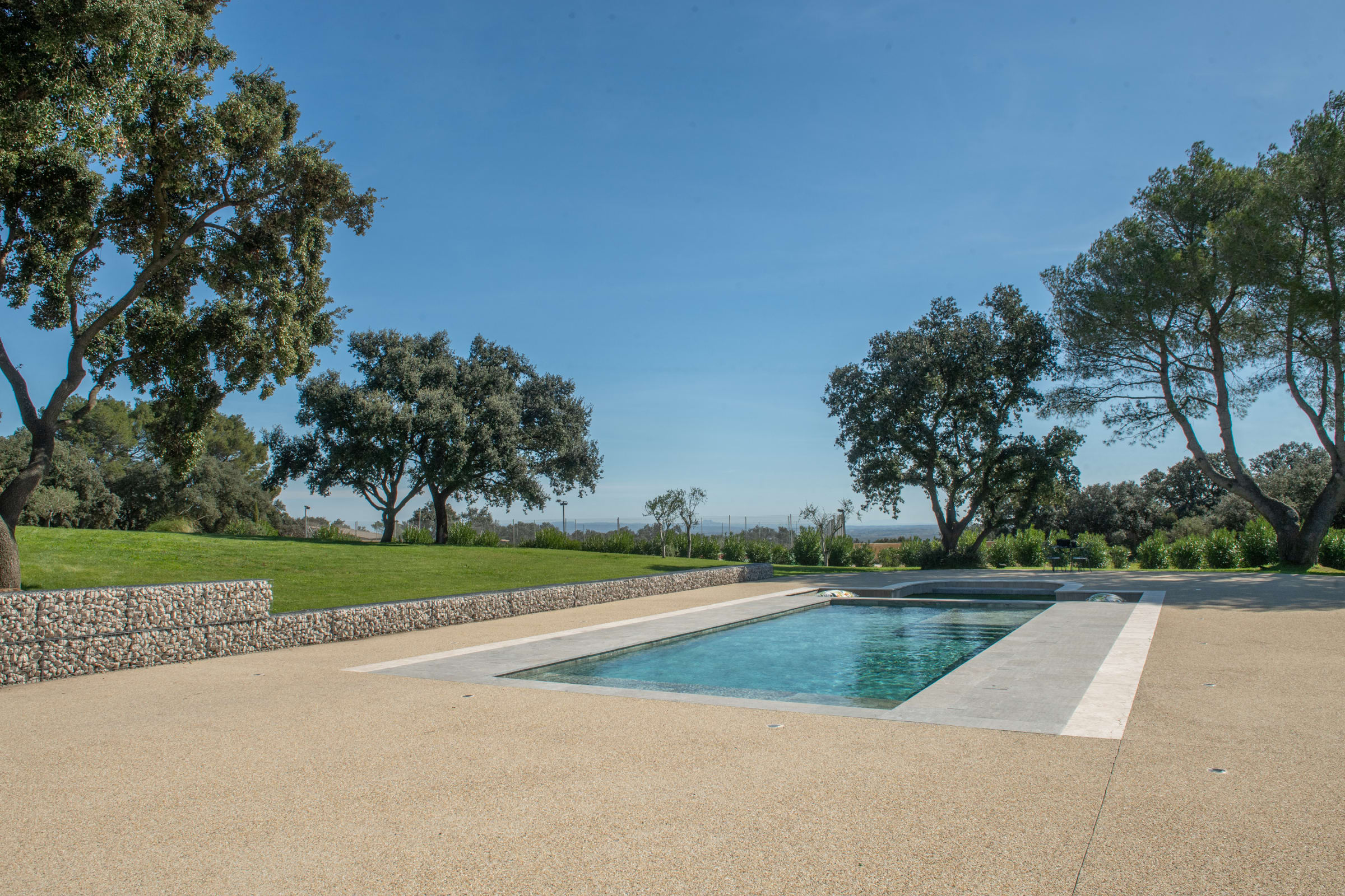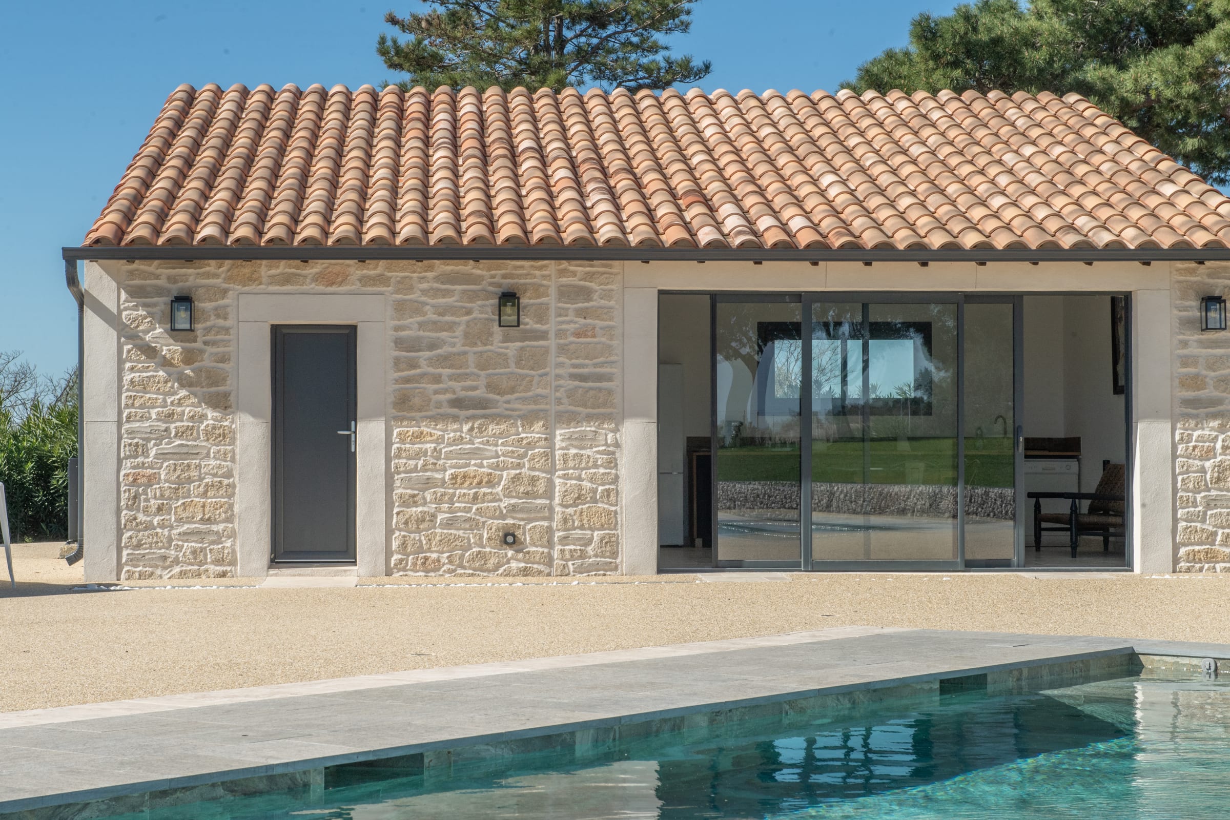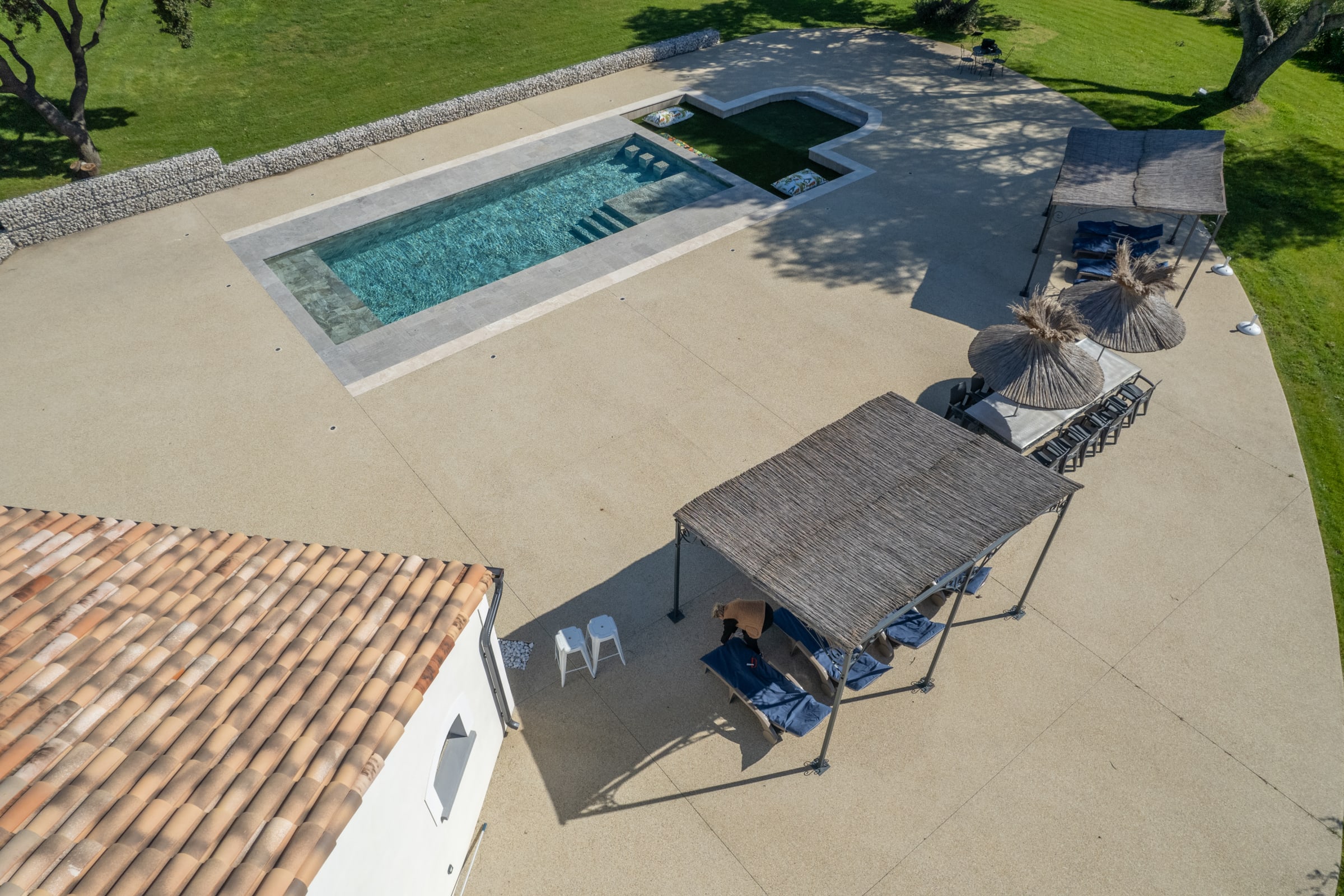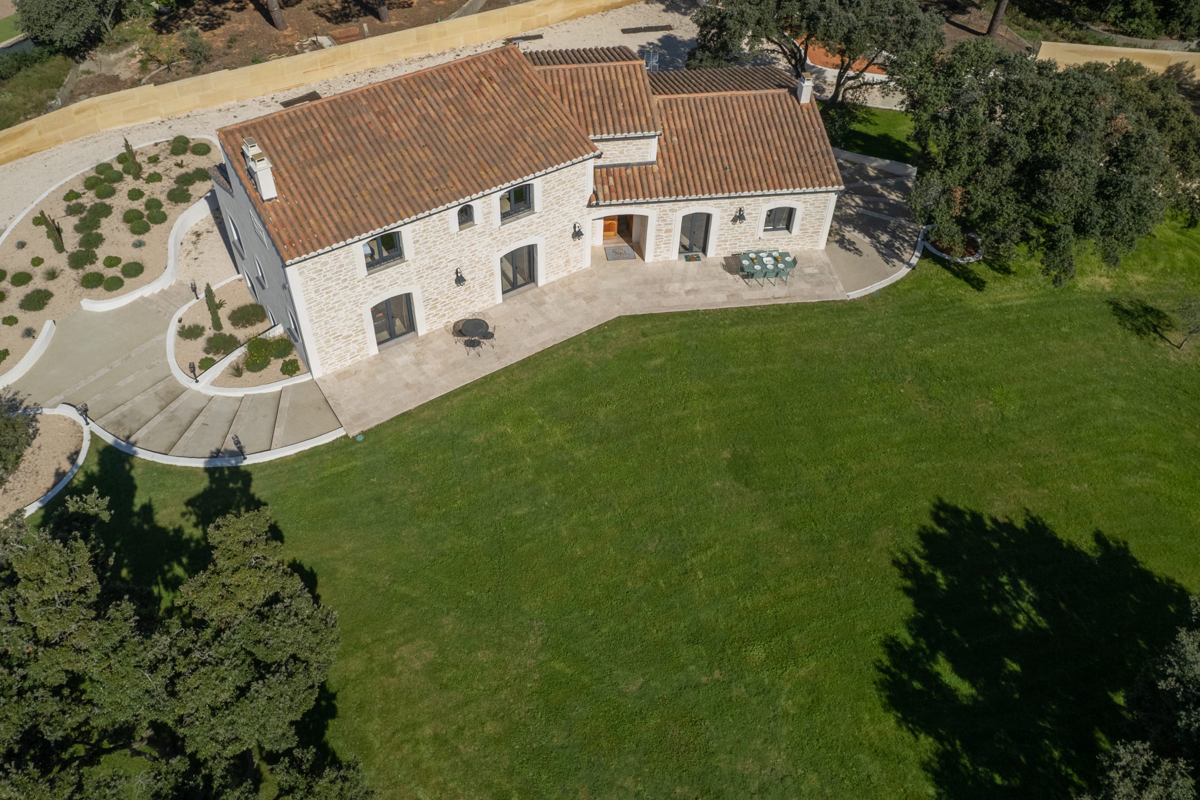 The outdoor spaces are designed as a succession of inviting living areas. Sun loungers are perfectly positioned to enjoy the garden and the pool, while two elegant outdoor lounges create true open-air living spaces, ideal for both convivial gatherings and more intimate moments. Each terrace reveals a different ambiance, allowing you to fully enjoy every moment of the day, from peaceful mornings to long summer evenings.