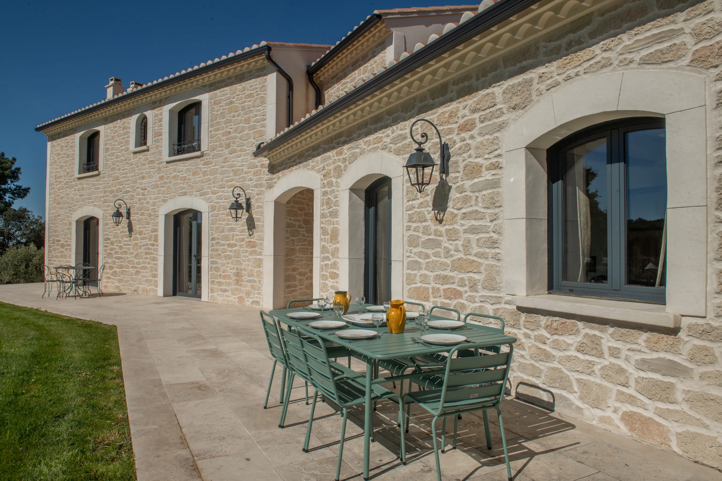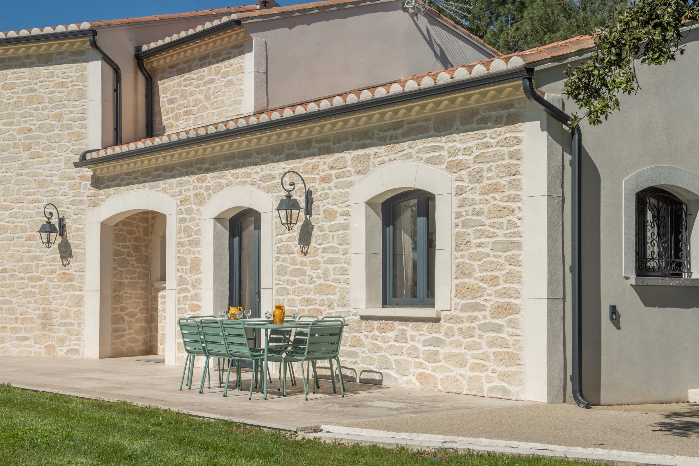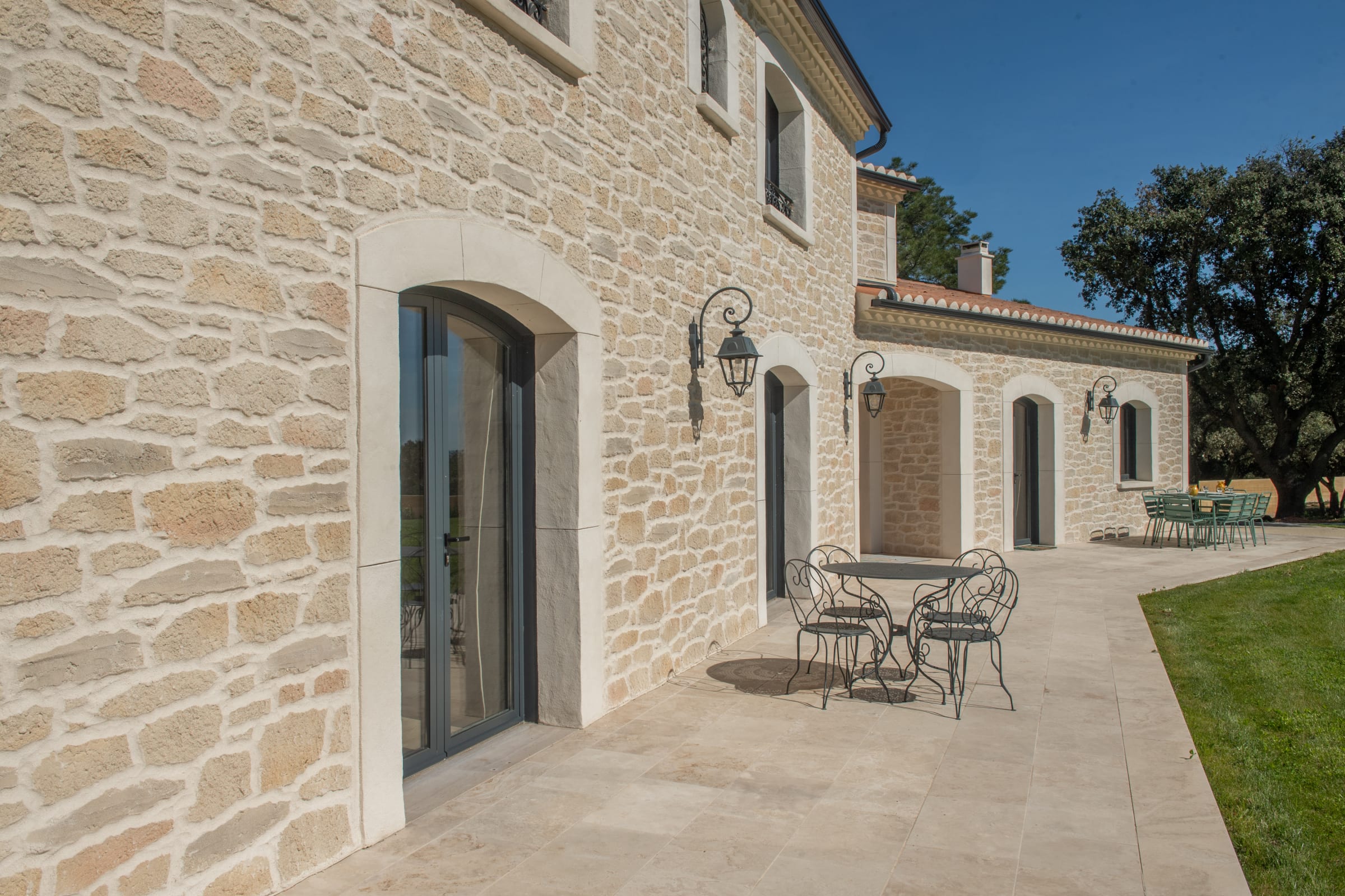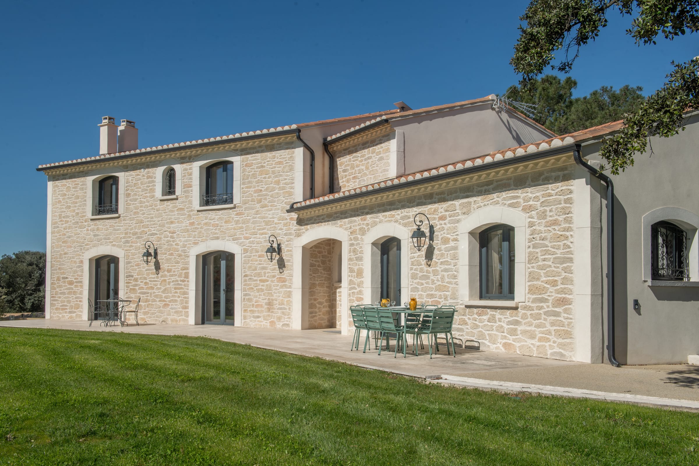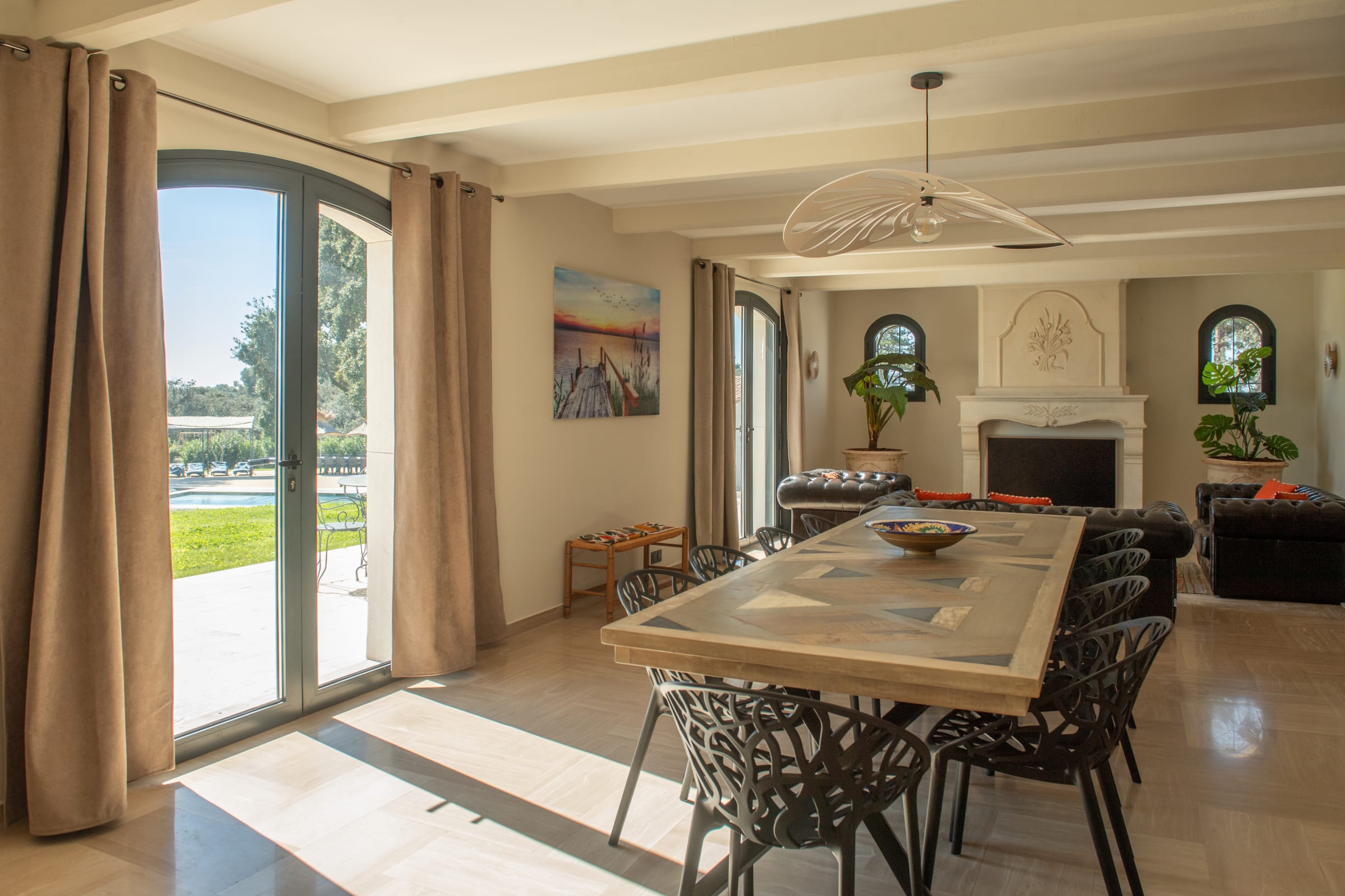 The outdoor spaces are designed as a succession of inviting living areas. Sun loungers are perfectly positioned to enjoy the garden and the pool, while two elegant outdoor lounges create true open-air living spaces, ideal for both convivial gatherings and more intimate moments. Each terrace reveals a different ambiance, allowing you to fully enjoy every moment of the day, from peaceful mornings to long summer evenings.