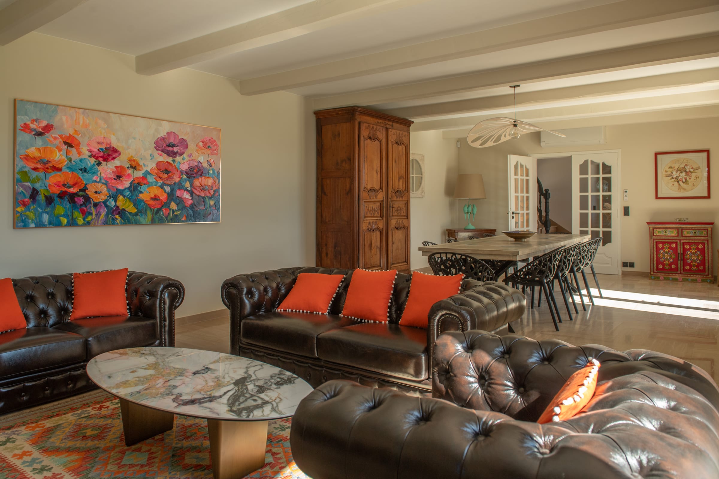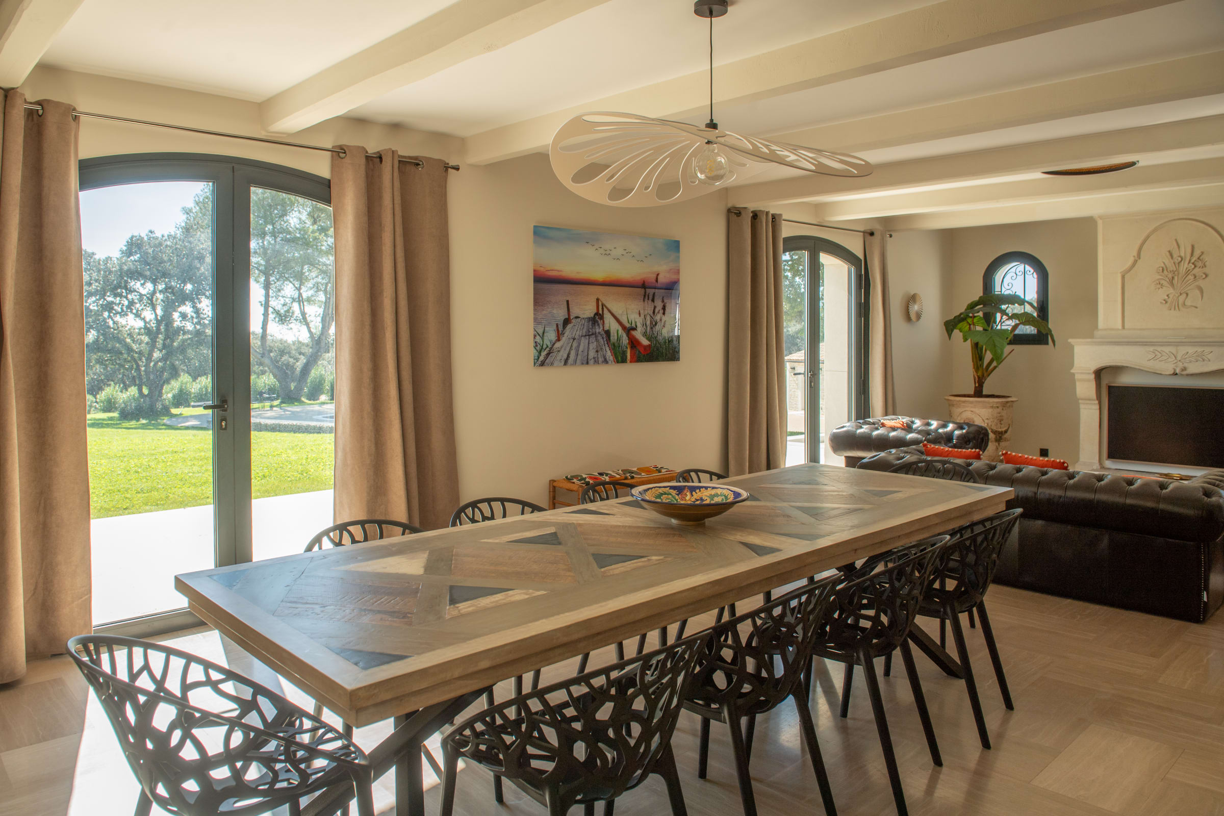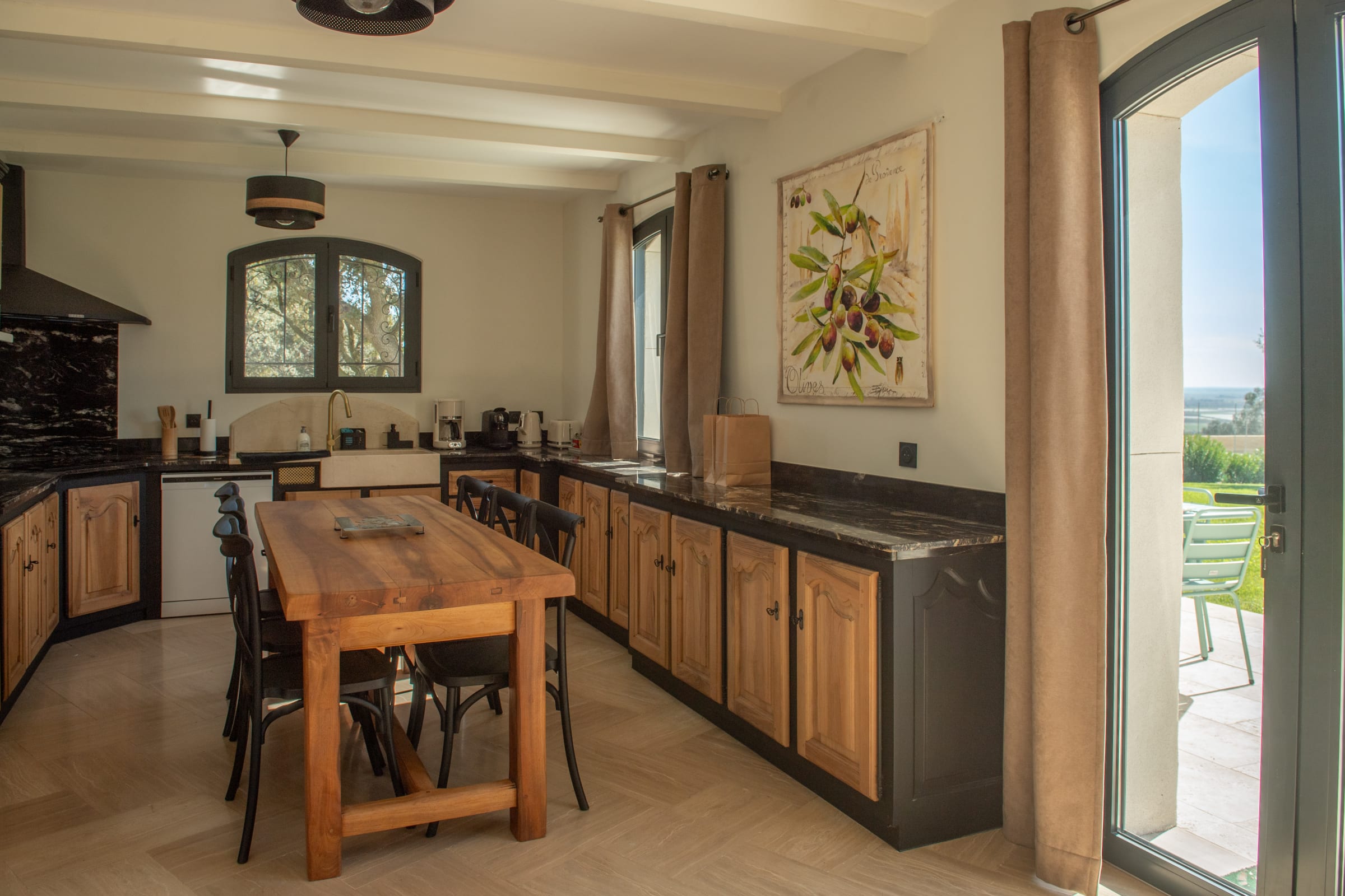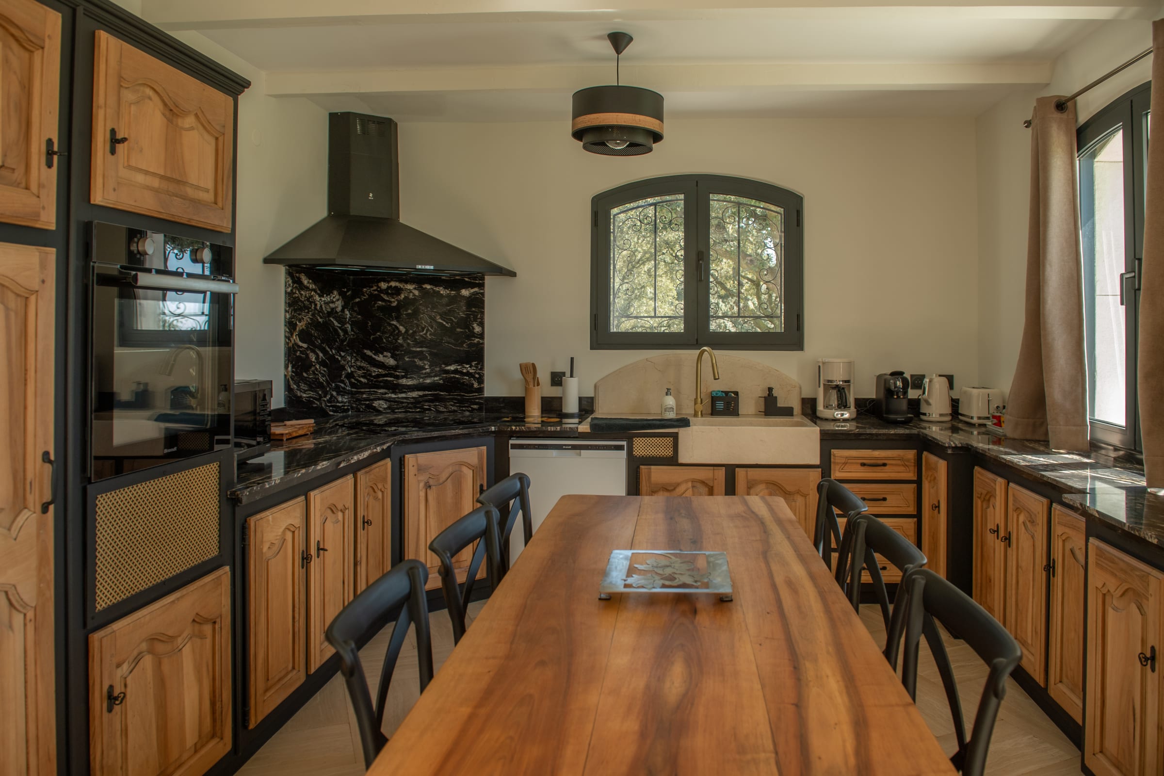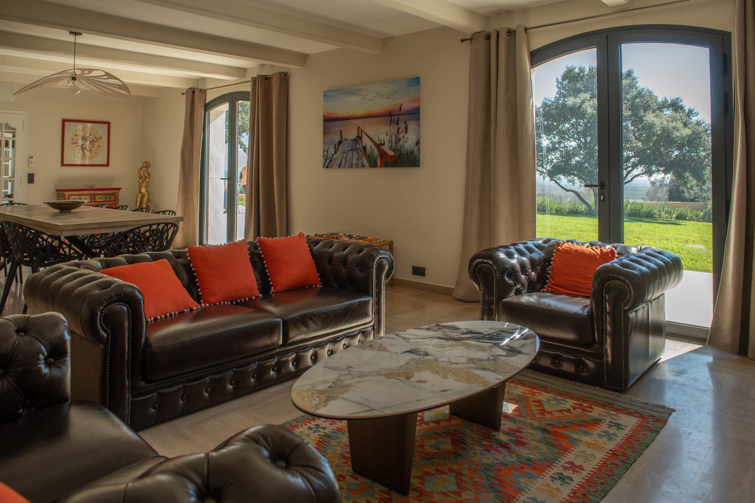 Inside, the farmhouse offers generous volumes and a refined atmosphere where every space has been designed with comfort and elegance in mind. The bright and spacious living areas create a welcoming environment, perfect for sharing moments with family and friends. The carefully curated décor combines the authentic charm of the region with contemporary touches, creating a warm yet sophisticated ambiance.