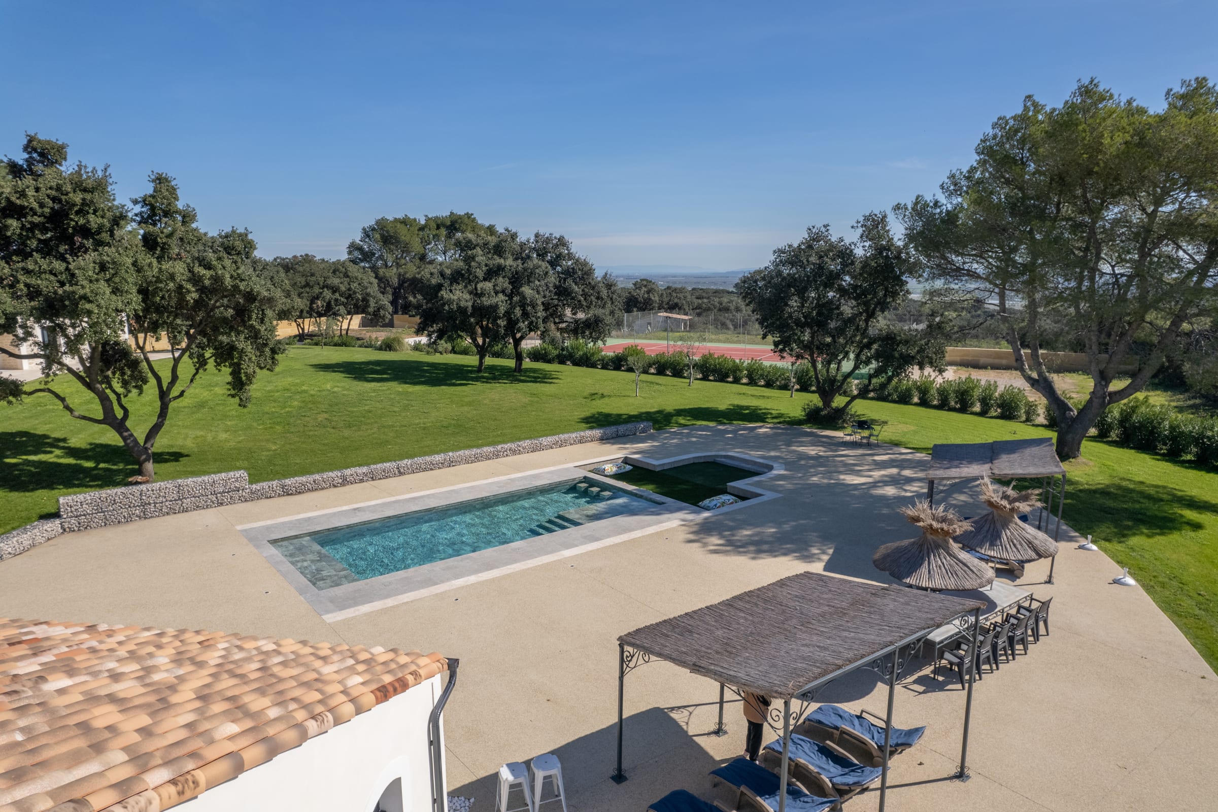 The beautiful 10 x 5 meter swimming pool, open from April to October, blends seamlessly into the natural surroundings and becomes the heart of the property. The fully equipped pool house extends these moments of relaxation and conviviality in a refined setting. For those who enjoy staying active, a private tennis court completes this exceptional outdoor experience.