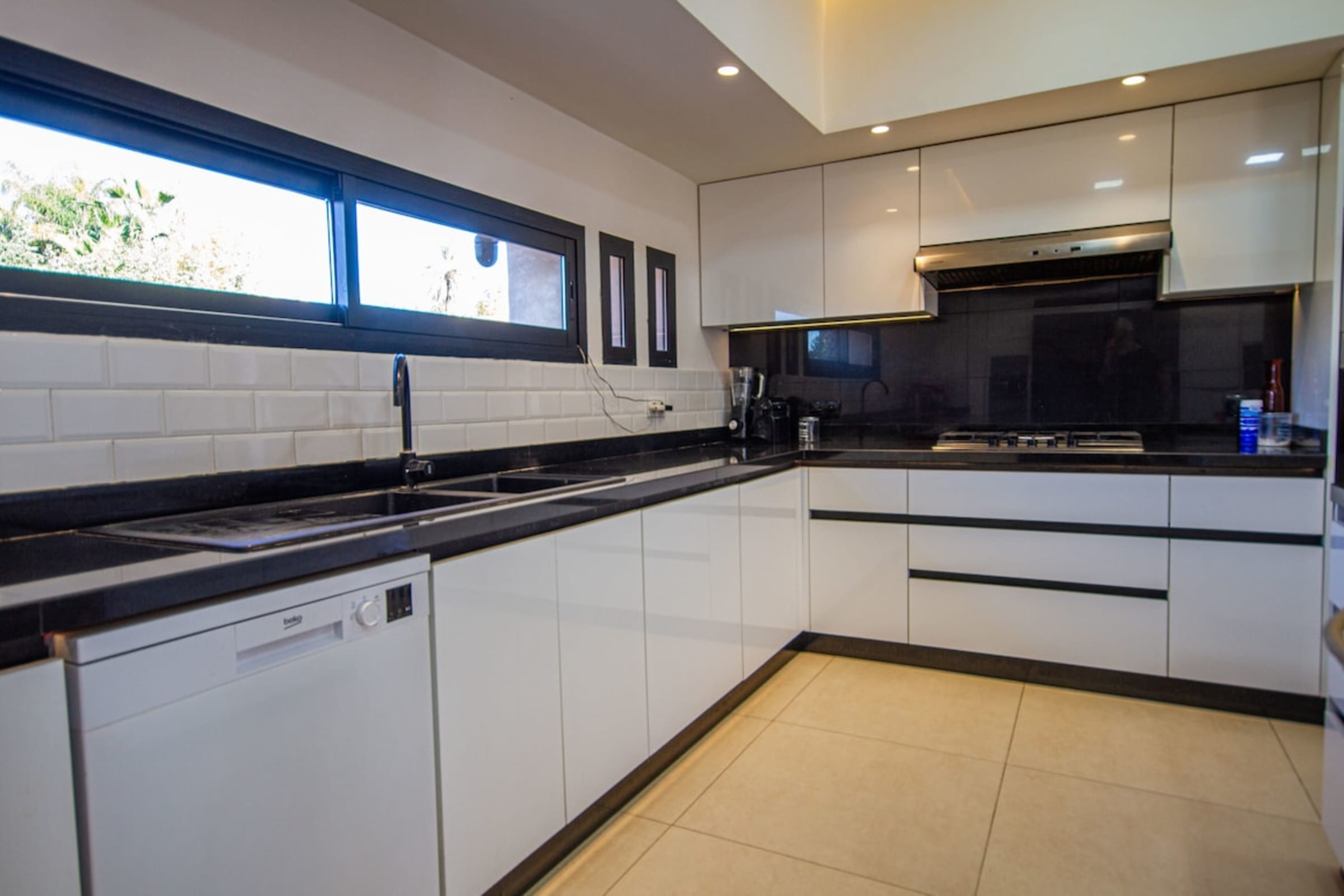 The fully equipped modern kitchen connects to a large, light-filled living room, perfect for entertaining and sharing special moments.