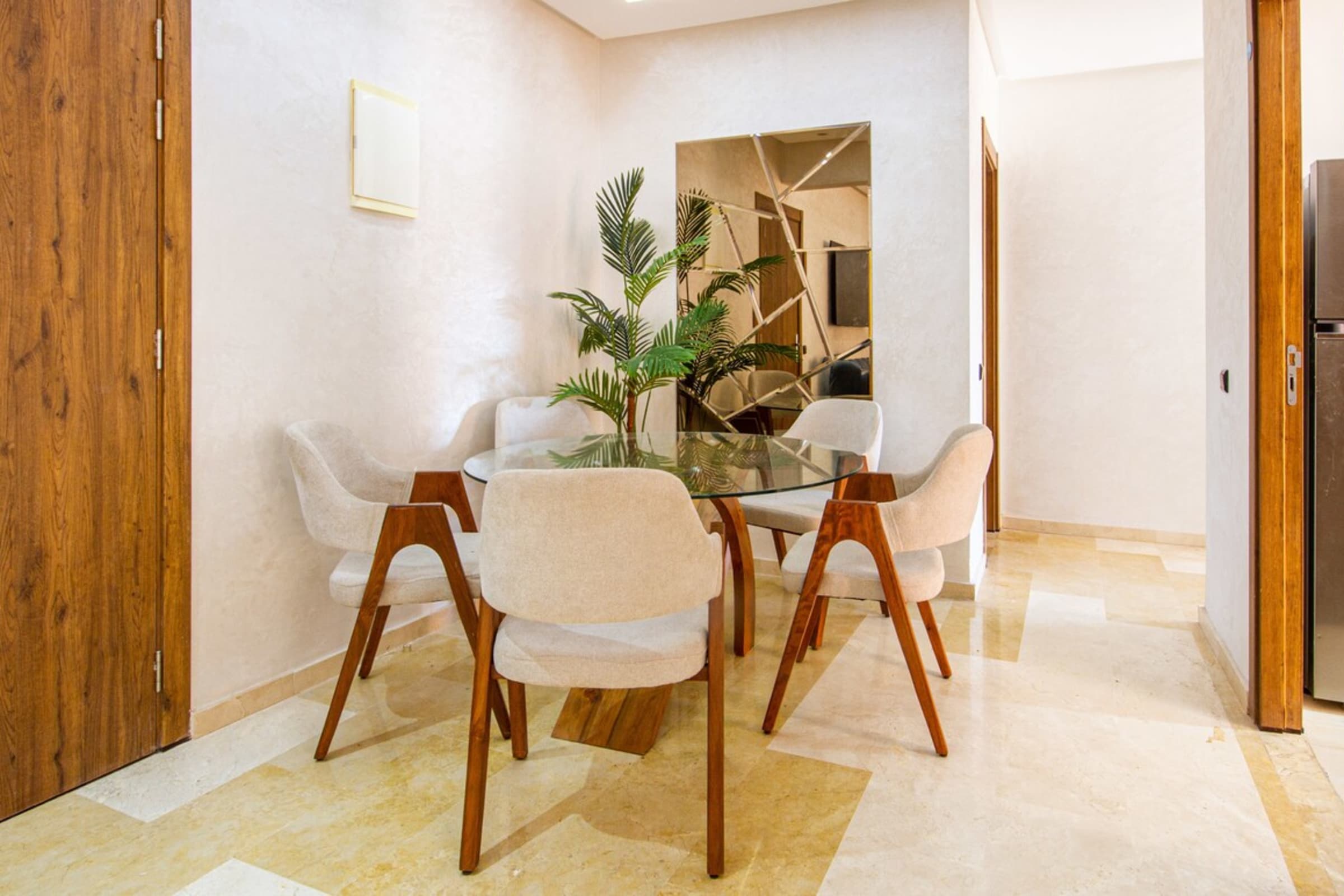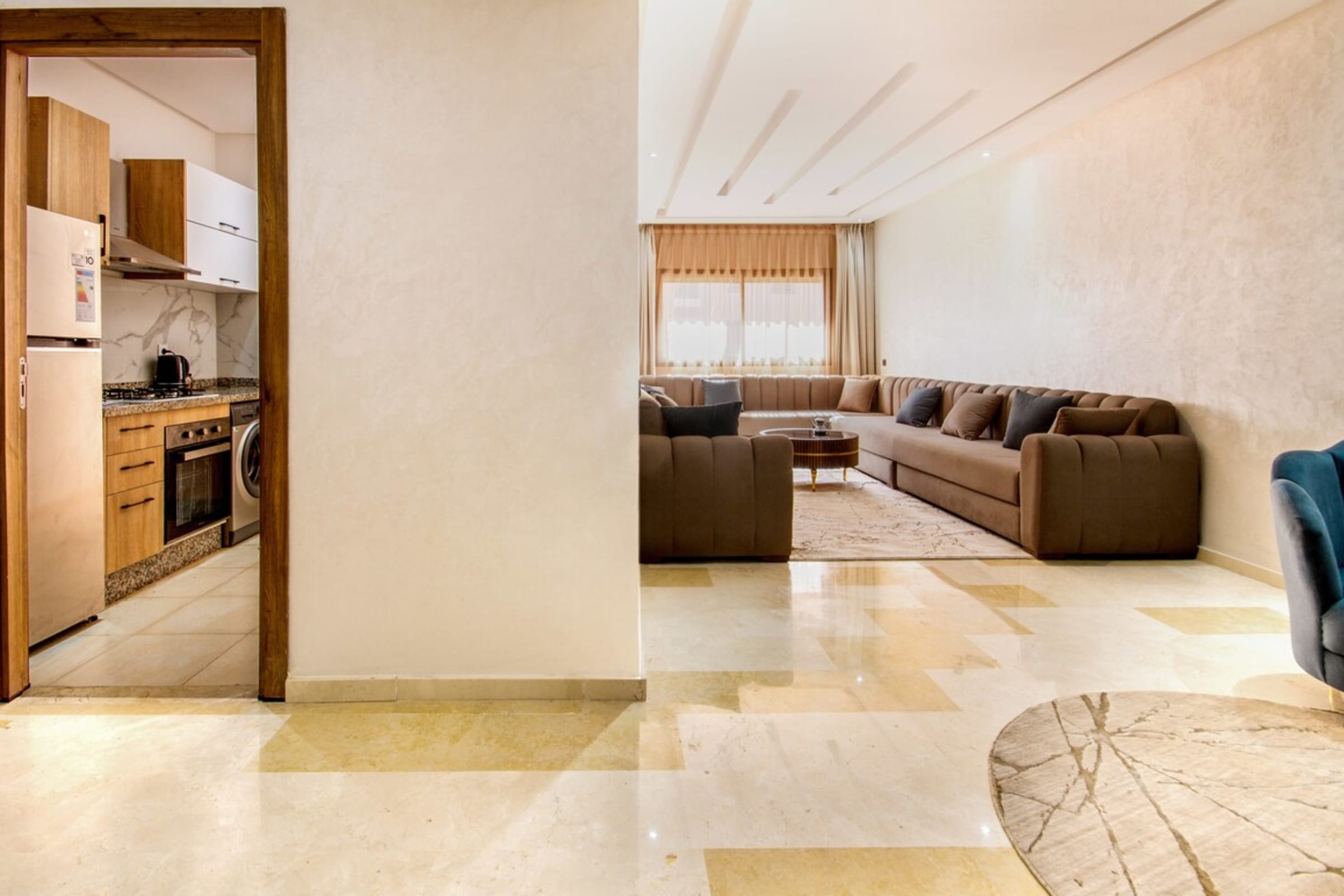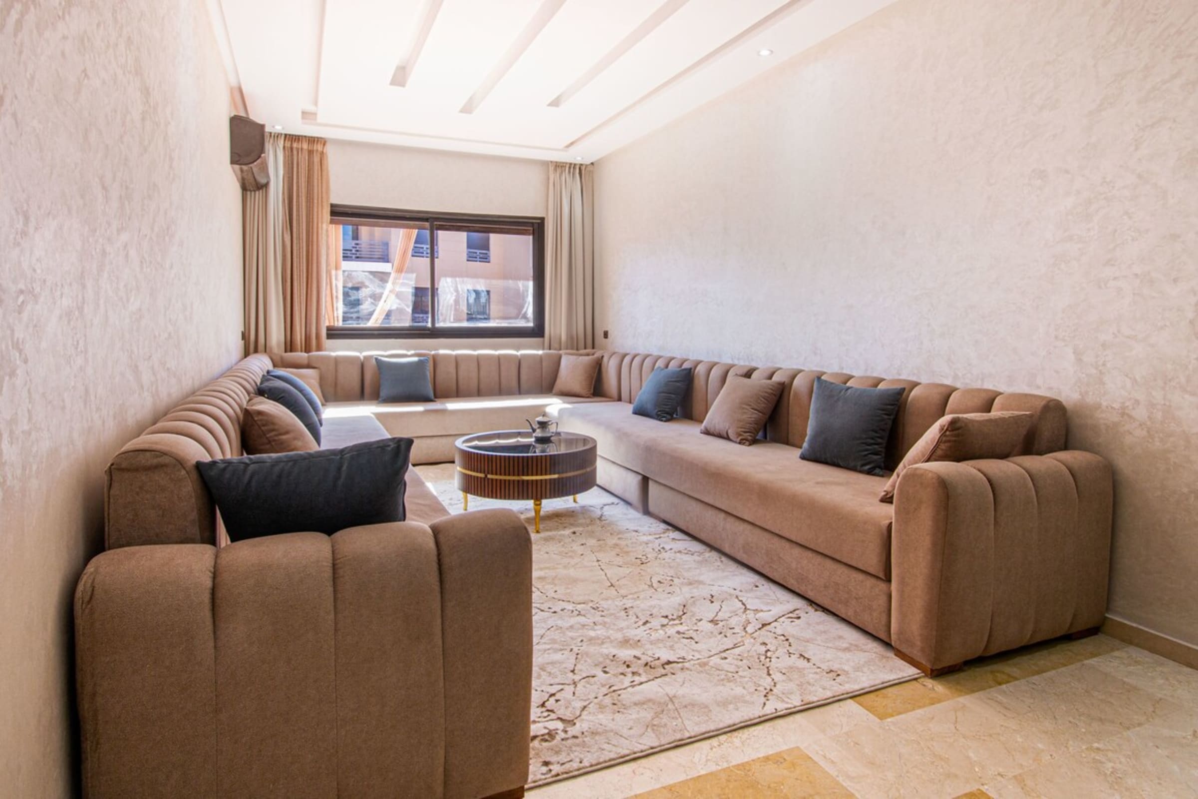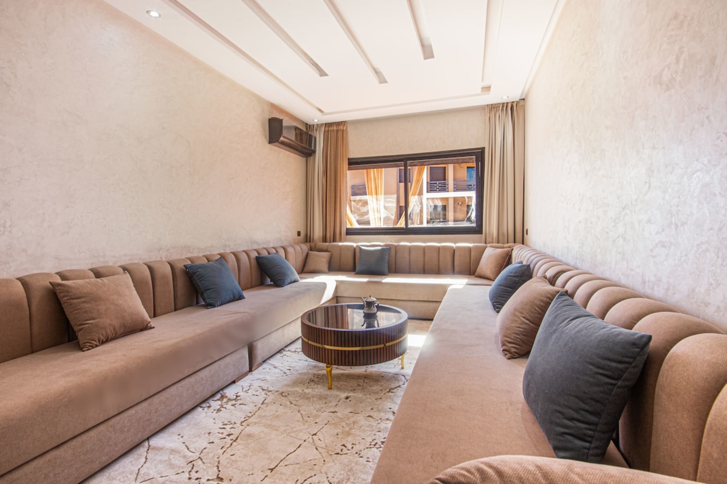The apartment is tastefully decorated in a contemporary style with warm tones, offering a calm and relaxing atmosphere after a day exploring Marrakech.
