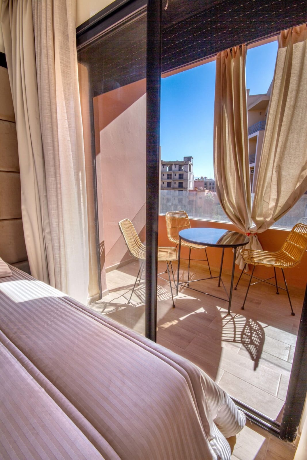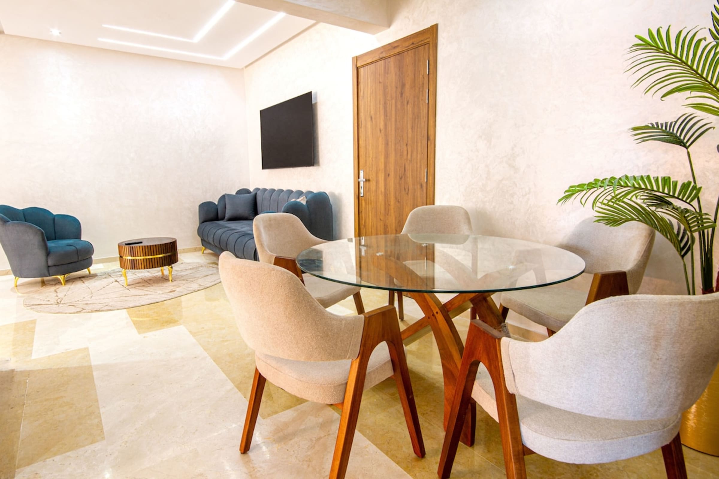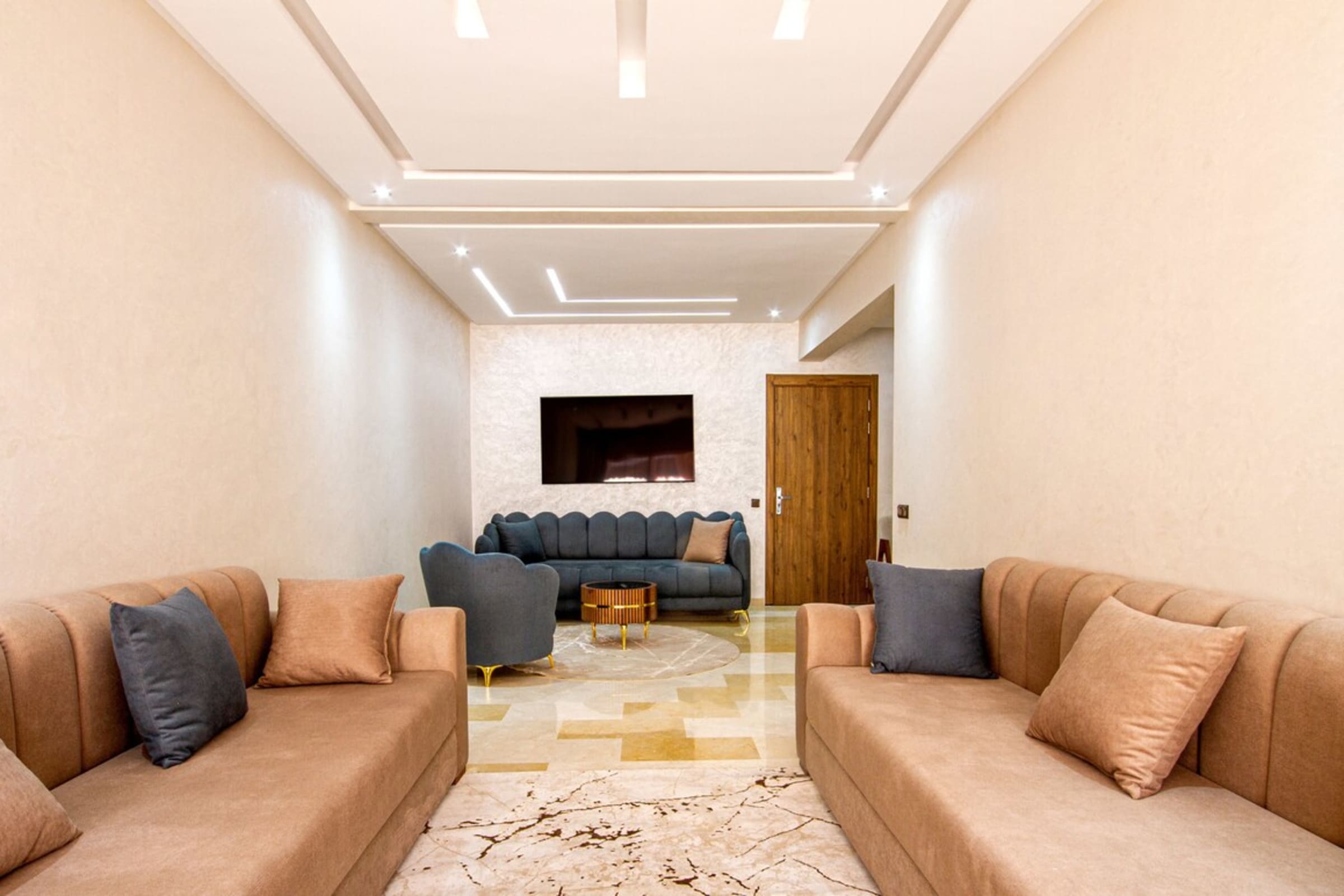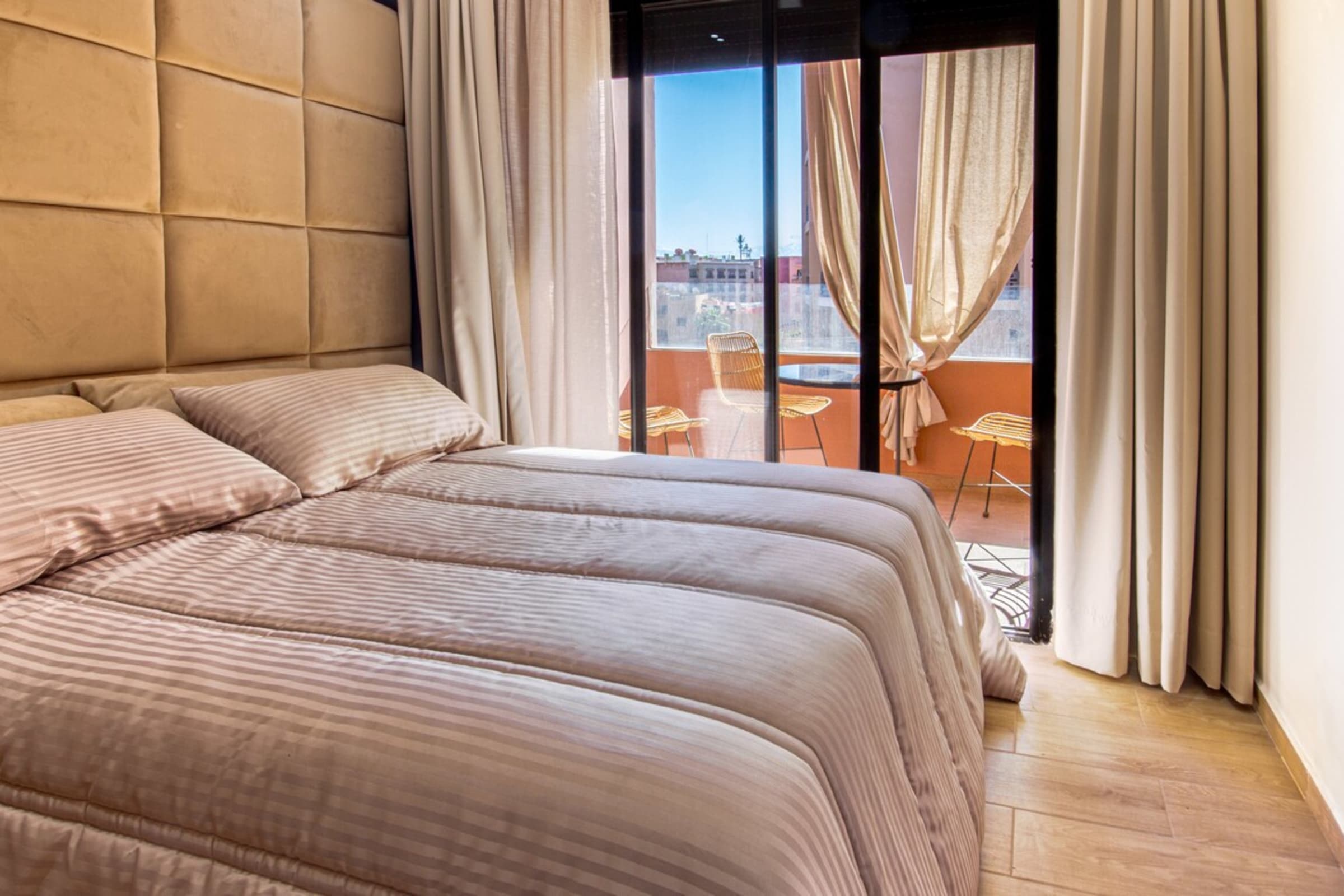 The apartment is tastefully decorated in a contemporary style with warm tones, offering a calm and relaxing atmosphere after a day exploring Marrakech.