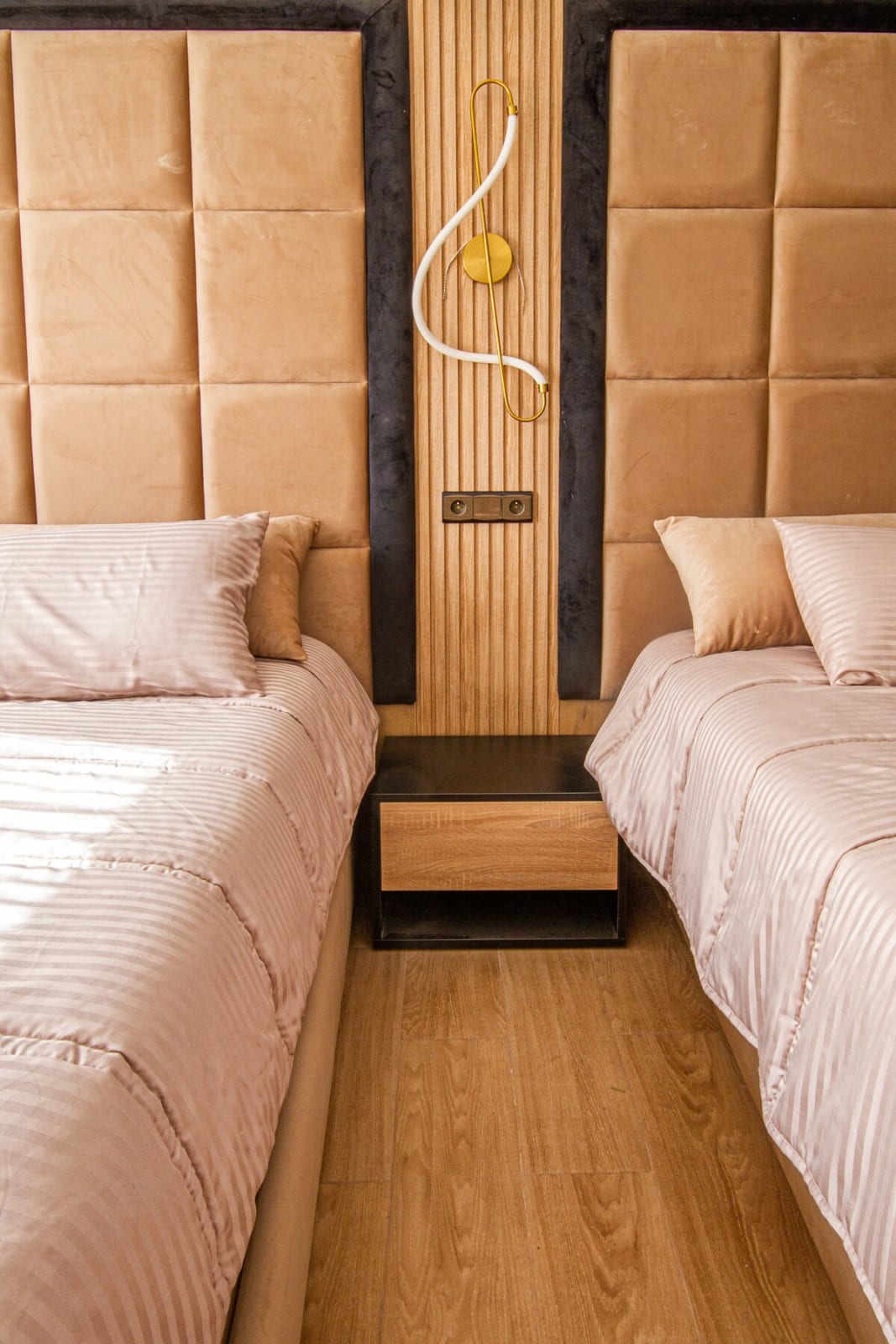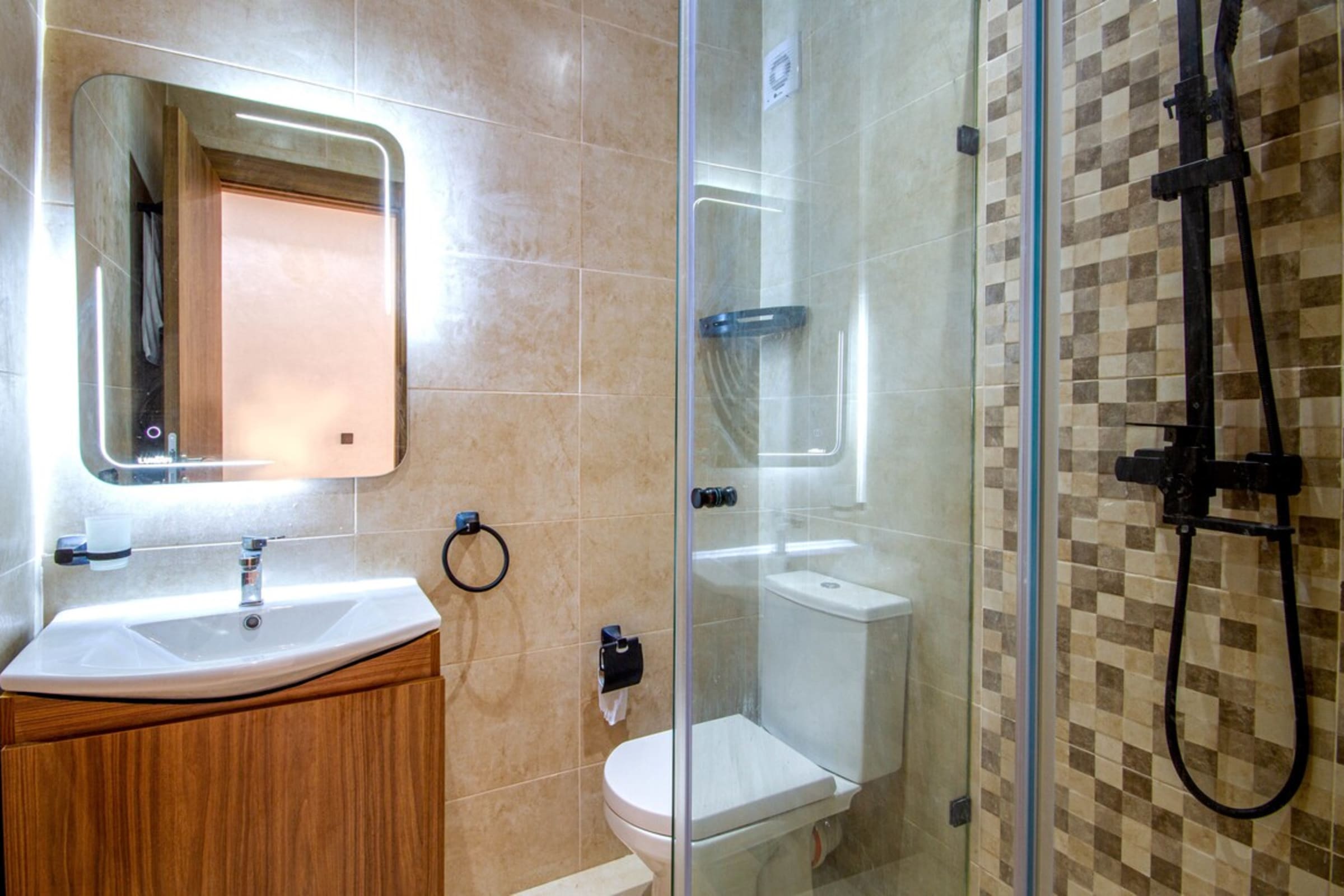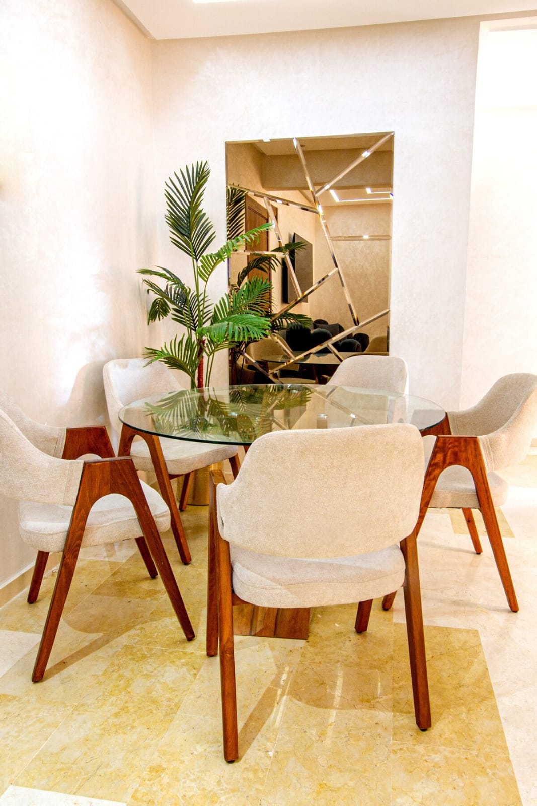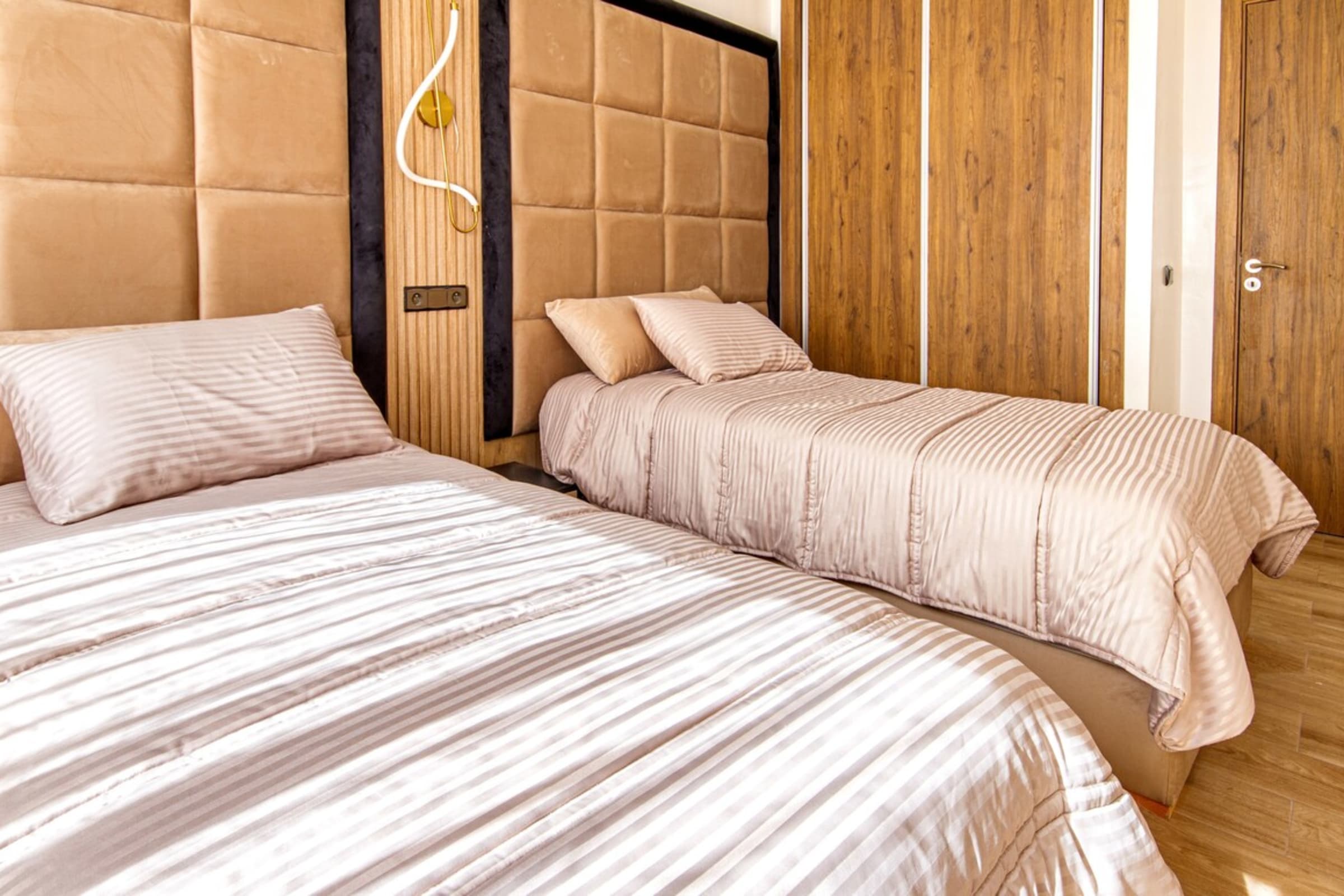 The apartment is tastefully decorated in a contemporary style with warm tones, offering a calm and relaxing atmosphere after a day exploring Marrakech.