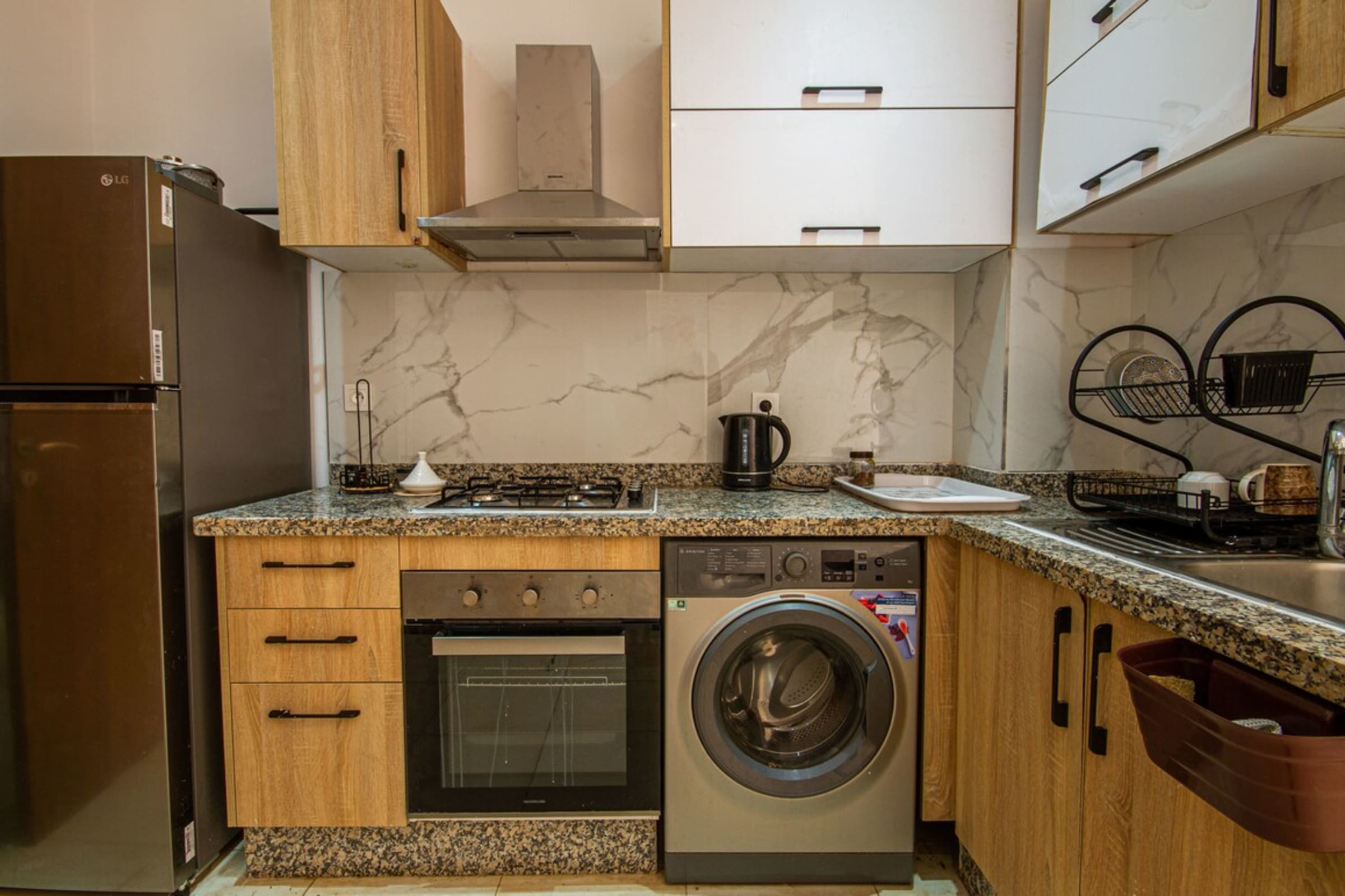 Fully equipped kitchen: oven, cooktop, refrigerator, washing machine, dishes and kitchen utensils