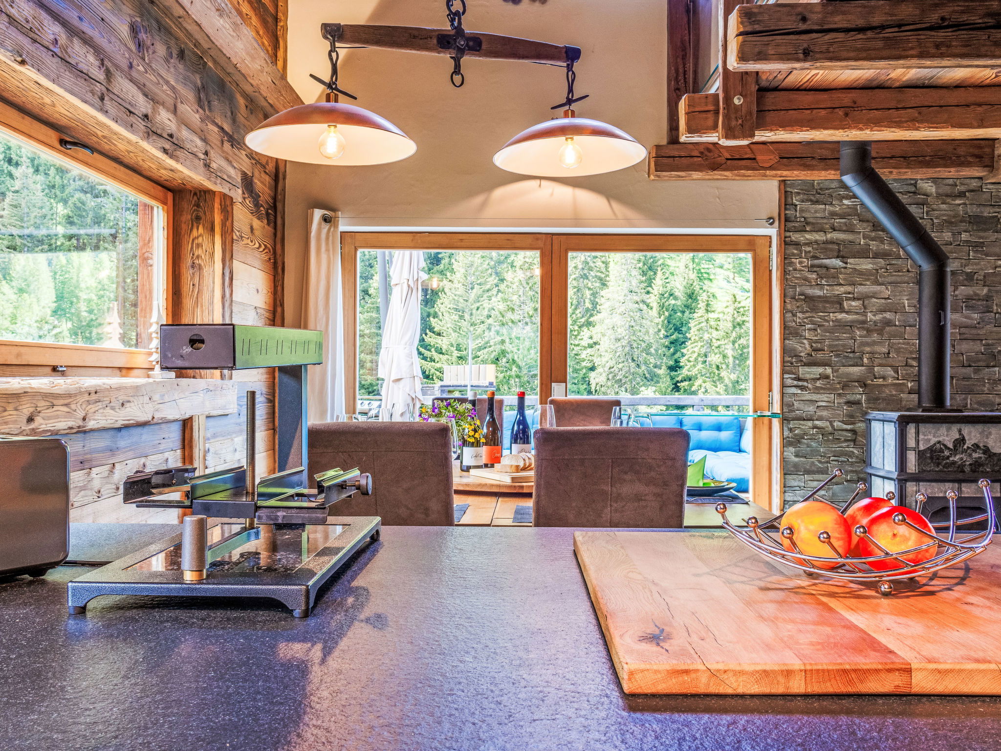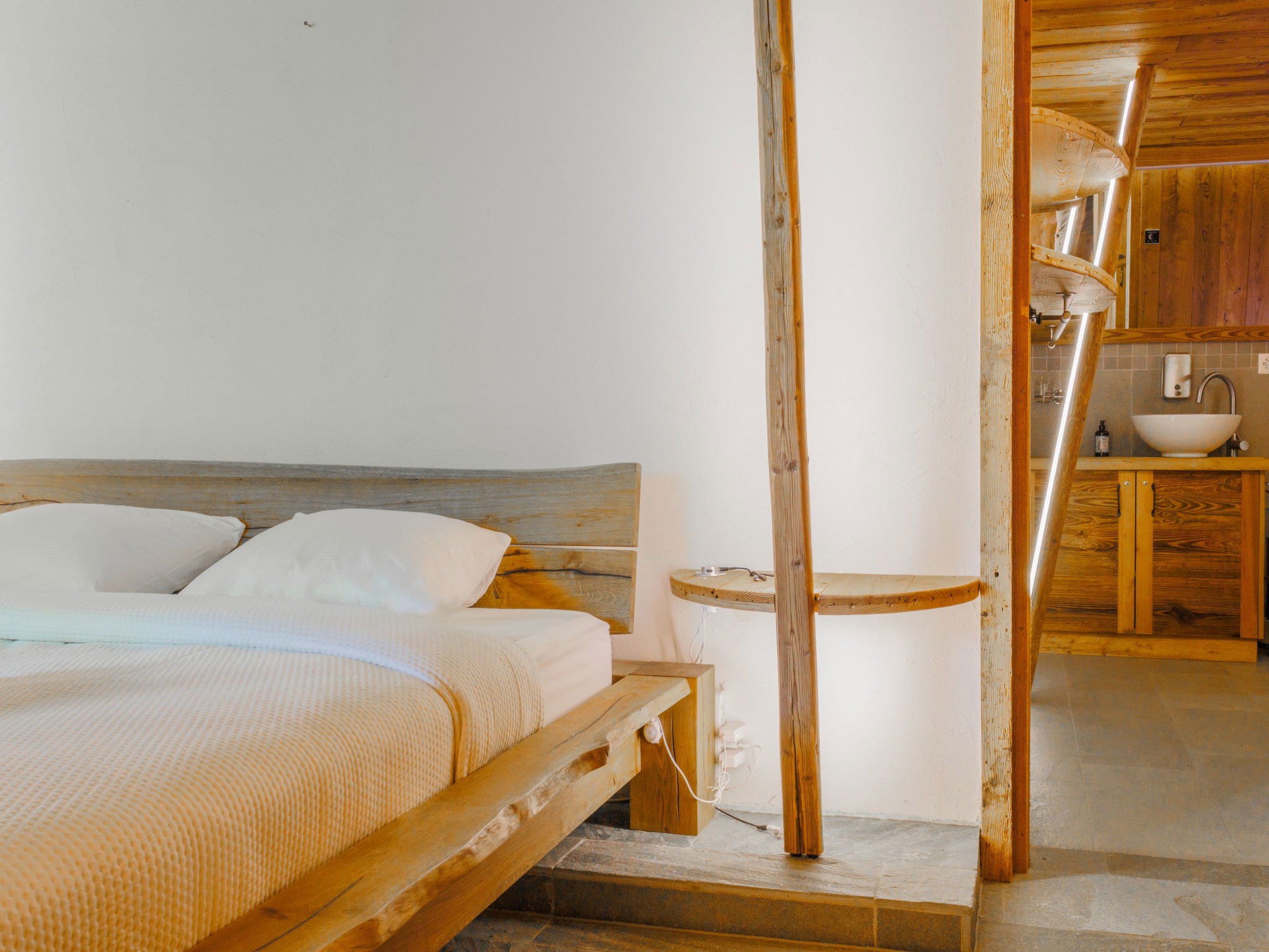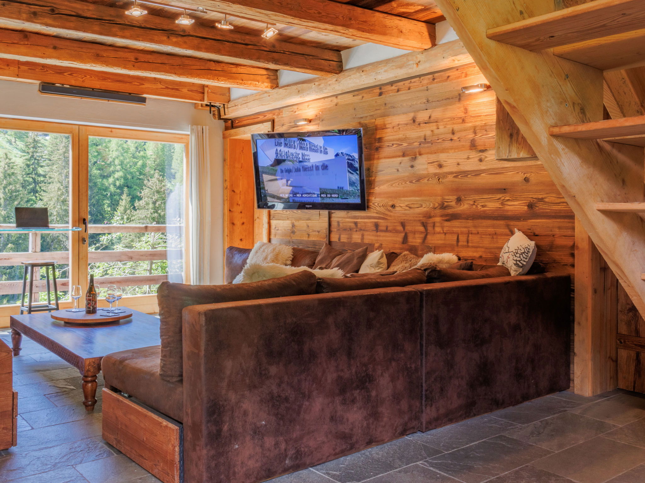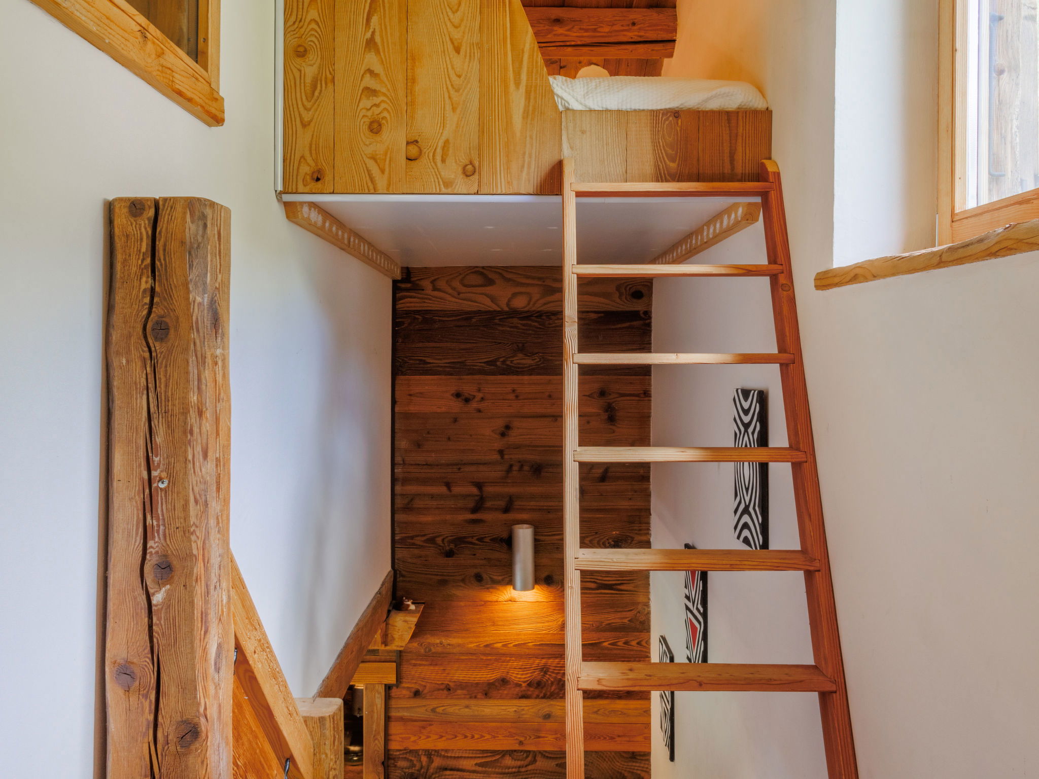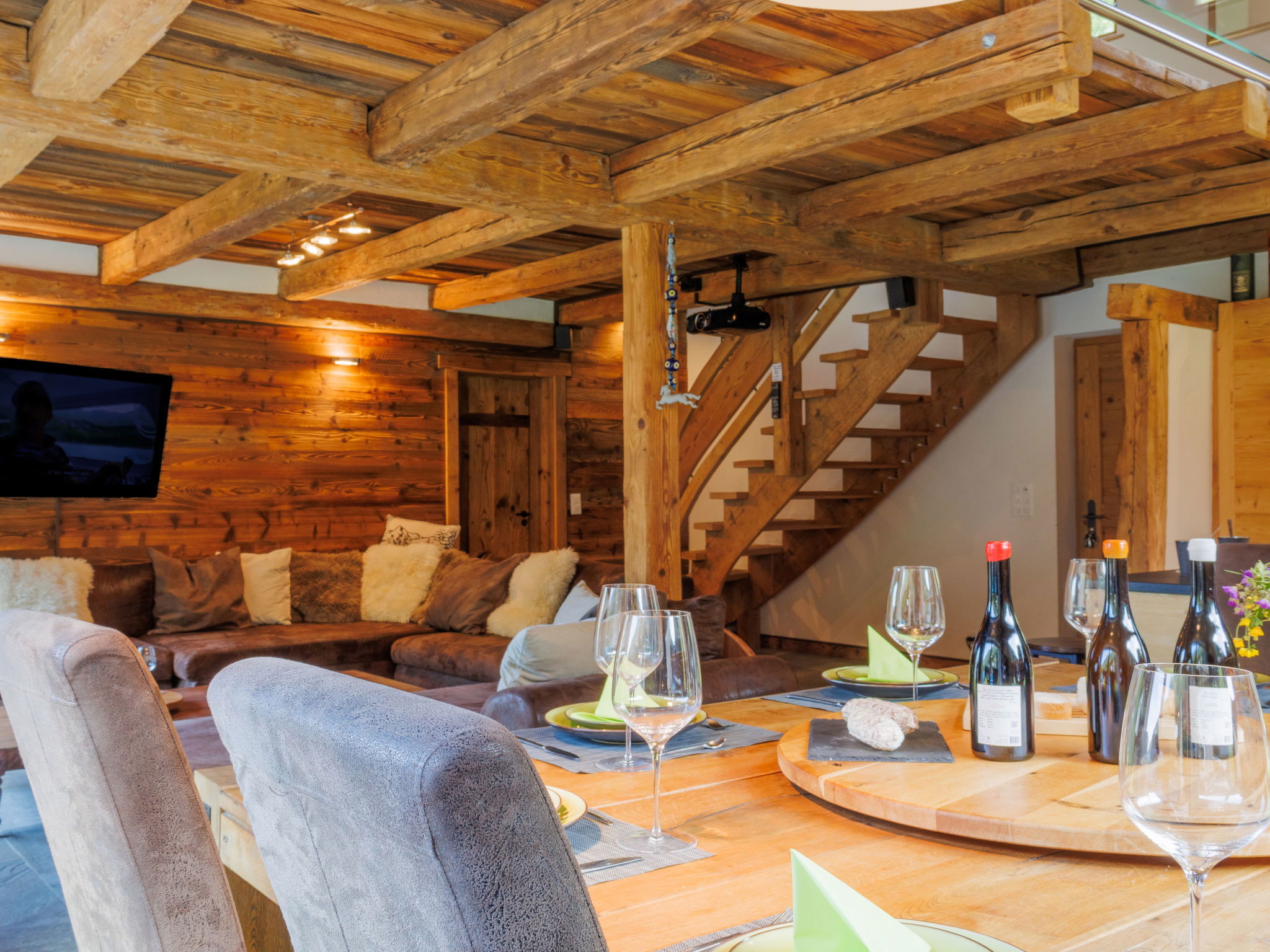 "Chalet Gaea", 5-room chalet 140 m2 on 3 levels, north-east facing position. Object suitable for 6 adults + 3 children. Partly with sloping ceilings, very comfortable and beautiful furnishings: entrance hall. Living/dining room with Scandinavian wood stove and Home cinema. Exit to the terrace. Open kitchen (oven, dishwasher, 4 induction hot plates, toaster, kettle, microwave, freezer, electric coffee machine, Capsules for coffee machine (Nespresso) extra, raclette grill, fondue Set (cheese)). Bath/shower/WC. On the lower ground floor: 1 room with 1 french bed (180 cm, length 200 cm), bath/shower/WC. Upper floor: 1 room with 1 bed (90 cm, length 200 cm), 1 french bed (160 cm, length 200 cm). (ladder) open small gallery with sloping ceilings, ceiling height 120 - 145 cm with 1 bed (90 cm, length 200 cm). 1 room, without wardrobe with 1 double sofabed (140 cm, length 200 cm). Top floor: (ladder) open gallery with sloping ceilings, ceiling height 48 - 135 cm with 1 bed (90 cm, length 200 cm). Large terrace. Terrace furniture, barbecue, deck chairs. Very beautiful view of the mountains. Facilities: washing machine, dryer, hair dryer. Internet (WiFi, free). Parking (3 cars). Please note: not suitable for children under 8 years. Non-smokers only. 2 braziers, one of which is covered. Instead of an enclosed bedroom, some sleeping areas are located in an open-plan area (gallery, alcove, etc.).
