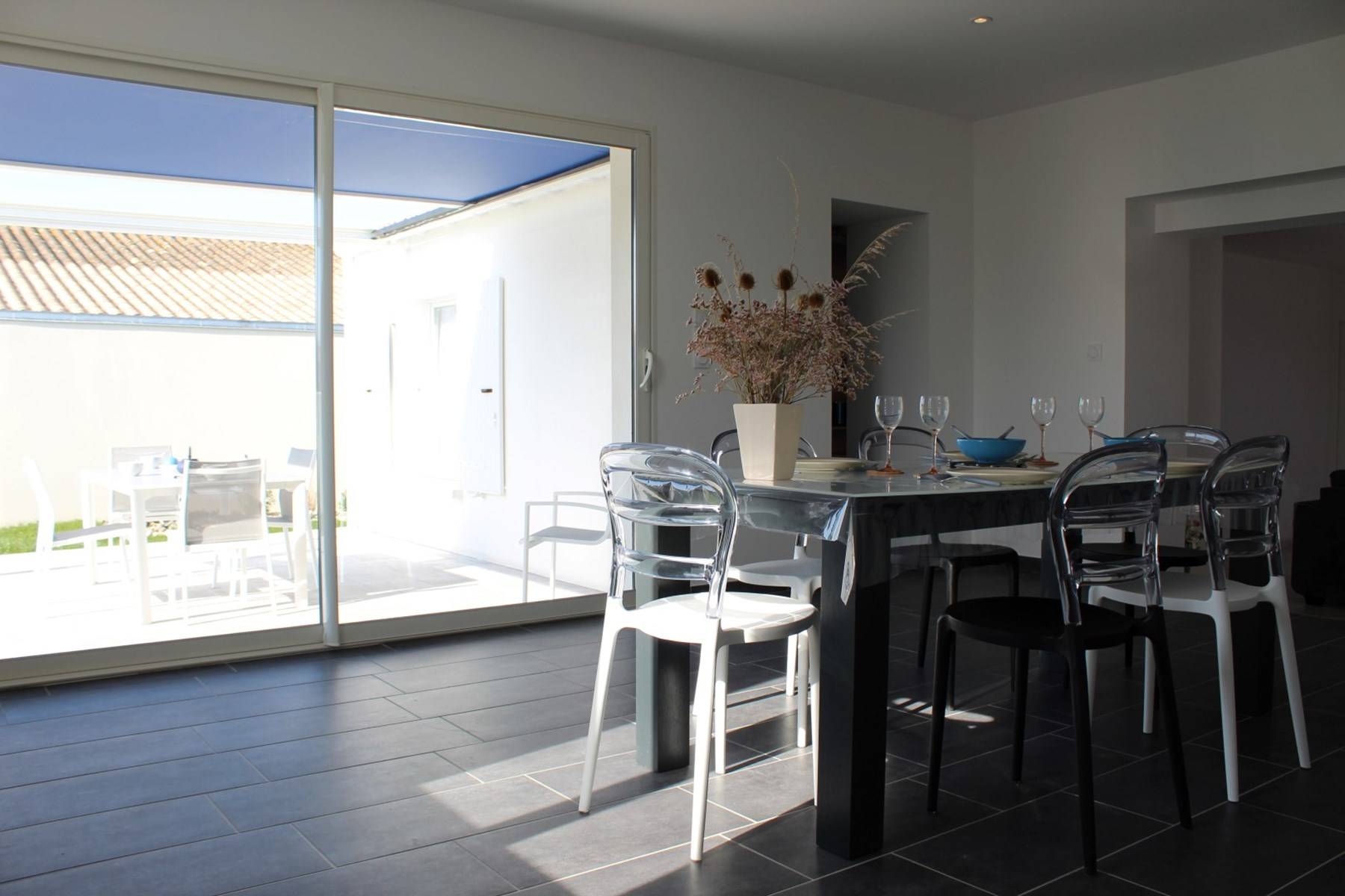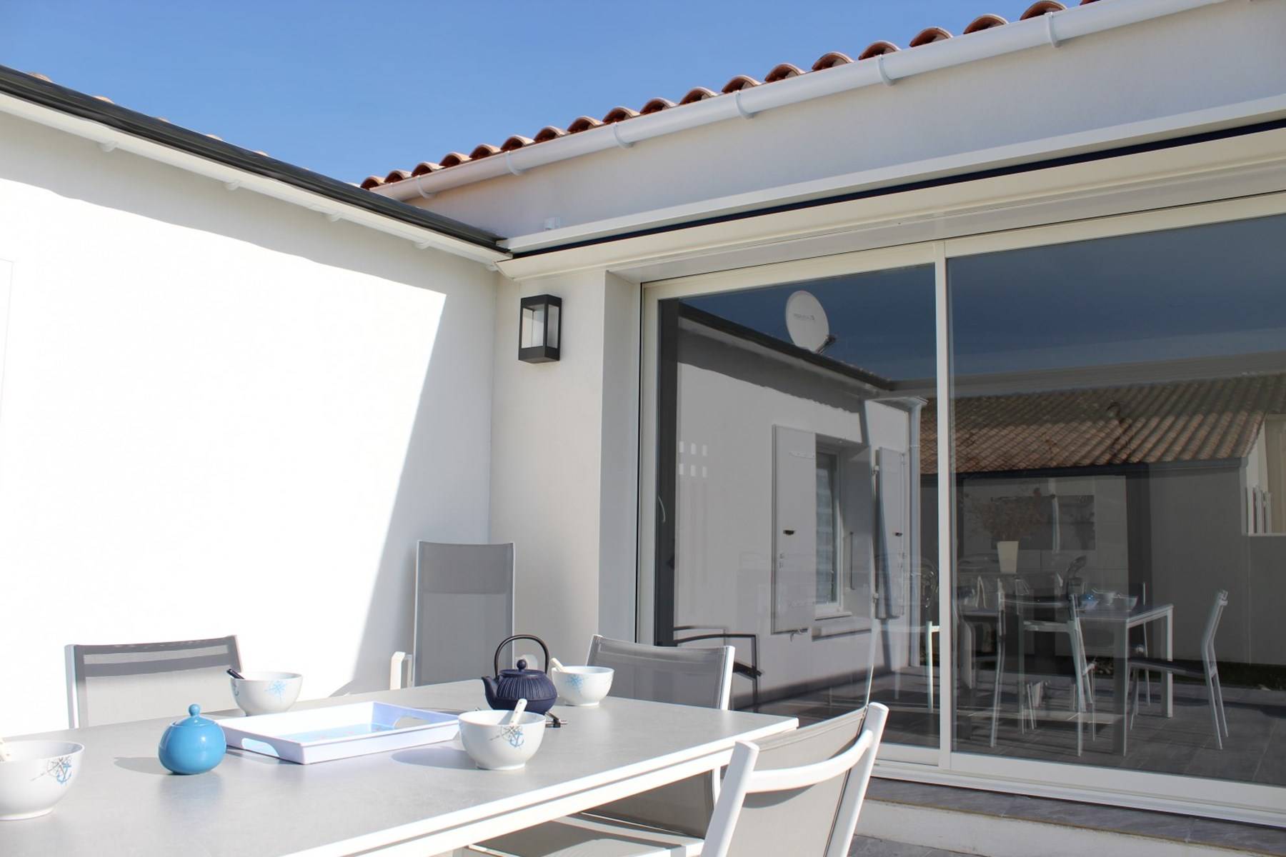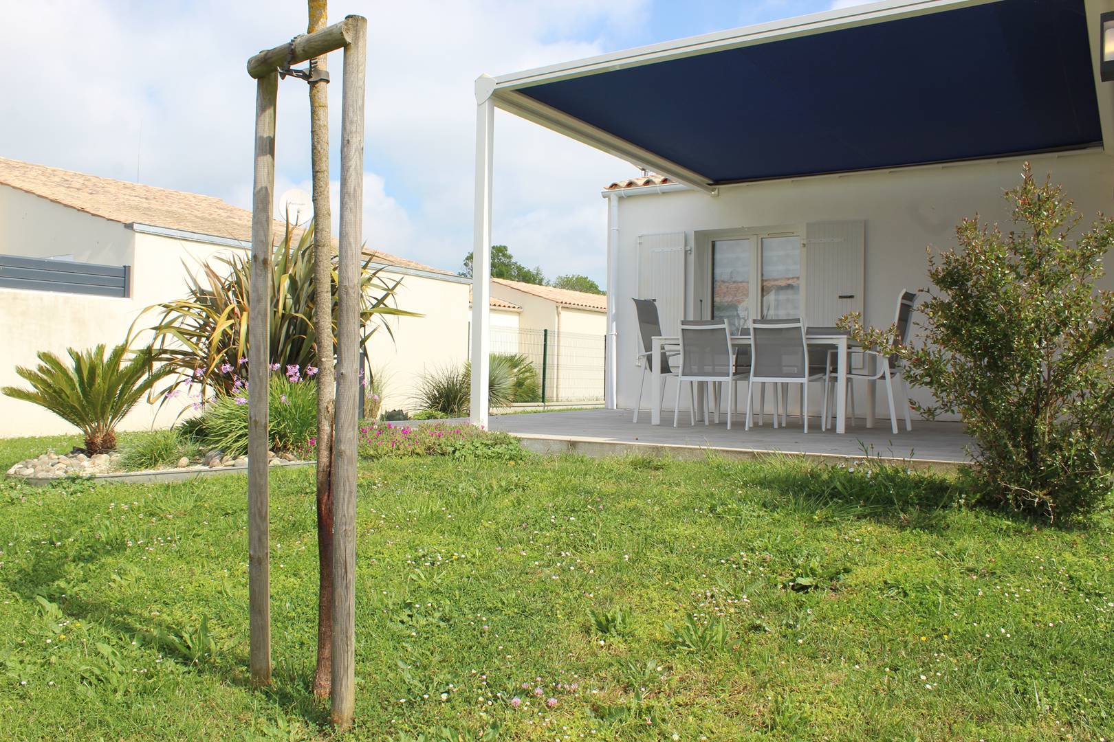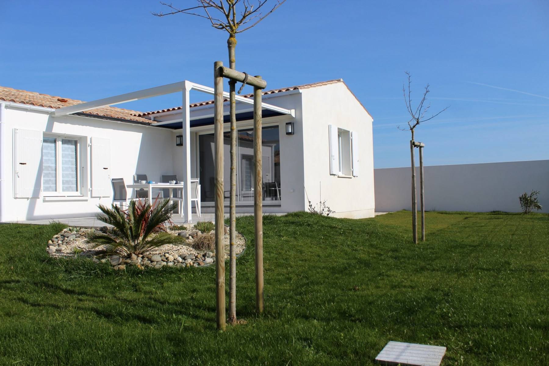 Saint Pierre d'Oléron (17) - Center of the island 4-room house - approx. 80 m² - up to 5 people On the outskirts of town, close to all amenities. Beautiful contemporary detached house, on vast enclosed grounds with plant beds, comprising: a dining room, a living room with a convertible sofa (for a possible additional bed), a pretty fitted kitchen, two bedrooms each with a double bed (140) and cupboards, a bathroom, a terrace, a garage for storage. Separate toilets. Living room opening onto a terrace covered by an electric pergola. Possibility to park on the property. The advantages of this rental by the sea: Modern and recent house at the end of a dead end. Close to shops. In the center of the island to visit from North to South. Cleaning with disinfection included.