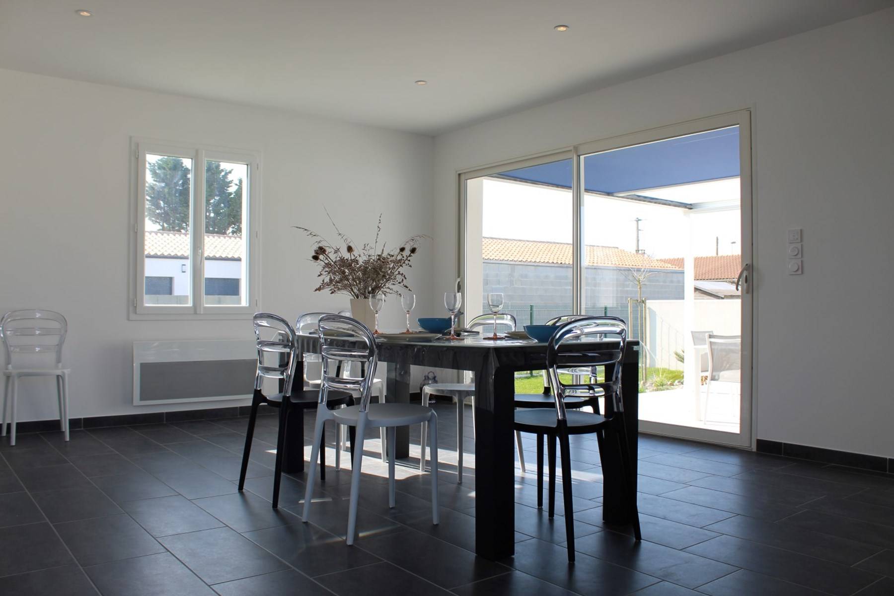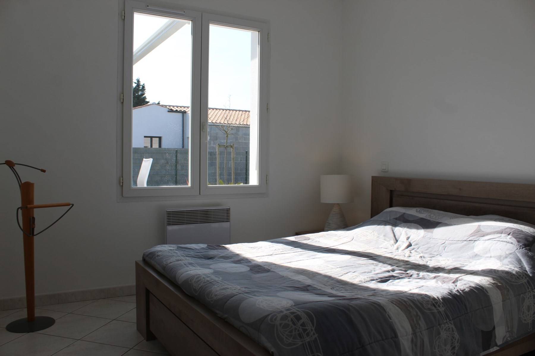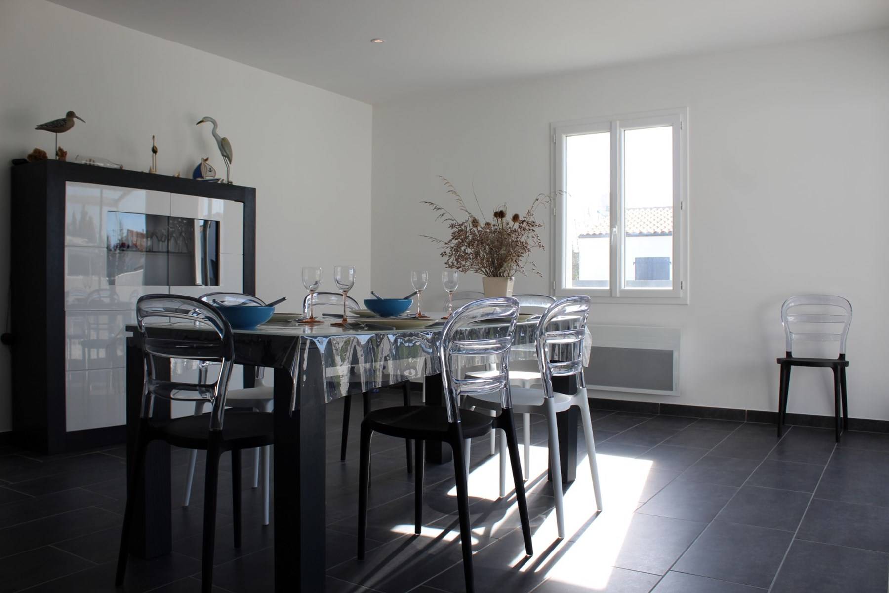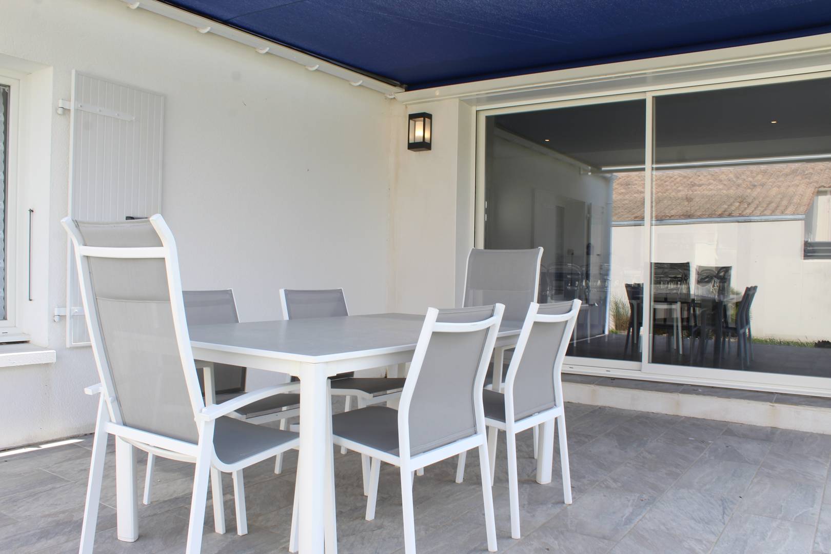 Saint Pierre d'Oléron (17) - Center of the island 4-room house - approx. 80 m² - up to 5 people On the outskirts of town, close to all amenities. Beautiful contemporary detached house, on vast enclosed grounds with plant beds, comprising: a dining room, a living room with a convertible sofa (for a possible additional bed), a pretty fitted kitchen, two bedrooms each with a double bed (140) and cupboards, a bathroom, a terrace, a garage for storage. Separate toilets. Living room opening onto a terrace covered by an electric pergola. Possibility to park on the property. The advantages of this rental by the sea: Modern and recent house at the end of a dead end. Close to shops. In the center of the island to visit from North to South. Cleaning with disinfection included.