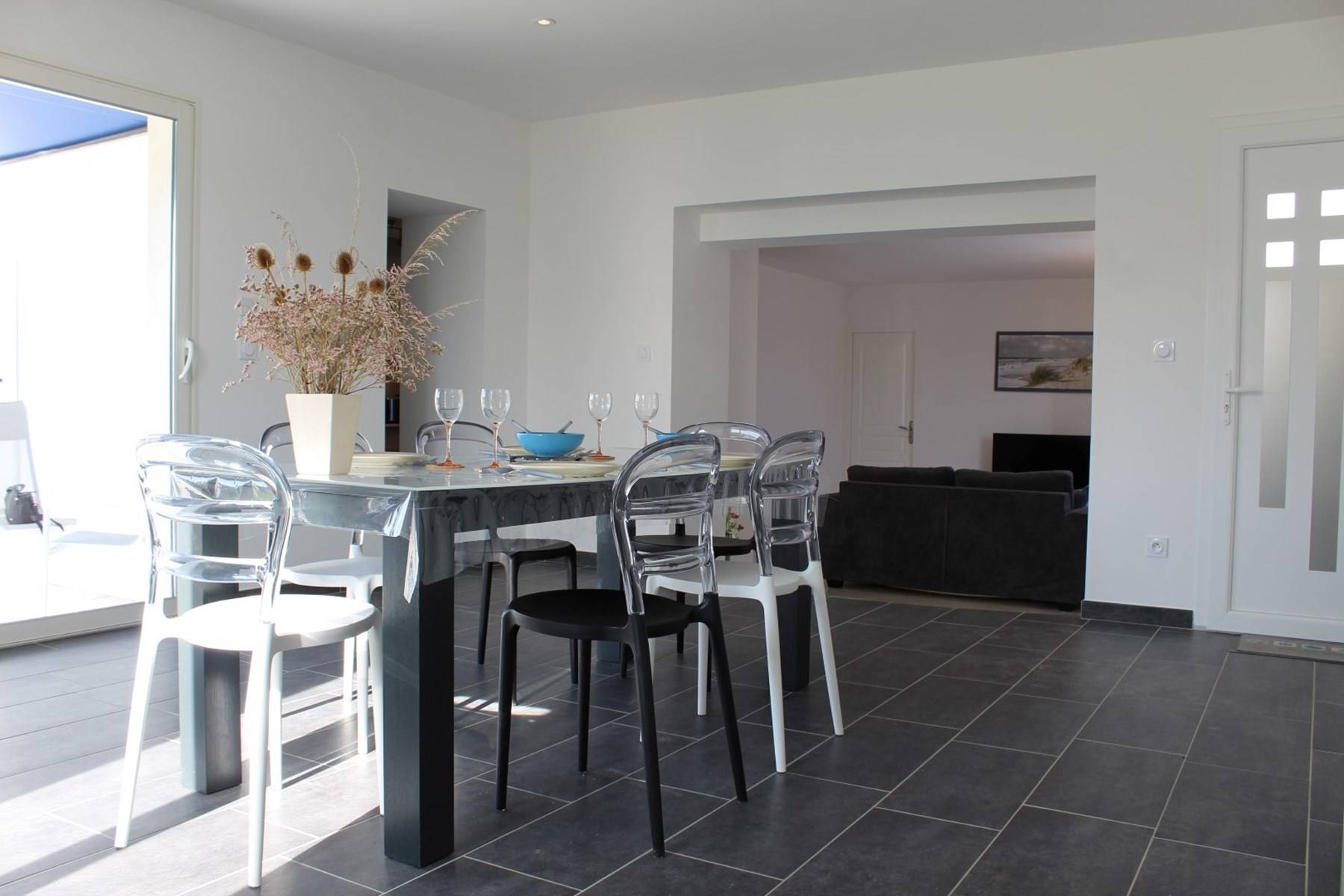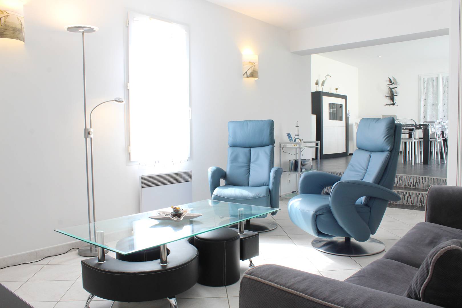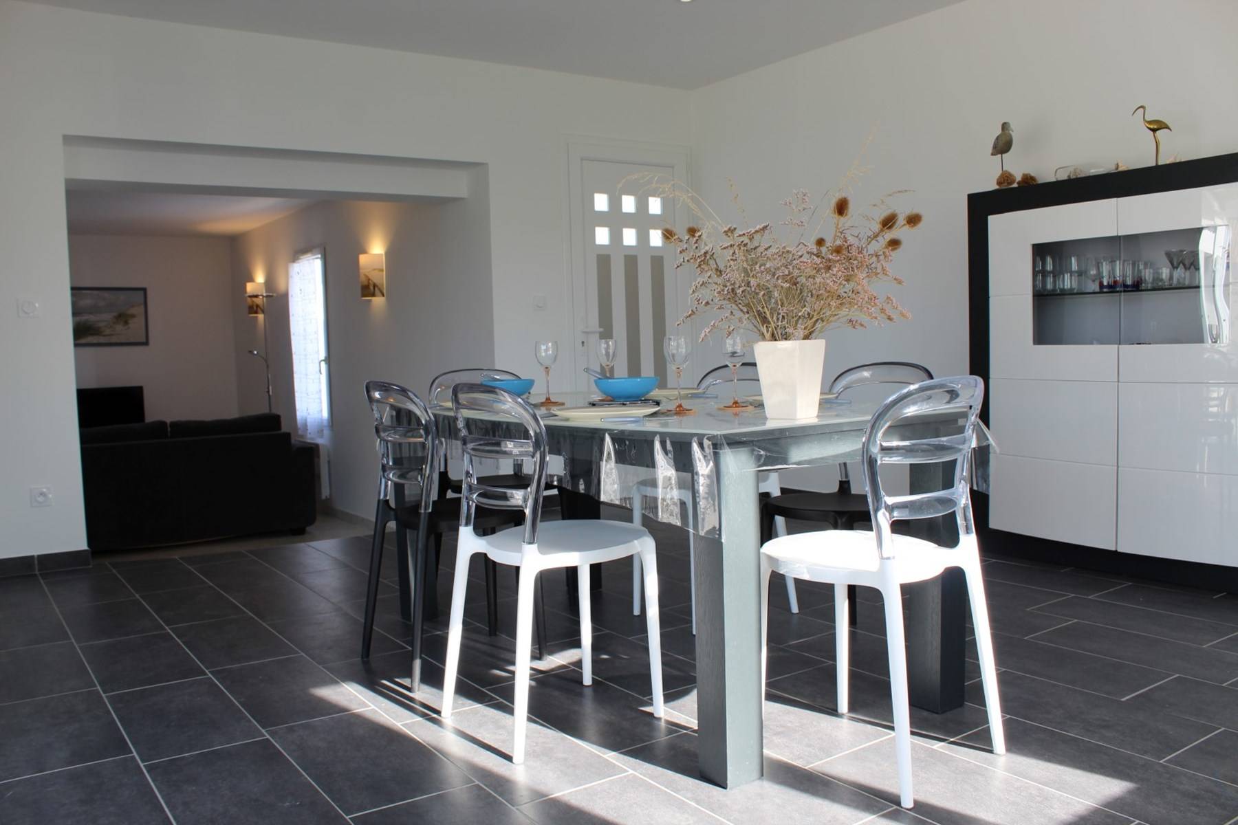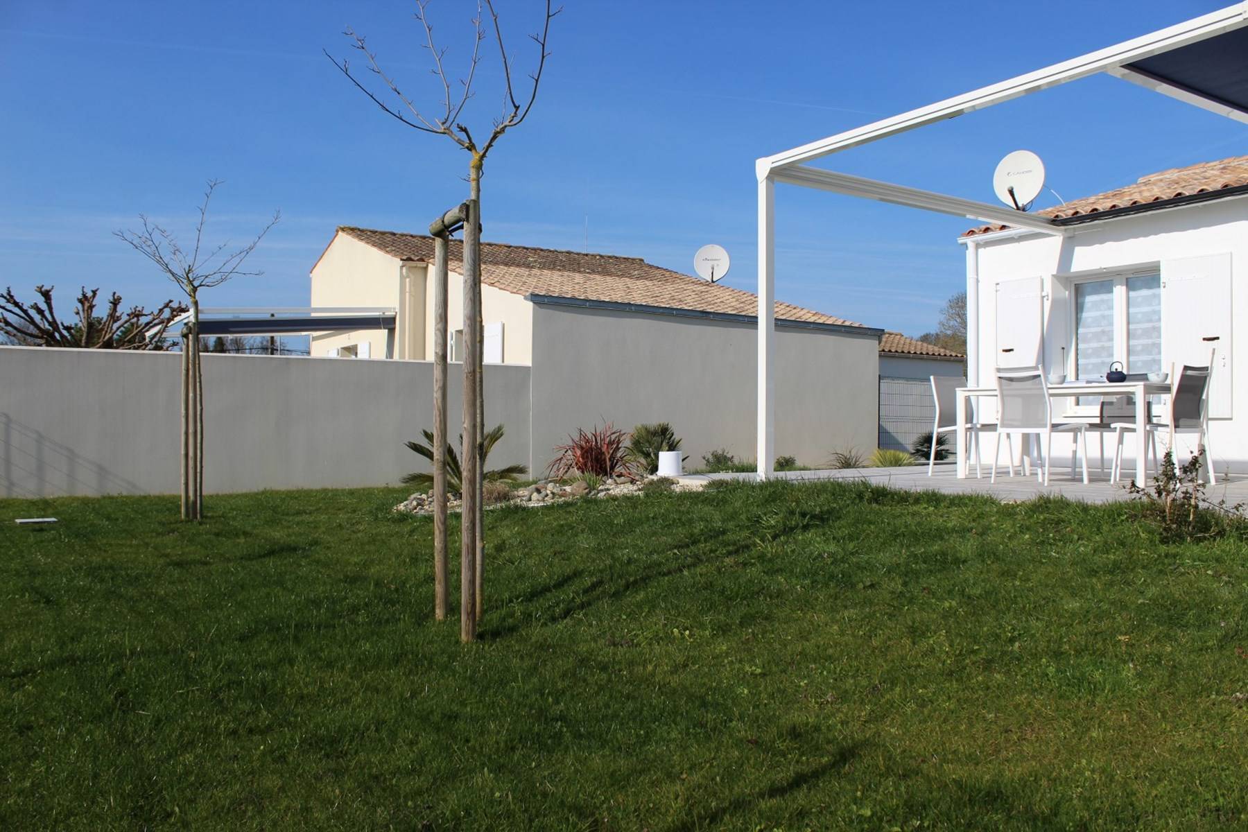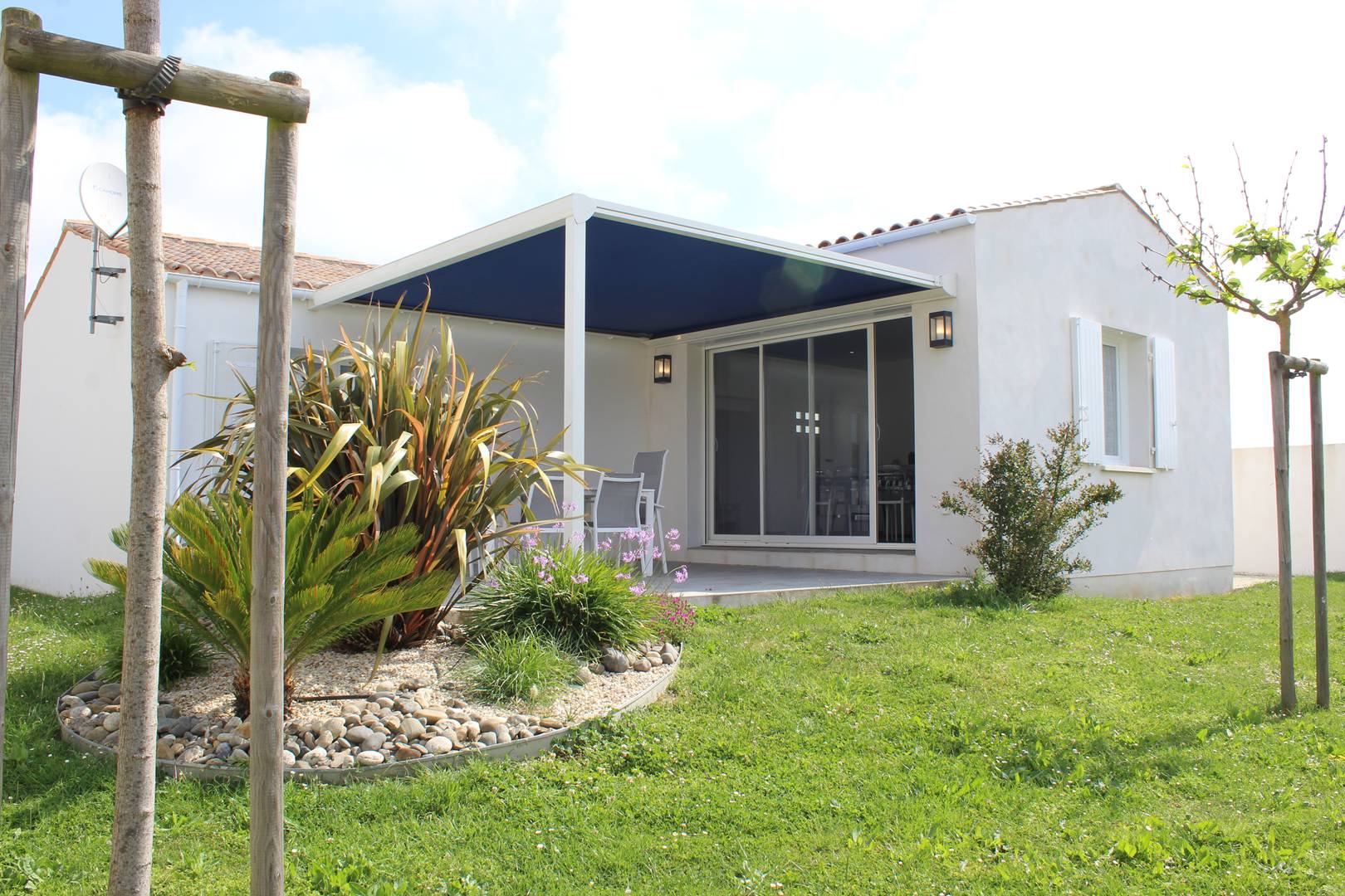 Saint Pierre d'Oléron (17) - Center of the island 4-room house - approx. 80 m² - up to 5 people On the outskirts of town, close to all amenities. Beautiful contemporary detached house, on vast enclosed grounds with plant beds, comprising: a dining room, a living room with a convertible sofa (for a possible additional bed), a pretty fitted kitchen, two bedrooms each with a double bed (140) and cupboards, a bathroom, a terrace, a garage for storage. Separate toilets. Living room opening onto a terrace covered by an electric pergola. Possibility to park on the property. The advantages of this rental by the sea: Modern and recent house at the end of a dead end. Close to shops. In the center of the island to visit from North to South. Cleaning with disinfection included.
