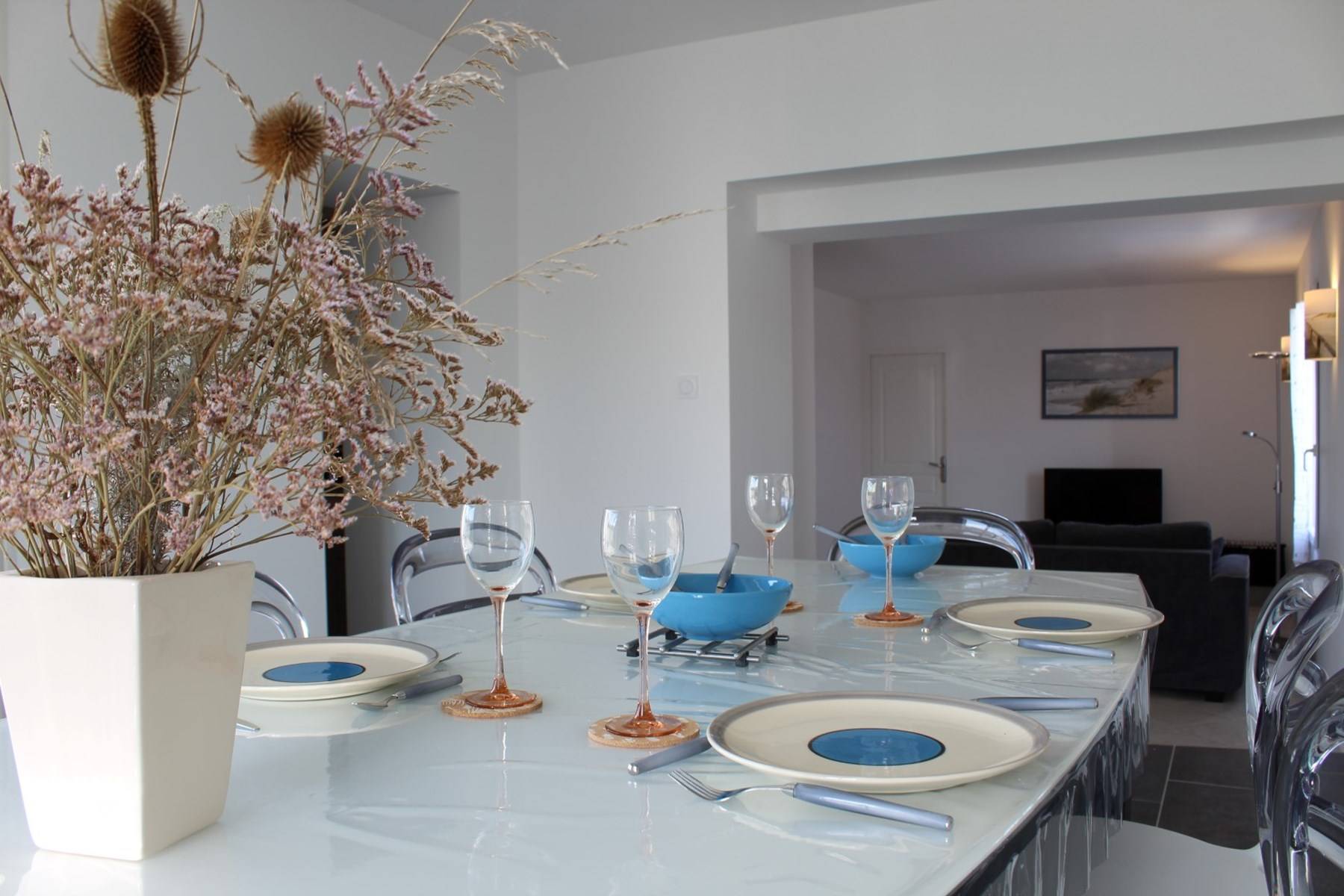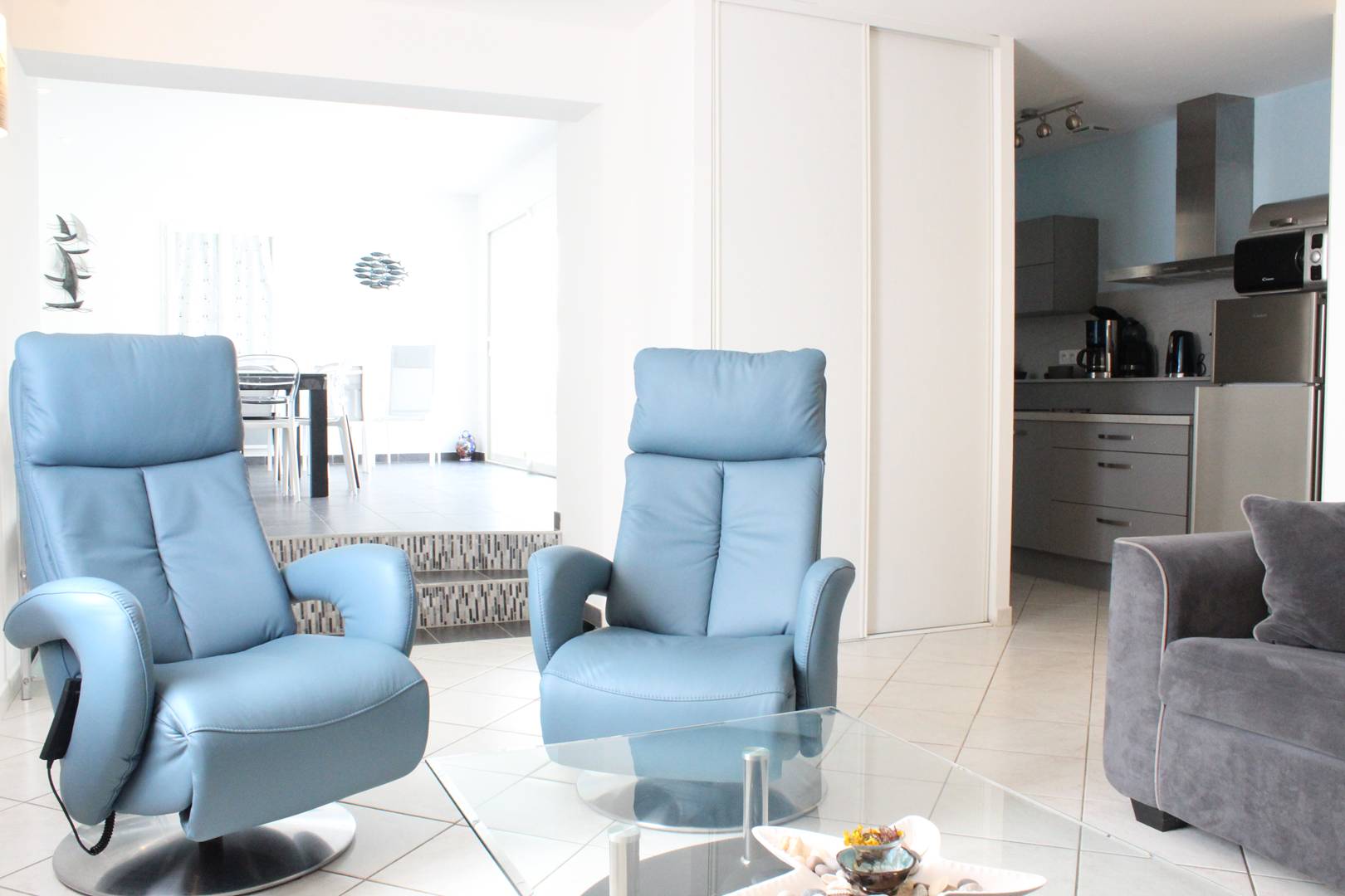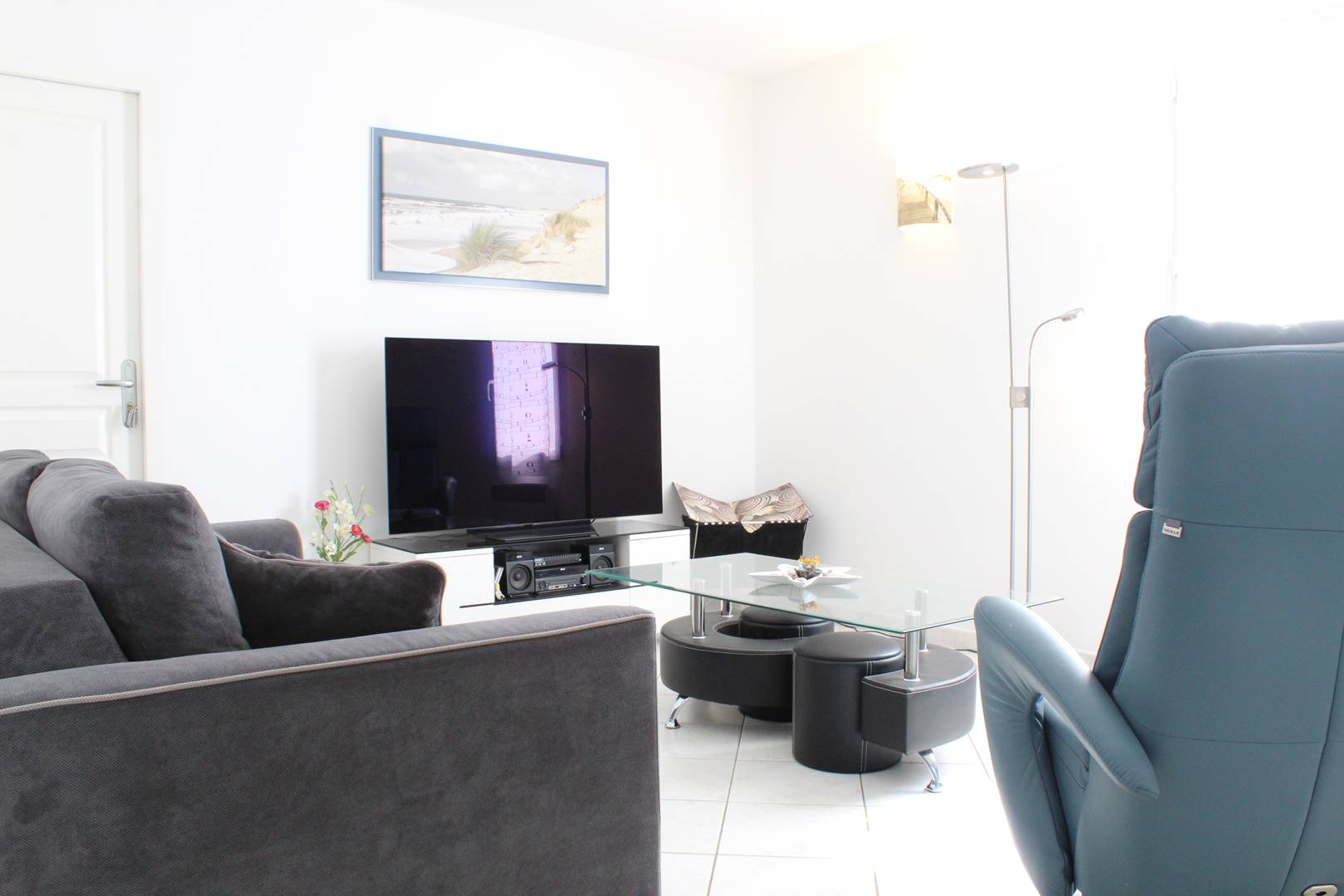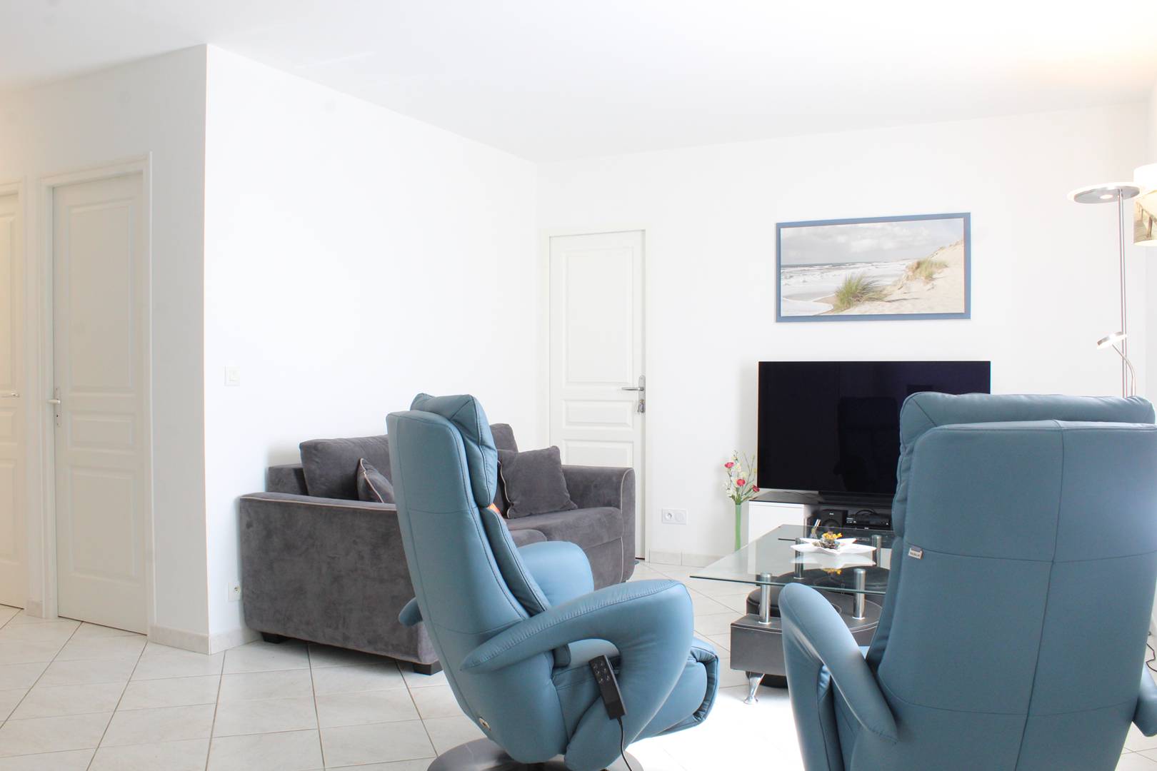 Saint Pierre d'Oléron (17) - Center of the island 4-room house - approx. 80 m² - up to 5 people On the outskirts of town, close to all amenities. Beautiful contemporary detached house, on vast enclosed grounds with plant beds, comprising: a dining room, a living room with a convertible sofa (for a possible additional bed), a pretty fitted kitchen, two bedrooms each with a double bed (140) and cupboards, a bathroom, a terrace, a garage for storage. Separate toilets. Living room opening onto a terrace covered by an electric pergola. Possibility to park on the property. The advantages of this rental by the sea: Modern and recent house at the end of a dead end. Close to shops. In the center of the island to visit from North to South. Cleaning with disinfection included.