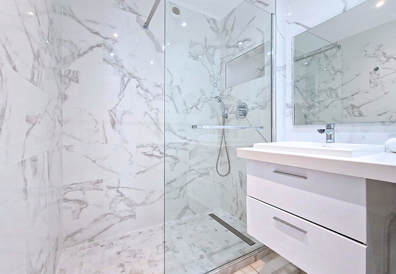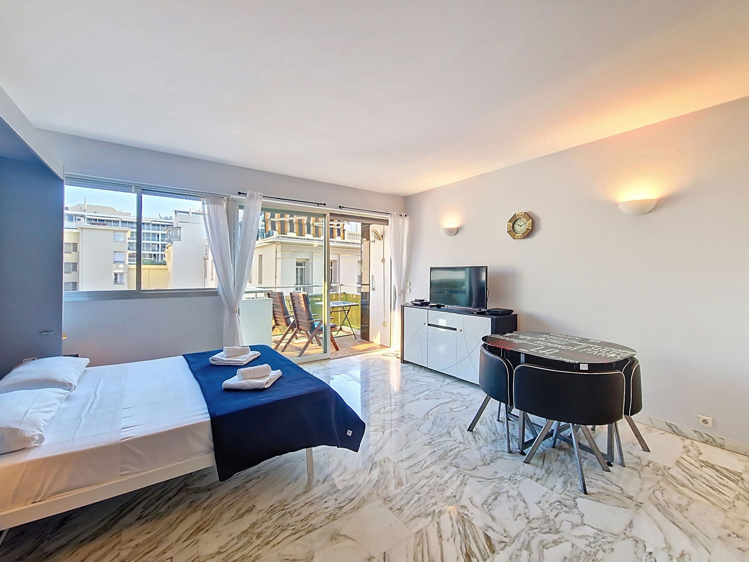 The studio has a sober and elegant decoration. The white walls and the marble floor give a sleek appearance and accentuate the already omnipresent luminosity in the apartment. The few black pieces of furniture underline the lines with refinement.