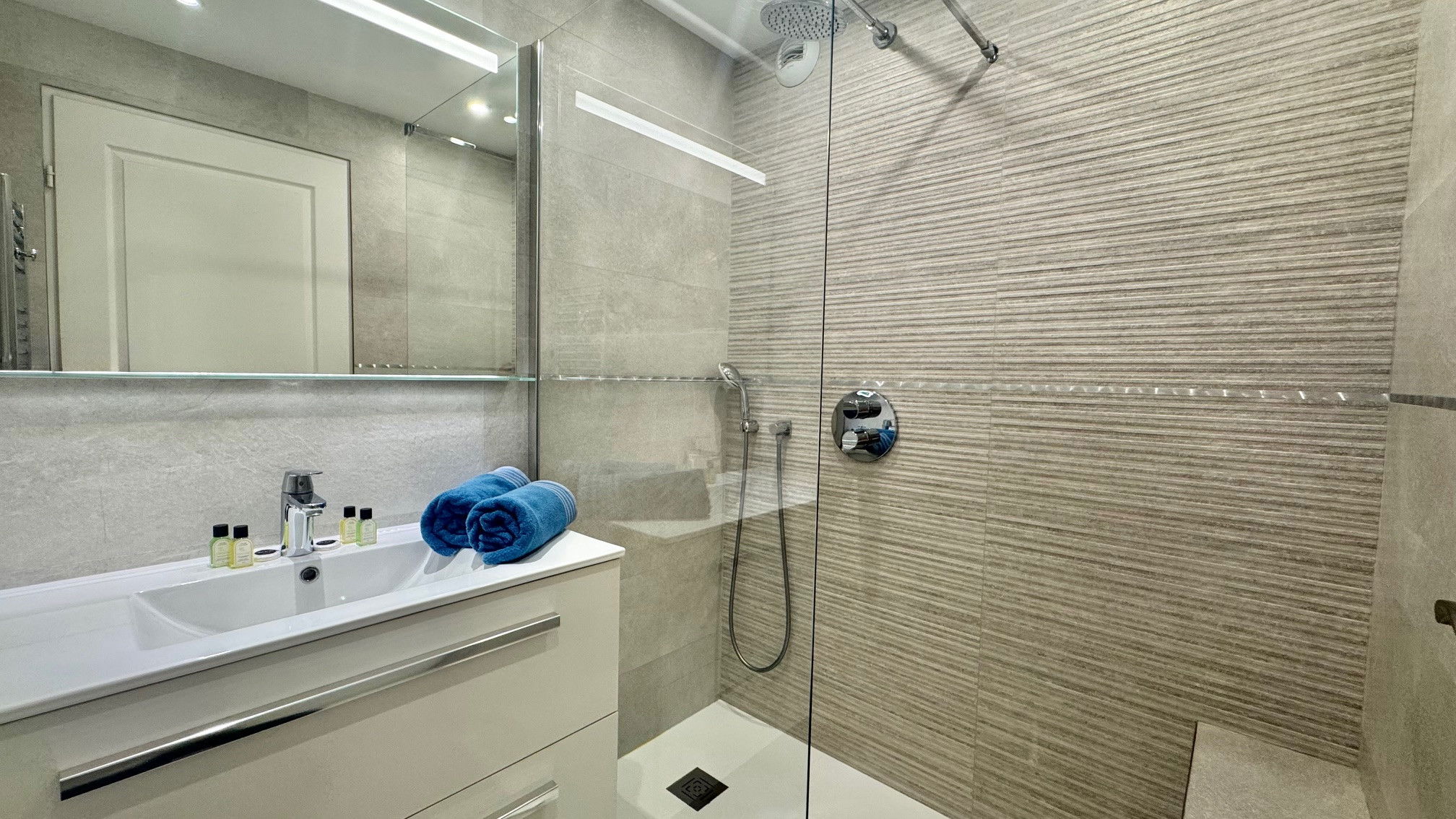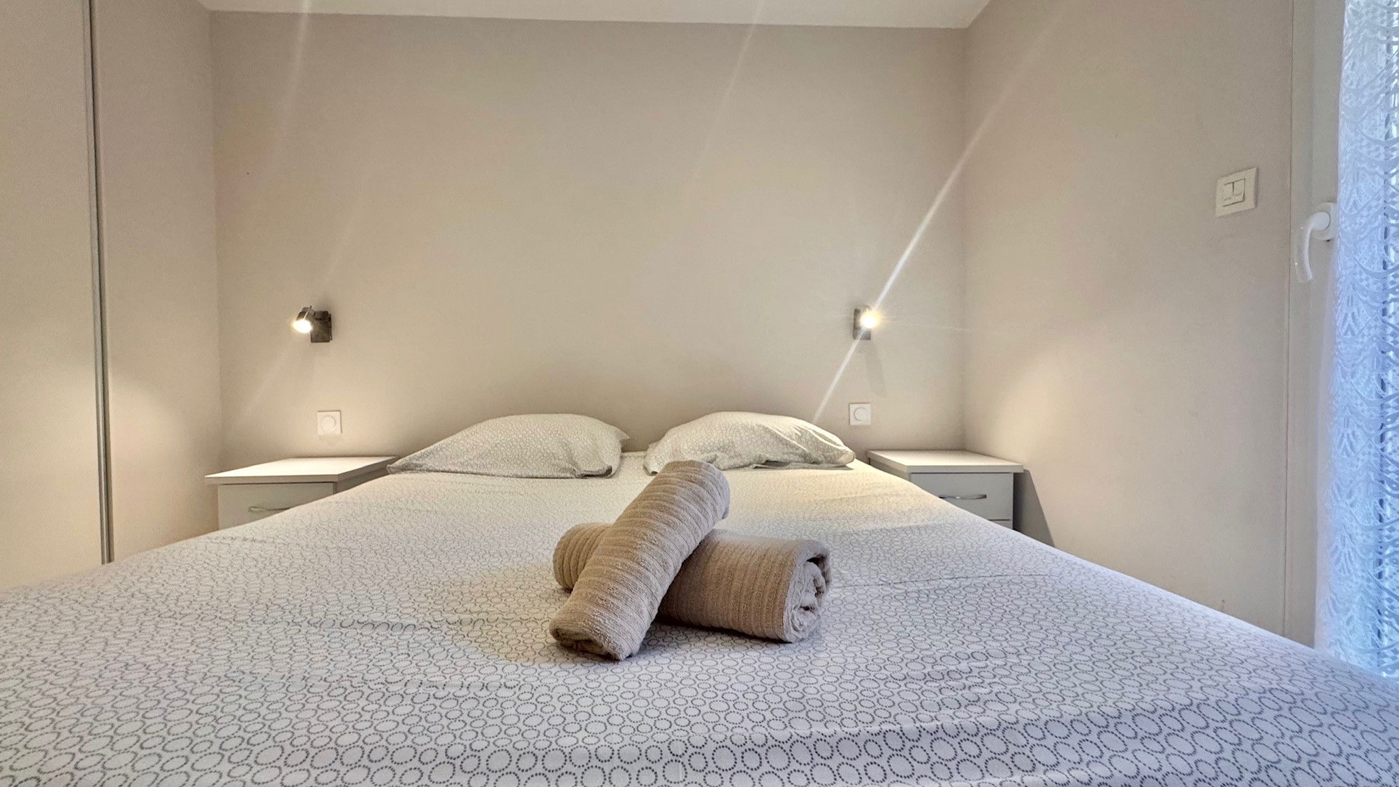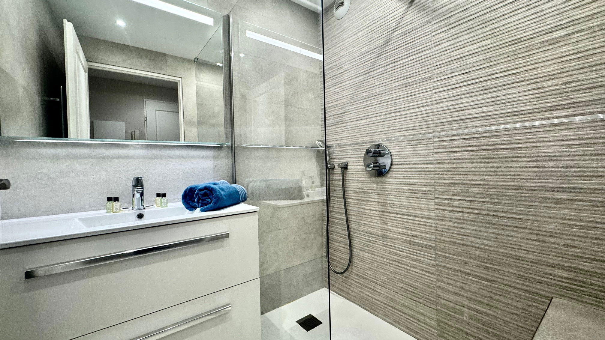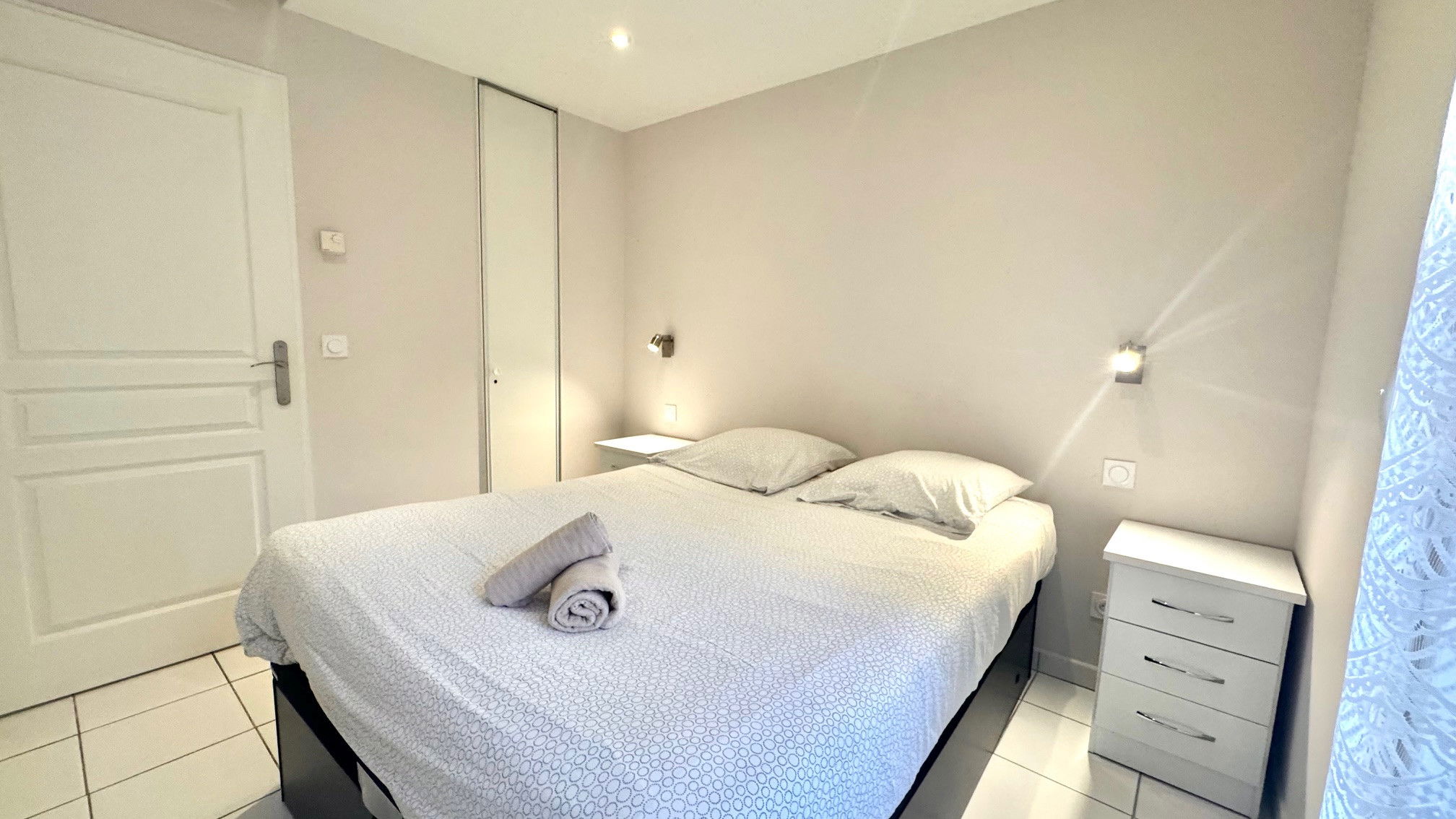 One bedroom with wardrobe and double bed. A bathroom with walk-in shower, 1 independent toilet